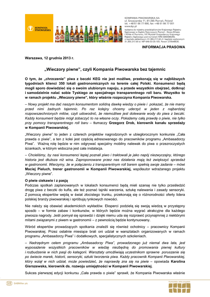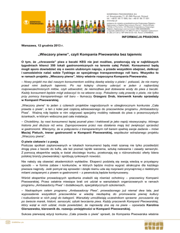 INFORMACJA PRASOWA Warszawa, 12 grudnia 2013 r. „Wieczory piwne”, czyli Kompania Piwowarska bez tajemnic O tym, że „chrzczenie” piwa z beczki KEG nie jest możliwe, przekonają się w najbliższych tygodniach klienci 350 lokali gastronomicznych na terenie całej Polski. Konsumenci będą mogli sporo dowiedzieć się o swoim ulubionym napoju, a przede wszystkim obejrzeć, dotknąć i samodzielnie nalać sobie Tyskiego ze specjalnego transparentnego roll baru. Wszystko to w ramach projektu „Wieczory piwne”, który właśnie rozpoczyna Kompania Piwowarska. – Nowy projekt ma dać naszym konsumentom solidną dawkę wiedzy o piwie i pokazać, że nie mamy przed nimi żadnych tajemnic. Po raz kolejny chcemy uderzyć w jeden z najbardziej rozpowszechnionych mitów, czyli udowodnić, że niemożliwe jest dolewanie wody do piwa z beczki. Każdy konsument będzie mógł zobaczyć to na własne oczy. Pokażemy całą prawdę o piwie, nie tylko przy pomocy transparentnego roll baru – tłumaczy Grzegorz Drob, kierownik kanału sprzedaży w Kompanii Piwowarskiej. „Wieczory piwne” to jeden z czterech projektów nagrodzonych w ubiegłorocznym konkursie „Cała prawda o piwie”, a ten z kolei jest częścią adresowanego do pracowników programu „Ambasadorzy Piwa”. Ważną rolę będzie w nim odgrywać specjalny mobilny nalewak do piwa o przezroczystych ściankach, w którym widoczna jest cała instalacja. – Chcieliśmy, by nasi konsumenci lepiej poznali piwo i traktowali je jako napój niezwyczajny, którego historia jest dłuższa niż wina. Zaproponowane przez nas działania mają też zwiększyć sprzedaż w gastronomii. Wierzymy, że w połączeniu z transparentnym roll barem spełnią swoje zadanie – mówi Maciej Pieluch, trener gastronomii w Kompanii Piwowarskiej, współautor wdrażanego projektu „Wieczory piwne”. O piwie ciekawie i z pasją Podczas spotkań zaplanowanych w lokalach konsumenci będą mieli szansę nie tylko prześledzić drogę piwa z beczki do kufla, ale też poznać tajniki warzenia, sztukę nalewania i zasady sensoryki. Z pomocą ekspertów wejdą w świat złocistego trunku, przekonają się o różnorodności oferty lidera polskiej branży piwowarskiej i spróbują rynkowych nowości. Nie należy się obawiać akademickich wykładów. Eksperci podzielą się swoją wiedzą w przystępny sposób – w formie zabaw i konkursów, w których będzie można wygrać atrakcyjne dla każdego piwosza nagrody. Jeśli pomysł się sprawdzi i dzięki niemu uda się rozprawić przynajmniej z niektórymi mitami związanymi z piwem w gastronomii – z pewnością będzie kontynuowany. Wśród ekspertów prowadzących spotkania znaleźli się również ochotnicy – pracownicy Kompanii Piwowarskiej. Przez ostatnie miesiące brali oni udział w warsztatach organizowanych w ramach programu „Ambasadorzy Piwa” i dodatkowych, specjalistycznych szkoleniach. – Nadrzędnym celem programu „Ambasadorzy Piwa”, prowadzonego już niemal dwa lata, jest wyposażenie wszystkich pracowników w wiedzę niezbędną do promowania piwnej kultury i rozbudzenie w nich pasji do kategorii. Warsztaty umożliwiają uczestnikom sprawne poruszanie się po świecie marek, historii, sensoryki, sztuki tworzenia piwa. Każdy pracownik Kompanii Piwowarskiej, który wziął w nich udział, może powiedzieć, że naprawdę zna się na piwie – opowiada Karolina Gierszewska, kierownik ds. rozwoju umiejętności w Kompanii Piwowarskiej. Sukces pierwszej edycji konkursu „Cała prawda o piwie” sprawił, że Kompania Piwowarska właśnie ogłosiła jego drugą odsłonę. Już wkrótce 35 transparentnych roll barów zawita do 350 lokali na terenie całej Polski, a tymczasem pracownicy Kompanii Piwowarskiej będą mogli znów zaproponować autorskie rozwiązania, które pomogą krzewić kulturę piwną i zwiększyć sprzedaż. Do redaktora: Kompania Piwowarska – Lider branży piwowarskiej w Polsce Kompania Piwowarska jest liderem rynku piwa w Polsce. Gwarancją najwyższej, niezmiennej jakości warzonego w browarach KP piwa jest zespół świetnych fachowców, kilkusetletnie doświadczenie oraz nowoczesne technologie. Do portfela marek KP należą najpopularniejsze polskie piwa – m.in. Tyskie, Żubr, Lech, Dębowe Mocne, Redd's, a także międzynarodowe marki premium: Pilsner Urquell, Grolsch, Peroni Nastro Azzurro oraz specjalności, jak warzone według tradycyjnych receptur Tyskie Klasyczne czy kolekcja Książęcego. Wielbicielom piwa niepasteryzowanego w wybranych lokalach firma oferuje też piwo prosto z browaru, czyli Tyskie z tanka. Nowością w portfelu KP od 2013 roku jest cydr – Green Mill Cider – napój produkowany ze 100% soku jabłkowego. Kompania Piwowarska (utworzona w 1999 roku) posiada trzy browary (w Tychach, Poznaniu i Białymstoku) oraz oddziały handlowe na terenie całego kraju. KP od lat jest jednym z czołowych sponsorów sportu, prowadzi także działalność społeczną oraz programy edukacyjne popularyzujące odpowiedzialność i umiar w konsumowaniu alkoholu. Wielkość sprzedaży osiągniętej przez KP w roku finansowym zakończonym 31 marca 2013 r. wyniosła 14,5 mln hektolitrów piwa. Kompania Piwowarska jest częścią międzynarodowej grupy piwowarskiej SABMiller. SABMiller – jeden z największych na świecie producentów piwa Kompania Piwowarska jest częścią jednego z największych na świecie producentów piwa – SABMiller plc. Grupa produkuje lub dystrybuuje piwo na sześciu kontynentach, a jej ogólnoświatowy portfel obejmuje międzynarodowe piwa premium, takie jak Grolsch, Miller Genuine Draft, Peroni Nastro Azzurro czy Pilsner Urquell oraz czołowe marki lokalne, takie jak Aquila, Castle, Miller Lite, Snow czy Tyskie. SABMiller jest jedną z największych na świecie (poza USA) firm rozlewających produkty CocaColi. W roku finansowym zakończonym 31 marca 2013 SABMiller osiągnął przychody w wysokości 34,5 mld USD oraz wypracowa