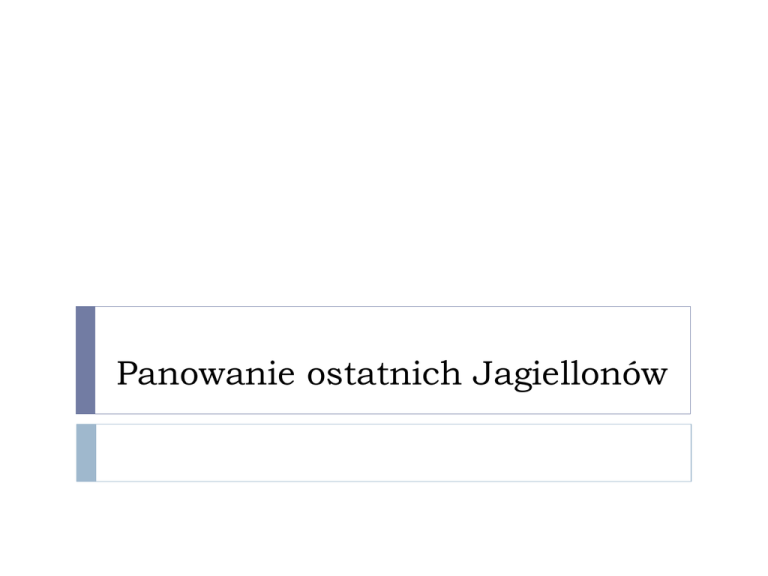 Panowanie ostatnich Jagiellonów 1. Wojny na wschodzie Wielkie Księstwo Moskiewskie za panowania Iwana III Srogiego w 1492 r. atakuje litewską Wiaźmę i tereny nad Oką 1500 r. Księstwo wchodzi w granice RP 1503 rozejm: Moskwa otrzymuje ziemię czernihowską, siewierską i cz. smoleńskiej Od 1507 r. ponownie wojna Do gry weszli też Tatarzy, którzy nad Morzem Czarnym mięli swój chanat krymski 1514 r. Moskwa zajęła Smoleńsk i mimo zwycięstwa Zygmunta Starego nad wojskami moskiewskimi pod Orszą rozejm z 1522 r. nic nie zmienia Ponowna próba odzyskania ziem w 1534 r., ale rozejm w 1537 i znów status quo 2. Stosunki z Habsburgami i polityka węgierska Jagiellonowie i Habsburgowie rywalizują o tron czeski i węgierski Cesarz Maksymilian I zawiera z Moskwą w 1514 r. antypolski sojusz By poprawić te relacje w Wiedniu w 1515 doszło do spotkania cesarza Maksymiliana I z Władysławem Jagiellończykiem i Zygmuntem Starym Postanowienia zjazdu wiedeńskiego 1. Cesarz odstępuje od sojusz z Moskwą i zakonem krzyżackim 2. Cesarz popiera krucjatę przeciw Turkom 3. Kwestia sukcesji; jeśli wygaśnie linia Jagiellonów to tron czeski i węgierski przypadnie w ręce Habsburgów Niestety, 1526 r. w bitwie pod Mohaczem ginie Ludwik Jagiellończyk i koniec panowania Jagiellonów na Węgrzech i w Czechach Żona Zygmunta Starego Bona Sforza popierała politykę antyhabsburską (ślub córki Izabeli z Janem Zapolyą) Zygmunt August był już prohabsburski; zawarł przymierze z Habsburgami, przy okazji w 1553r. żeniąc się z Katarzyna Habsburżanką 3. Wojna o Mołdawię Mołdawia od XIV w. jest lennie zależna od Polski Ważny szlak handlowy Morze Bałtyckie via Morze Czarne Polska, Węgry i Imperium Osmańskie chcą włączenia Mołdawii do siebie Hospodar mołdawski Stefan Wielki w XV w. umiał powstrzymywać zakusy tych państw W 1497 r. król Jan Olbracht wyruszył na Mołdawię – klęska 1499 r. sojusz z Mołdawią i Węgrami przeciw Turcji; ale w 1502 r. Stefan Wielki zajął polskie Pokucie W 1530 r. znów opanowanie Pokucia przez hospodara, ale w 1531 r. pod Obertynem dostał baty od hetmana Jana Tarnowskiego Ostatecznie w 1538 r. Pokucie wraca do Polski 4. Relacje z państwem tureckim Od XVI w. Turcy i Tatarzy (poddani tureccy) regularni atakowali ziemie polskie Granicę południowo-wschodnią broniło stale ok. 3000 żołnierzy (obrona potoczna) Z powodu zagrożenia tureckiego powstało na granicy wiele zamków (Kamieniec Podolski, Zbaraż, Bar, Bracław) Udało się zawrzeć w 1533 r. pokój wieczysty z Turcją 5. Hołd pruski 1525 Prusy Zakonne dążą do zrzucenia zależności lennej od Polski Albrecht Hohenzollern – nowy mistrz, łączy się w sojusz antypolski z Moskwą, Brandenburgią, Cesarstwem 1519-1521 wojna z Zakonem zakończone rozejmem Reformacja zmienia nastawienie do życia Hohenzollerna 1525 r. na rynku w Krakowie hołd pruski 1. Albrecht Hohenzollern uznał się wasalem króla polskiego 2. W razie wygaśnięcia dynastii Hohenzollernów Prusy wracają do Polski 3. A.Hohenzollern rządzi w dawnym zakonie krzyżackich, od teraz Księstwie Pruskim, występującym jako Prusy Książęce 4. Książę pruski siedzi w polskim senacie 5. W razie potrzeby służy zbrojnie królowi Polski 6. Król Polski może rozstrzygać spory między księsiuniem a poddanymi 7. Prusy i Brandenburgia nie mogą się ze sobą łączyć 6. Przyłączenie Mazowsza do Korony Do XIV w. Mazowsze niezależne od Polski Kazimierz Jagiellończyk i Jan Olbracht po kawałku przyłączali, ale nadal część z Warszawą jest poza Polską Na szczęście umarli bezpotomnie, więc 1524, 1526 Zygmunt Stary włączył ziemie braci mazowieckich (Stanisława i Janusza III) do Korony Mazowsze zachowało elementy niezależności, a od XVI Warszawa stała się stolicą RP 7. Walka o wpływy nad Bałtykiem i Inflanty Dania i Szwecja są nad Bałtykiem – wniosek – przydałaby się im dobra flota wojenna Dania kontroluje handel a Szwecja zazdrosnym okiem zerka na wschodnie wybrzeże Bałtyku (tutaj interesy mają Polacy i Moskale) Polska i Moskwa chcą kontrolować te tereny a zwłaszcza porty w Narwie, Rydze i Parnawie Na Inflantach jest sobie inflancka gałąź zakonu krzyżackiego (zupełnie bezsensu, bo od 1525 r. zakonu krzyżackiego już nie ma) Moskwa ma ochotę wziąć „pod opiekę” ten zakon, by handlować z zachodnią Europą Mimo zobowiązania do niezawierania z królem Polski sojuszu (1554r.), w 1557 r. Polacy przymuszają wielkiego mistrza do podpisania sojuszu przeciw Moskwie I wojna północna 1558 r. Iwan IV Groźny atakuje zakonników i zajmuje tereny z Dorpatem i Narwą 1561 r. wielki master Gotthard Kettler w Wilnie składa hołd lenny Zygmuntowi Augustowi 1. Kettler rządzi w Kurlandii i Semigalii 2. Może wprowadzić w kraju luteranizm Dominium Maris Baltici Od tej pory każdy coś chce zająć By zwalczać handel narewski (prowadzony z porty w Narwi przez rosjan) Zygmunt August buduje flotę kaperską (złożoną z żeglarzy walczących w zamian za łupy) 1568 r. król powołał Komisję Morską, która kierowała działaniami i rozbudowaniem floty Gdańsk niezadowolony, bo traci na handlu, ale musi zgodzić się na tzw. Statury Karnkowskiego regulujące kwestie handlu morskiego Na początku Polska w sojusz z Danią przeciw Szwecji i Moskwy, ale od 1568 r. Polska i Szwecja vs Dania i Moskwa 1570 r. pokój w Szczecinie 1. Część Inflant dostaje Polska 2. Moskwa ma m.in. Narwę i Dorpat Zygmunt August prosi o pomoc lennika z Prus Książęcych Ale nic za darmo; 1563r. zgoda królewska na przeniesienie praw do lenna na brandenburską linię Hohenzollernów