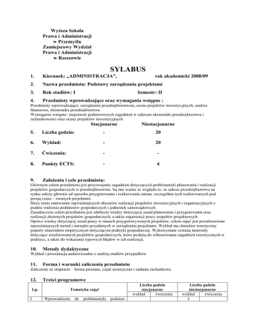 WyŜsza Szkoła Prawa i Administracji w Przemyślu Zamiejscowy Wydział Prawa i Administracji w Rzeszowie SYLABUS 1. Kierunek: „ADMINISTRACJA”, rok akademicki 2008/09 2. Nazwa przedmiotu: Podstawy zarządzania projektami 3. Rok studiów: I 4. Przedmioty wprowadzające oraz wymagania wstępne : Semestr: II Przedmioty wprowadzające: zarządzanie przedsiębiorstwem, ocena projektów inwestycyjnych, analiza finansowa, ekonomika przedsiębiorstwa. Wymagania wstępne: znajomość podstawowych zagadnień w zakresie ekonomiki przedsiębiorstwa i rachunkowości oraz oceny projektów inwestycyjnych Stacjonarne Niestacjonarne 5. Liczba godzin: - 20 6. Wykład: - 20 7. Ćwiczenia: - - 8. Punkty ECTS: - 4 9. ZałoŜenia i cele przedmiotu: Głównym celem przedmiotu jest przyswojenie zagadnień dotyczących problematyki planowania i realizacji projektów gospodarczych w przedsiębiorstwie. Są one waŜne ze względu to, Ŝe sukces przedsiębiorstwa na rynku zaleŜy głównie od sposobu przygotowania i realizowania zmian, szczególnie tych realizowanych pod presją czasu – zwanych projektami. SłuŜy temu omówienie najwaŜniejszych obszarów realizacji projektów inwestycyjnych i organizacyjnych z punktu widzenia podmiotów gospodarczych i jednostek samorządowych. Zasadniczym celem przedmiotu jest zdobycie wiedzy dotyczącej zasad planowania i przygotowania oraz realizacji złoŜonych projektów gospodarczych, a takŜe organizacji pracy zespołów projektowych. Oprócz wiedzy dotyczącej zasad pracy w ramach przygotowywanych projektów, celem zajęć jest przedstawienie najwaŜniejszych metod i narzędzi przydatnych w zarządzaniu projektami. Wykład ma charakter teoretyczny poparty materiałem empirycznym dotyczącym praktyki gospodarczej. Wykorzystane zostaną materiały dotyczące zrealizowanych projektów gospodarczych, które posłuŜą do zobrazowania zagadnień teoretycznych w praktyce, a takŜe do wskazania typowych błędów w ich realizacji. 10. Metody dydaktyczne Wykład i prezentacja audiowizualna z analizą studiów przypadków 11. Forma i warunki zaliczenia przedmiotu Zaliczenie ze stopniem – forma pisemna, część teoretyczna i zadania rachunkowe. 12. Lp. I Treści programowe Liczba godzin stacjonarne wykład ćwiczenia Tematyka zajęć Wprowadzenie do problematyki podstaw Liczba godzin niestacjonarne wykład ćwiczenia 2 II III IV V VI zarządzania projektami gospodarczymi. Klasyfikacja projektów. Definicje zarządzania projektami. Historia zarządzania projektami, Cechy projektu. Obszary zaangaŜowania i cele zarządzania projektami w przedsiębiorstwie. Podstawowe problemy ekonomiczne (obszary zainteresowania) zarządzania projektami. Obszary wiedzy w zakresie zarządzania projektami -PMBOK (Project Management Body of Knowledge) Szczegółowa charakterystyka projektu. Sposób definiowania celów w projekcie. Fazy realizacji projektu – definiowanie, planowanie, wdroŜenie zamknięcie i ocena. Planowanie zasobów do realizacji projektu: zasoby ludzkie, zasoby finansowe, wyposaŜenie. Tworzenie zespołów projektowych. Charakterystyka faz pracy zespołów projektowych i zasad komunikowania się. Organizacja pracy zespołów projektowych. Techniki organizatorskie w zarządzaniu projektami. Zasady konstruowania i wykorzystania diagramów sieciowych w planowaniu projektów gospodarczych. Wyznaczenie i analiza ścieŜki krytycznej projektu – metoda CPM (Critical Path Method). Wykorzystanie schematów Gantta do monitorowania postępów pracy w ramach projektu. Specyfika zarządzania zasobami finansowymi projektu. Tworzenie budŜetu projektu i systemy kalkulacji kosztów. Wyodrębnianie budŜetu projektu w budŜecie przedsiębiorstwa. Klasyfikacja i zarządzanie kosztami projektów. Koszty stałe i zmienne, zaleŜne i niezaleŜne, krótko i długookresowe. Progi rentowności i marginesy bezpieczeństwa oraz ich wykorzystanie do zarządzania projektami. System kalkulacji, rachunek kosztów i ich wpływ na przygotowanie i realizację projektów w przedsiębiorstwie. Planowanie i analiza finansowa projektu. Planowanie nakładów i efektów projektu. Planowanie przepływów środków pienięŜnych w projekcie. Planowanie zapotrzebowania na inwestycje i majątek obrotowy. Wykorzystanie stopy dyskontowej w analizie finansowej projektu inwestycyjnego. Klasyfikacja metod oceny efektywności finansowej projektów inwestycyjnych Cele i zadania działalności inwestycyjnej przedsiębiorstwa. Rodzaje przedsięwzięć inwestycyjnych w przedsiębiorstwie. Zasady planowani, organizacji, realizacji i kontroli projektów inwestycyjnych w przedsiębiorstwie – zarządzanie projektem. Metody oceny efektywności przedsięwzięć inwestycyjnych. 4 2 4 4 4 2 Metody NPV i IRR jako podstawowe narzędzia oceny efektywności projektów inwestycyjnych i ich praktyczne wykorzystanie. Analiza ryzyka projektów inwestycyjnych. Metody symulacyjne w ocenie ryzyka macierz ryzyka. Wykorzystanie metod progów rentowności, marginesów bezpieczeństwa i analizy wraŜliwości do oceny ryzyka projektów inwestycyjnych. Studium przypadku: realizacja inwestycji w zakresie uruchomienia nowej produkcji w przedsiębiorstwie, inwestycja kapitałowa związana z nabyciem większościowego pakietu akcji; realizacja nowego projektu inwestycyjnego w zagranicznym podmiocie gospodarczym. 13. Literatura podstawowa Trocki, Ogonek, Grusza "Zarządzanie projektami", PWE, Warszawa 2001, Mingus N., "Zarządzanie projektami", One Press, Warszawa 2002, Roszkowski H., Wiatrak A., "Zarządzanie projektami istota, procedury i ich zastosowanie", Wydawnictwo SGGW, Warszawa 2006. Trocki, Grucza, "Zarządzanie projektem europejskim", PWE, Warszawa 2007. Brandenburg H.: Zarządzanie projektami, Wyd. AE w Katowicach, Katowice 2002. 14. Literatura uzupełniająca Kirschbaum D.M.: „Calculated Risk; Good Surprise, Bad Surprise: The Law of Unintended Consequences”, Community Risk Management and Insurance, Washington 2000 Łopaciński T.: „N
