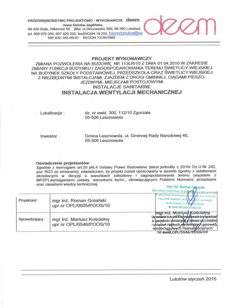 OBLICZENIA do projektu wentylacji mechanicznej dla proj. zmiany funkcji budynku i zagospodarowania terenu Świetlicy Wiejskiej na Budynek Szkoły Podstawowej, Przedszkola oraz Świetlicy Wiejskiej z niezbędnymi instalacjami (dz. nr ewid. 300, Zgorzała) Spis treści : 1. Obliczenia 2. Obliczenie mocy urządzeń 3. Dobór urządzeń 4. Zestawienie ilości powietrza wentylującego 1 I. OBLICZENIA 1. Świetlica(0.30) (Centrala nawiewno-wywiewna nr 1) 1.1. Dane wyjściowe: - liczba osób: n = 60 - kubatura sali: Vpom = 579 m3 - ilość powietrza świeżego na jedną osobę: l = 30 m3/h - temperatura powietrza zewnętrznego lato: tz(oc) = 30oC - temperatura powietrza zewnętrznego zima: tz(oz) = -20°C - temperatura powietrza w pomieszczeniu lato: tp(oc) = tz(oc) + ∆t, ∆t = 5 oC – obliczeniowy przyrost temperatury w pomieszczeniu, tp(oc) = 35oC 1.2. Bilans zysków ciepła w pomieszczeniu w okresie ciepłym LIPEC czas jednostki tz °C tp °C SW I c W/m2 b QPP SW W 8 22,6 27,6 70 10 26,1 31,1 99 12 28,4 33,4 248 14 29,8 34,8 420 15 30,0 35,0 425 16 29,9 34,9 373 18 28,5 33,5 143 20 25,5 30,5 0 0,5 2478 2508 2201 844 0 79 69 39 0 413 584 1463 261 106 96 INEc b QPP NE W/m2 W 1540 625 566 513 466 407 230 0 qLj QLj W/os W 54 1620 35 2100 26 1560 22 1320 22 1320 22 1320 26 1560 38 2280 Qzbj(oc) W 3573 3310 3590 4311 4294 3928 2634 2280 8 20 25,0 48 10 23,0 28,0 97 12 25,0 30,0 348 14 25,9 30,9 494 15 26,0 31,0 460 16 25,6 30,6 347 18 23,3 28,3 11 20 20,5 25,5 0 0,5 2915 2714 2047 65 0 59 46 1 0 87 0,5 WRZESIEŃ czas jednostki tz °C tp °C SW I c W/m2 b QR SW W 283 572 2053 132 77 77 INEc b QR NE W/m2 W 779 454 454 401 348 271 6 0 qLj W/os 69 52 40 36 36 37 50 68 68 0,5 2 QLj W 2070 3120 2400 2160 2160 2220 3000 4080 Qzbj(oc) W 3132 4147 4908 5476 5222 4539 3071 4080 Maksymalne zyski ciepła występują we wrześniu o godzinie 1400, Qzbj(OC)=5476 W 1.3. Obliczenie ilości powietrza wentylującego Qzbj(oc) Vw = -------------ρ x Cp x ∆t Qzbj(OC) - maksymalne zyski ciepła dla okresu ciepłego, Qzbj(OC)=5,476 kW ρ - gęstość powietrza, ρ=1,2kg/m3, Cp - ciepło właściwe powietrza, Cp=1,005KJ/kgK, ∆t - różnica temperatur powietrza wentylującego i powietrza w pomieszczeniu, ∆t=5K (dla wentylacji ∆t = 3÷5K) 5,476 Vw = -------------------- = 0,908 m3/s = 3269 m3/h 1,2 x 1,005 x 5 1.4. Minimalna ilość powietrza wentylującego na podstawie przydziału higienicznego Vwmin = l x n l = 30 m3/h - ilość powietrza świeżego na osobę n = 60 Vwmin = 60 x 30 = 1800 m3/h 1.5. Przyjmuję strumień Vw = 3269 m3/h do dalszych obliczeń. 1.6. Obliczenie krotności wymian ψ = Vw / Vpom Vw - strumień powietrza wentylującego, Vw = 3269 m3/h Vpom - kubatura pomieszczenia, Vpom = 579 m3, ψ = 3269 / 579 = 5,6 h-1 1.7. Okres zimny dla świetlicy 1.7.1. Obliczenie temperatury powietrza nawiewanego w okresie zimnym Przyjmuję temperaturę powietrza nawiewanego tn(oz) = 20 oC, straty ciepła pomieszczenia pokrywa CO, nie uwzględniam zysków ciepła w pomieszczeniach w okresie zimowym. 3 1.7.2 Odzysk ciepła Sprawność odzysku ciepła (wymiennik krzyżowy): η = 59% (sprawność temperaturowa wymiennika) η = 46% (sprawność wymiennika przy obliczeniowej temperaturze zewnętrznej wg producenta centrali) tz(oz)' = tz(oz) - η x (tz(oz) - tw(oz)) tz(oz)' - temperatura powietrza zewnętrznego po odzysku tz(oz) - temperatura powietrza zewnętrznego w okresie zimnym, tz(oz)=-20oC tw(oz) - temperatura powietrza w pomieszczeniu w okresie zimnym, tw(oz)=20oC tzoz' = -20 - 0,46 x (-20 - 20) = - 1,6 oC 2. Klasy, pracownie, jadalnia, pom. socjalne, pok. nauczycielski oraz pomieszczenia administracji i logopedy (centrala nawiewno-wywiewna nr 2) 2.1. Ilość powietrza wentylującego dla klasy/pracowni: 2.1.1. Dane wyjściowe: - liczba osób : n = 26 (25 dzieci, 1 nauczyciel) 2.1.2. Ilość powietrza wentylującego dla klas/pracowni na podstawie przydziału higienicznego Vwmin = l x n l = 20 m3/h - ilość powietrza świeżego na jedno dziecko l = 30 m3/h - ilość powietrza świeżego na jedną osobę dorosłą n(dzieci) = 25 n(opiekun) = 1 Vwmin = 20 x 25 + 1 x 30 = 530 m3/h 2.1.3. Przyjmuję strumień nawiewany jako Vwmin dla pomieszczeń klas/pracowni. 2.1.4. Ilość powietrza nawiewanego i wywiewanego oraz krotność wymian dla pozostałych pomieszczeń przedstawiono w tabeli. 2.2. Okres zimny dla pomieszczeń Przedszkola 2.2.1. Obliczenie temperatury powietrza nawiewanego w okresie zimnym Przyjmuję temperaturę powietrza nawiewanego tn(oz) = 20 oC, straty ciepła pomieszczeń pokrywa CO, nie uwzględniam zysków ciepła w pomieszczeniach w okresie zimowym. 4 2.2.2 Odzysk ciepła Sprawność odzysku ciepła (wymiennik krzyżowy): η = 56% (sprawność temperaturowa wymiennika) η = 43% (sprawność wymiennika przy obliczeniowej temperaturze zewnętrznej wg producenta centrali) tz(oz)' = tz(oz) - η x (tz(oz) - tw(oz)) tz(oz)' - temperatura powietrza zewnętrznego po odzysku tz(oz) - temperatura powietrza zewnętrznego w okresie zimnym, tz(oz)=-20oC tw(oz) - temperatura powietrza w pomieszczeniu w okresie zimnym, tw(oz)=20oC tzoz' = -20 - 0,43 x (-20 - 20) = -2,8 oC 3. Pomieszczenie cateringu(0.24) (Zespół nawiewno-wywiewny nr 6) 3.1. Dane wyjściowe: - urządzenia do termicznej obróbki potraw: a) kuchenka 4 palnikowa: Qgrz = 15,0 kW b) taboret: Qgrz = 5,0 kW c) patelnia: Qgrz = 5,4 kW 3.2. Zyski ciepła jawnego od urządzeń wyposażenia pom. cateringu - Qj = 200 W/kW - kuchenka QjK = 15 x 200 = 3000 W = 3,0 kW - Qj = 200 W/kW - taborety QjT = 5 x 200 = 1000 W = 1,0 kW - Qj = 330 W/kW - patelnia QjP = 5,4 x 330 = 1782 W = 1,8 kW 3.3. Ilość powietrza wywiewana przez okap nad urządzeniami 0,7 x Qj Vuo = -------------ρ x Cp x ∆t 0,7 - sprawność okapu Qj - ciepło jawne emitowane przez urządzenie, kW ρ = 1,2 - gęstość powietrza, kg/m3 Cp = 1,005 - ciepło właściwe powietrza, kJ/kg x K ∆t = 12 ÷ 15 - przyrost temperatury powietrza usuwanego przez okap, K (przyjęto 15K) 5 - kuchenka 0,7 