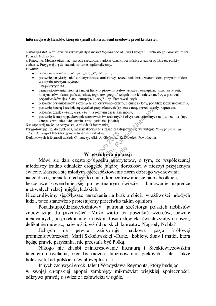 Informacja o dyktandzie, którą otrzymali zainteresowani uczniowie przed konkursem im D na ykt zj an w um do Pa im 2 ję . 01 cz P 5 ni ols e k ic h N ob lis tó w Gimnazjalisto! Weź udział w szkolnym dyktandzie! Wyłoni ono Mistrza Ortografii Publicznego Gimnazjum im. Polskich Noblistów w Pajęcznie. Możesz otrzymać nagrodę rzeczową, dyplom, cząstkową szóstkę z języka polskiego, punkty dodatnie. Przygotuj się do zadania solidnie, bądź najlepszy. Powtórz: • pisownię wyrazów z „ó”, „u”, „rz”, „ż”, „h”, „ch”, • pisownię partykuły „nie” z różnymi częściami mowy- rzeczownikiem, czasownikiem, przymiotnikiem w stopniu równym, wyższy, i najwyższym itd., • zasady stosowania wielkiej i małej litery w pisowni tytułów książek , czasopism, nazw instytucji, kontynentów, planet, państw, miast, regionów geograficznych oraz ich mieszkańców, w pisowni przymiotników (jaki? -np. europejski , czyj? – np. Fredrowski styl), • pisownię przymiotników złożonych (np. czerwono- czarny, ciemnozielony, ponadsześćdziesięcioletni), • pisownię łączną i rozdzielną wyrażeń przyimkowych (np. nade mną, sprzed szkoły, naprędce), • pisownię cząstek –bym, -byś, - by … z różnymi częściami mowy, • pisownię form przypadkowych rzeczowników rodzimych i obcych zakończonych na -ja, -ea, - ia (np. zbroja- zbroi, idea- idei, armia- armii, jadalnia- jadalni). Nie zapomnij także, co oczywiste, o zasadach interpunkcji. Przygotowując się, do dyktanda, możesz skorzystać z zasad znajdujących się we wstępie Nowego słownika ortograficznego PWN (dostępny w bibliotece szkolnej). Dodatkowych informacji udzielą Ci nauczycielki- A. Gleń oraz K. Drozdek. Powodzenia. Pu bl ic zn e G W poszukiwaniu pasji Mówi się dziś często o upadku autorytetów, o tym, że współczesnej młodzieży trudno odnaleźć drogę do mądrej dorosłości w niezbyt przyjaznym świecie. Zarzuca się młodym nierespektowanie norm dobrego wychowania na co dzień, ponadto niechęć do nauki, koncentrowanie się na błahostkach, bezcelowe szwendanie się po wirtualnym świecie i budowanie naprędce nietrwałych relacji międzyludzkich. Niecierpliwimy się, słysząc narzekania na brak ambicji, wrażliwości młodych ludzi, toteż stanowczo protestujemy przeciwko takim opiniom! Ponadstupięćdziesięciodniowy patronat sześciorga polskich noblistów zobowiązuje do przemyśleń. Może warto by poszukać wzorców, pewnie nieidealnych, bo przekonanie o doskonałości człowieka świadczyłoby o naszej, delikatnie mówiąc, naiwności, wśród polskich laureatów Nagrody Nobla? Jednych na pewno zainspiruje naukowa pasja królowej promieniotwórczości, Marii Skłodowskiej -Curie, kobiety, żony i matki, która będąc prawie paryżanką, nie przestała być Polką. Nikogo nie zhańbi zainteresowanie literaturą i Sienkiewiczowskim talentem utrwalania, rzec by można- hibernowania- pięknych, ale także bolesnych kart polskiej i światowej historii. Innych zachwyci epicki talent Władysława Reymonta, który budując w swojej chłopskiej epopei zamknięty mikroświat wiejskiej społeczności, odkrywa prawdę o świecie i człowieku w ogóle. Pu bl ic zn e G im D na ykt zj an w um do Pa im 2 ję . 01 cz P 5 ni ols e k ic h N ob lis tó w Jeszcze innych zauroczy oryginalność poetyckiej frazy oraz skromność, dystans, ironia, zaskakująca wiedza o skomplikowanej ludzkiej naturze prezentowane w utworach Wisławy Szymborskiej. Do drugich może przemówić niebanalna poezja Czesława Miłosza, który podjął się w swojej twórczości, skądinąd trudnej, sztuki zapisu piękna świata, jednocześnie wykazując się odwagą w obnażaniu jego ułomności, nierzadko, i ohydy. Inni przyjrzą się działalności i dokonaniom nie najmłodszego dziś Lecha Wałęsy. Może zaimponują im determinacja i dążenia wolnościowe jednego z najbardziej znanych na świecie Europejczyków, człowieka „Solidarności”, prezydenta Rzeczypospolitej Polskiej. To, że tak licznie, notabene w żaden sposób nieprzymuszani, przystąpiliśmy do ogólnoszkolnego dyktanda, świadczy o naszej ambicji, harcie ducha. Na przekór malkontentom i niedowiarkom, wbrew nie najrzadszej wśród ludzi niechęci do przestrzegania pisownianych reguł i tendencji do niezwracania uwagi na poprawność zapisu honorowo stoimy na straży polskiej ortografii. Być może podążamy pod prąd, ale dzięki temu nie najdalej nam do tych, którzy pozostając sobą, odnieśli sukces. Dlatego tchórzliwie nie czmychniemy ni stąd, ni zowąd z sali i dotrwamy do końca tego nieco przydługiego dyktanda.