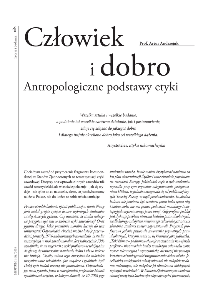 Teorie i badania 4 Człowiek Prof. Artur Andrzejuk i dobro Antropologiczne podstawy etyki Wszelka sztuka i wszelkie badanie, a podobnie też wszelkie zarówno działanie, jak i postanowienie, zdaje się zdążać do jakiegoś dobra i dlatego trafnie określono dobro jako cel wszelkiego dążenia. Arystoteles, Etyka nikomachejska MERITUM 1 (8) / 2008 Chciałbym zacząć od przytoczenia fragmentu korespondencji ze Stanów Zjednoczonych na temat sytuacji etyki zawodowej. Dotyczy ona wprawdzie innych zawodów niż zawód nauczycielski, ale właściwie pokazuje – jak się wydaje – nie tylko to, co nas czeka, ale to, co już chyba mamy także w Polsce, nie do końca to sobie uświadamiając. Pewien ośrodek badania opinii publicznej w stanie Nowy Jork zadał grupie tysiąca losowo wybranych studentów z całej Ameryki pytanie: Czy uważasz, że studia należycie przygotowują was w zakresie etyki zawodowej? Oraz pytanie drugie: Jakie przesłanie moralne kieruje do was uniwersytet? Odpowiedzi, chociaż można było je przewidzieć, poraziły. 97% ankietowanych stwierdziło, że studia zaszczepiają w nich zasady moralne, lecz jednocześnie 73% oznajmiło, że na zajęciach z etyki profesorowie wbijają im do głowy, że uniwersalne standardy dobra i zła w świecie nie istnieją. Czyżby mimo tego amerykańska młodzież instynktownie wiedziała, jak mądrze i godziwie żyć? Dalej tych badań zresztą nie prowadzono. Odpowiadając na to pytanie, jeden z nowojorskich profesorów historii opublikował artykuł, w którym donosił, że 10-20% jego studentów uważa, iż nie można krytykować nazistów za ich plan eksterminacji Żydów i inne zbrodnie popełnione na narodach Europy. Jakkolwiek część z tych studentów wyraziła przy tym prywatne zdegustowanie postępowaniem Hitlera, to jednak wstrzymała się od publicznej krytyki Trzeciej Rzeszy, w myśl przeświadczenia, iż „żadna kultura nie powinna być oceniana przez ludzi spoza niej i żadna osoba nie ma prawa podważać moralnego światopoglądu wyznawanego przez inną”. Gdy profesor poddał pod dyskusję problem istnienia kodeksu praw absolutnych, wedle którego zabójstwo niewinnego człowieka jest zawsze zbrodnią, studenci znowu zaprotestowali. Przyznali profesorowi jedynie prawo do stworzenia prywatnych praw absolutnych, którymi może on się kierować jako jednostka. „Taki klimat – podsumował swoje rozważania nowojorski profesor – niezawodnie budzi w młodym człowieku osobę wysoce tolerancyjną i wyrozumiałą, ale raczej nie pomaga kształtować umiejętności rozgraniczania dobra od zła. Jeżeli takiej umiejętności młody człowiek nie nabędzie w domu rodzinnym, nie nabędzie jej również na dzisiejszych wyższych uczelniach”. W Stanach Zjednoczonych wiadrem zimnej wody była lawina afer obyczajowych i finansowych, W tej sytuacji profesor, którego cytowałem, zaproponował powrót do tradycyjnej filozofii. (Dokładnie użył takiego wyrażenia, „tradycyjna filozofia”). Na szczęście w Polsce nie musimy jeszcze wracać, gdyż w tej tradycyjnej filozofii w jakimś sensie funkcjonujemy i dlatego proponuję przyjrzenie się podstawowym kategoriom etycznym, takim jak je sformułował w starożytności Arystoteles i takim jakie dotarły – za pośrednictwem chrześcijaństwa – do naszej dzisiejszej kultury filozoficznej i kultury w szerszym rozumieniu. Oznacza to, że będę odnosił się tutaj do filozofii św. Tomasza z Akwinu. Arystotelesowski schemat życia moralnego Jako motto tego wykładu zaproponowałem zdanie, które otwiera Etykę nikomachejską Arystotelesa. (Jest to pierwszy podręcznik etyki, jaki powstał w naszej kulturze). Motto to ujmuje założenia, których nie ma sensu tłumaczyć, są to bowiem tezy, które stanowią conditio sine qua non wszelkiej etyki i każdego rozumienia moralności. Pierwsze założenie to to, że człowiek jest istotą rozumną. Nie ma tutaj dla rozumności alternatywy. Czymże bowiem byłaby ta alternatywa? Tezą, że człowiek właśnie nie rozpoznaje otaczającej go rzeczywistości, że nie podejmuje decyzji w oparciu o swoje rozumne rozeznanie rzeczywistości, że raczej jest kierowany albo emocjami, albo instynktem, albo nie wiadomo czym. Druga teza, której będziemy bronić, to ta, że postępowanie i życie człowieka jest celowe. Jest to prosta konsekwencja rozumności człowieka, bo jeśli człowiek jest rozumny, to rozumnie decyduje o tym, co ma zrobić, dlaczego ma to zrobić i jak to zrobić. W związku z tym problemem dla etyki staje się coś, co Arystoteles nazwał „dobrym życiem”. To dobre życie polega na zgodności ludzkiego postępowania z rozumną strukturą lub naturą człowieka. I w związku Arystoteles podkreśla przede wszystkim, że człowiek działa celowo, to znaczy, że podejmując działanie, obiera jakiś przedmiot za cel swojej aktywności. Dlaczego ten przedmiot obiera? Otóż dlatego, że postrzega go jako coś pozytywnego, czyli jako dobro. Ale dlaczego człowiek pragnie dobra? Ano dlatego, że spodziewa się, iż w wyniku uzyskania tego dobra osiągnie coś, co Grecy nazywali szczęściem2. To, oczywiście, jest już pewna tradycja, którą Arystoteles przejmuje, ale istotne i nowe jest kolejne pytanie, które stawia. Mianowicie, bardzo często obserwujemy ludzi, którzy dostali to, czego chcieli, i nie są zadowoleni, nie doznają szczęścia. Co to oznacza? To oznacza, że dobro zostało wybrane nietrafnie. Arystoteles powie, że dobro było nieprawdziwe, źle ocenione, pozorne. W związku z tym pojawia się pytanie, jakie dobro będzie tym dobrem uszczęśliwiającym? Ano takie dobro, które będzie do człowieka dopasowane. „Dopasowane” to jest moje słowo, a Arystoteles powie „zgodne z naturą”. Należy więc zwrócić uwagę, że przy takim ujęciu moralności zasadnicza staje się odpowiedź na pytanie, na czym polega natura ludzka, lub inaczej: co jest istotą człowieka? Odpowiedź na to pytanie w