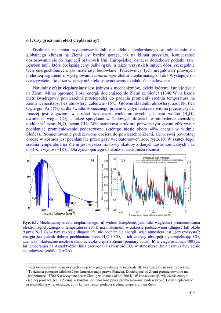 Rozdział VI. Zastosowania fizyki 6.1. Czy grozi nam efekt cieplarniany? Dyskusja na temat występowania lub nie efektu cieplarnianego w odniesieniu do globalnego klimatu na Ziemi jest bardzo gorąca, jak na klimat przystało. Konieczność dostosowania się do regulacji prawnych Unii Europejskiej oznacza dodatkowe podatki, tzw. „carbon tax”, które obciążają ceny paliw, gazu, a także wszystkich innych dóbr, szczególnie tych energochłonnych, jak materiały budowlane. Przeciwnicy tych uregulowań prawnych podnoszą argument o występowaniu naturalnego efektu cieplarnianego. Tak! Występuje on rzeczywiście, i to dużo większy niż efekt spowodowany działalnością człowieka. Naturalny efekt cieplarniany jest jednym z mechanizmów, dzięki któremu istnieje życie na Ziemi. Mimo ogromnej ilości energii docierającej do Ziemi ze Słońca (1340 W na każdy metr kwadratowy powierzchni prostopadłej do padania promieni) średnia temperatura na Ziemi wynosiłaby, bez atmosfery, zaledwie -15ºC. Główne składniki atmosfery, azot N2, tlen O2, argon Ar (1%) są dla światła słonecznego prawie w całym zakresie widma przezroczyste. Inaczej jest z gazami w postaci cząsteczek wieloatomowych, jak para wodna (H2O), dwutlenek węgla CO2, a także spotykane w śladowych ilościach w atmosferze ziemskiej podtlenek1 azotu N2O, metan CH4. Wieloatomowa struktura pozwala tym gazom efektywnie pochłaniać promieniowanie podczerwone (którego niesie około 40% energii w widmie Słońca). Promieniowanie podczerwone dociera do powierzchni Ziemi, ale w swej powrotnej drodze w kosmos jest pochłaniane przez gazy wieloatomowe2, zob. rys.3.10. W skutek tego, średnia temperatura na Ziemi jest wyższa niż to wynikałoby z danych „astronomicznych”, aż o 33 K, i wynosi +18ºC. Dla życia opartego na wodzie, zasadnicza różnica! a) b) Liczba falowa (cm-1) Ryc. 6.1. Mechanizmy efektu cieplarnianego: a) widmo (natężenie, jednostki względne) promieniowania elektromagnetycznego w temperaturze 290 K ma maksimum w zakresie podczerwieni (długość fali około 9 µm); N2 i O2 w tym zakresie długości fal nie pochłaniają energii, więc atmosfera jest „przezroczysta”; energia jest jednak dobrze pochłaniana przez H2O i CO2 – ich zakresy absorpcji się uzupełniają; CO2 „zamyka” skutecznie możliwe okno ucieczki ciepła z Ziemi (pomiary autor); b) w ciągu ostatnich 400 tys. lat temperatura na Antarktydzie (linia czerwona) i zawartość CO2 w atmosferze (linia czarna) były ściśle skorelowane (źródło: NAOA) 1 Poprawne chemicznie nazwy tych związków przestawiliśmy w rozdziale III; tu stosujemy nazwy tradycyjne. Ta dziwna pozornie zależność jest konsekwencją prawa Plancka. Docierające do Ziemi promieniowanie ma „temperaturę” 5700 K a wysyłane przez Ziemię w kosmos około 300 K. W konsekwencji, większość energii cieplnej powracającej z Ziemia w kosmos jest unoszona przez promieniowanie podczerwone. Gazy cieplarniane przeszkadzają w tej ucieczce, co w konsekwencji podnosi średnią temperaturą na Ziemi. 2 109 Mechanizmy efektu cieplarnianego nie są proste, stąd i jego skutki nie są bezpośrednie. W szczególności, o ile zawartość dwutlenku węgla w atmosferze nie zależy od temperatury3, to ilość pary wodnej zależy niezwykle silnie: od zawartości prawie 0% w temperaturze 0ºC do zawartości 100% w temperaturze 100ºC4. Mały wzrost temperatury na Ziemi powoduje znaczny wzrost ilości H2O w atmosferze, co potęguje efekt cieplarniany. Jest to rodzaj dodatniego sprzężenia zwrotnego, jak piszczące głośniki, kiedy w pobliżu jest mikrofon! Ilość CO2 w atmosferze, w przeciągu ostatnich setek tysięcy lat zmieniała się niewiele, co potrafimy udokumentować badając głębokie pokłady lodu na Antarktydzie, zob. ryc. 6.1a. Okazuje się, że średnia temperatura na Ziemi (a tę znamy np. z badania osadów muszli skorupiaków) jest ściśle skorelowana z zawartością CO2 (ryc. 6.1b). Zawartość CO2 zmieniała się od 200 ppm (części na milion) – wówczas średnia temperatura spadała o 8ºC, do nieco ponad 300 ppm – wówczas temperatura rosła o +2ºC. Ryc. 6.2a przedstawia zmiany koncentracji CO2 w ciągu ostatniego tysiąca lat. Od początku ery przemysłowej, tak około 1850 roku, obserwujemy wzrost CO2 – do dziś naturalny poziom tego gazu w atmosferze (wynoszący około 280 ppm) został przekroczony prawie o 30%! Ryc. 6.2.a) Wzrost CO2 w atmosferze; b) zmiany temperatury na półkuli południowej (NOAA) Wzrost poziomu CO2 nie oznacza wzrostu temperatury wszędzie i zawsze. Efekt cieplarniany oznacza niekoniecznie większą temperaturę, ale większą ilość ciepła akumulowanego w atmosferze. Atmosfera, z prądami powietrznymi, wiatrami, opadami deszczu, burzami używa tego ciepła do napędzania wewnętrznych procesów. Stąd efekt cieplarniany może oznaczać nawet niższe temperatury latem i w dzień, pochmurne lata, ciepłe zimy ale z gwałtownymi prądami mroźnego powietrza znad bieguna. Oceń sam, czy grozi nam dodatkowy efekt cieplarniany spowodowany spalaniem paliw przez człowieka, jakie może mieć skutki i jak można jemu zapobiec! Ryc. 6.3. Liczba tornad w USA w okresie 19551995 (Źródło: NOAA, USA) 3 Jak to pokazuje przykład Wenus z gigantycznymi ilościami CO2 w atmosferze i ogromna temperaturą (do 500º C) ilość CO2 w atmosferze nie zależy od temperatury tylko w „rozsądnym” zakresie temperatur. 4 W saunie jest duszno z powodu małej zawartości tlenu – ciśnienie pary wodnej wypycha z sauny powietrze. 110