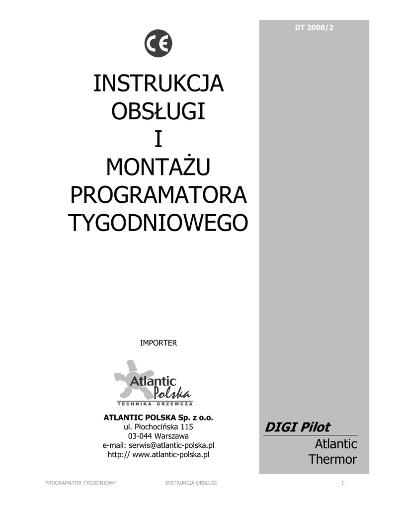 ATL/INS/2008/2/DIGI DT 2008/2PILOT INSTRUKCJA OBSŁUGI I MONTAŻU PROGRAMATORA TYGODNIOWEGO IMPORTER ATLANTIC POLSKA Sp. z o.o. ul. Płochocińska 115 03-044 Warszawa e-mail: [email protected] http:// www.atlantic-polska.pl PROGRAMATOR TYGODNIOWY INSTRUKCJA OBSŁUGI DIGI Pilot Atlantic Thermor - 1- ATL/INS/2008/2/DIGI PILOT PRZED ROZPOCZĘCIEM MONTAŻU URZĄDZENIA NALEŻY ZAPOZNAĆ SIĘ Z NINIEJSZĄ INSTRUKCJĄ NALEŻY ZACHOWAĆ NINIEJSZĄ INSTRUKCJĘ OBSŁUGI MONTAŻ URZĄDZENIA (POD RYGOREM UTRATY GWARANCJI) NALEŻY PRZEPROWADZAĆ W OPARCIU O NORMY OBOWIĄZUJĄCE W DANYM KRAJU ORAZ INFORMACJE ZAWARTE W NINIEJSZEJ INSTRUKCJI I – DANE TECHNICZNE 1.1 – PARAMETRY PRACY  zasilanie: 230 V~/50 Hz,  zużycie energii: 1 VA,  wymiary: wys. 84,7 mm, szer. 89,5 mm, część widoczna 20,4 mm, część zamocowana 28,5 mm,  przyłącze elektryczne: kabel o przekroju 1,5 mm2,  montaż: w puszce przyłączeniowej o średnicy 60 mm,  temperatura robocza: 0 do +40ºC,  stopień ochronności: IP 31 ,  wyjścia przewodu sterującego: w zależności od modelu, 1 lub 2 wyjścia przewodu sterującego 6stopniowego zgodnie ze standardem GIFAM,  każde wyjście może sterować maksymalnie 15 urządzeniami grzewczymi (impedancja 200 kΩ) lub 7 urządzeniami (impedancja 100 kΩ),  wilgotność: maks. 90% w temp. 20ºC 1.2 – MONTAŻ DIGI Pilot składa się z 2 części:  panelu przedniego (demontowanego przy pomocy śruby blokującej),  podstawy przeznaczonej do umieszczenia w puszce przyłączeniowej o średnicy 60 mm (rys). II – PODŁĄCZENIE ELEKTRYCZNE 2.1 – OKABLOWANIE W razie braku połączenia (na przykład na skutek przestawienia przewodu zerowego lub sterującego) DIGI Pilot wyświetla na swym ekranie informację o błędach Err (błąd) lub Z1 (strefa 1) i/lub Z2 (strefa 2). Należy wówczas odciąć zasilanie i ponownie sprawdzić poprawność okablowania. PROGRAMATOR TYGODNIOWY INSTRUKCJA OBSŁUGI - 2- ATL/INS/2008/2/DIGI PILOT III - UŻYTKOWANIE 3.1 – OPIS URZĄDZENIA sygnalizacja strefy aktualny czas przycisk zmiany strefy grzewczej dodawania wartości parametru aktualnie ustawianego sygnalizacja blokady sygnalizacja czasowego zawieszenia programu przycisk zmiany ustawień czasu odejmowanie wartości parametru aktualnie ustawianego przycisk zmiany programu przycisk zawieszenia programu wskazanie aktualnego trybu pracy BEZ JAKIEJKOLWIEK PAŃSTWA INGERENCJI, CODZIENNIE BĘDZIE DZIAŁAŁ TEN SAM PROGRAM LUB STAŁY TRYB GRZANIA NACIŚNIĘCIE DOWOLNEGO PRZYCISKU UAKTYWNIA PODŚWIETLENIE PANELU 3.2 – TRYBY PRACY oznacza ustawienie temperatury indywidualnej dla każdego z urządzeń grzewczych, tak aby uzyskać temperaturę tzw. komfortową. oznacza obniżenie temperatury w pomieszczeniach o -1ºC w stosunku do temperatury komfortowej. Tryb ten jest zalecany np. podczas nieobecności użytkowników w domu krócej niż 2 godziny. oznacza obniżenie temperatury w pomieszczeniach o -2ºC w stosunku do temperatury komfortowej. Tryb ten jest zalecany np. podczas nieobecności użytkowników trwającej 2-4 h. oznacza obniżenie temperatury w pomieszczeniach o -3,5ºC w stosunku do temperatury komfortowej. Tryb ten jest zalecany np. podczas nieobecności użytkowników w domu powyżej 4 h. (antyzamarzanie) pozwala utrzymać stałą temperaturę w pomieszczeniach na poziomie +7ºC. 3.3 – USTAWIENIE ZEGARA  przytrzymać wciśnięty przycisk przez 4 sek. (cyfry godzin migają),  użycie przycisków lub pozwala na ustawienie konkretnej godziny,  odczekać 4 sek. aby przejść do ustawienia minut (cyfry minut migają),  ustawić minuty przy pomocy przycisków lub ,  odczekać 4 sek. (koniec migania minut) w celu zakończenia ustawiania. ODCIĘCIE ZASILANIA LUB BRAK NAPIĘCIA SIECIOWEGO PRZEKRACZAJĄCY 5 min. POWODUJE KONIECZNOŚĆ PONOWNEGO USTAWIENIA ZEGARA PROGRAMATOR TYGODNIOWY INSTRUKCJA OBSŁUGI - 3- ATL/INS/2008/2/DIGI PILOT 3.4 - PROGRAMY DIGI Pilot oferuje 3 możliwe do wyboru programy fabryczne zapisane w pamięci programatora (nie podlegają modyfikacji) lub jeden z trybów (stały) możliwy do wyboru spośród trybów pracy , Naciskając sukcesywnie przycisk , istnieje możliwość wyboru programu lub trybu   4 aby wybrać tryb stały należy sukcesywnie naciskać przycisk aż wyświetlić się na ekranie tryb KOMFORT Ñ, następnie należy sukcesywnie przyciskać aż do uzyskania odpowiedniego trybu ogrzewania. 3.5 – CZASOWE ZAWIESZENIE PRACY PROGRAMU Istnieją możliwość czasowego zawieszenia pracy danego programu. W tym celu należy:  sukcesywnie przyciskać aż do uzyskania odpowiedniego trybu ogrzewania ,  za pomocą przycisków lub zwiększyć/zmniejszyć wartość żądanego czasu na który wybrany przez nas program ma zostać zawieszony,  po upływie tego czasu nasz programator powróci do uprzednio zaprogramowanego trybu 3.5 –ZAWIESZENIE PRACY PROGRAMU Z AUTOMATYCZNYM POWROTEM DO USTAWIEŃ Istnieją możliwość czasowego zawieszenia ustawionych uprzednio parametrów pracy programatora z możliwością powrotu do pierwotnie wybranego programu. W tym celu należy:  sukcesywnie przyciskać aż do uzyskania żądanego przez nas trybu pracy ,  przy najbliższej zmianie trybu pracy zapisanej w bieżącym programie nasz programator automatycznie powróci do ustawień w zadanym programie , 3.5 – BLOKADA USTAWIEŃ np. PRZED DZIEĆMI W tym celu należy:  nacisnąć i przytrzymać równocześnie przyciski  symbol pojawi się na wyświetlaczu. i przez 5 s, 3.6 – POWRÓT DO USTAWIEŃ FABRYCZNYCH Nacisnąć równocześnie i przytrzymaj wszystkie 4 przyciski znajdujące się na panelu programatora. 3.7 - WYGASZENIE EKRANU Wygaszenie ekranu programatora następuje samoczynnie i automatycznie po upływie 4 minut od ostatniej wykonanej czynności. IV - UWAGI DOTYCZĄCE UŻYTKOWANIA    przed zainstalowaniem programatora upewnij się czy przewód sterujący (przewód czarny) dla każdej ze stref ( Z1 i Z2) jest podłączony do puszki przyłączeniowej, przewód ste