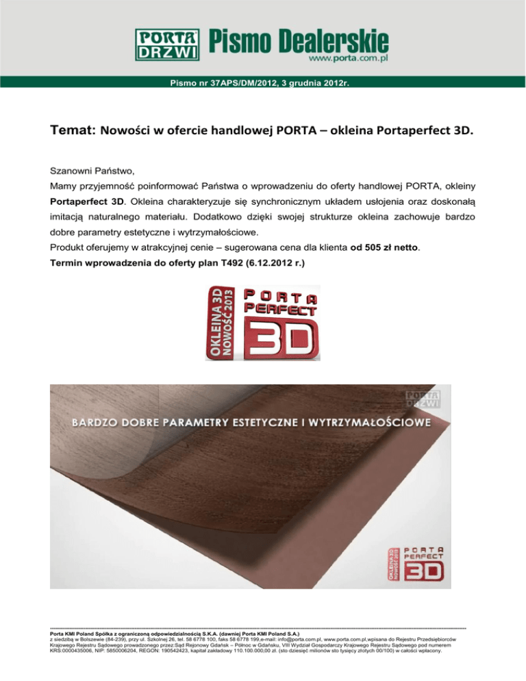 Pismo nr 37APS/DM/2012, 3 grudnia 2012r. Temat: Nowości w ofercie handlowej PORTA – okleina Portaperfect 3D. Szanowni Państwo, Mamy przyjemność poinformować Państwa o wprowadzeniu do oferty handlowej PORTA, okleiny Portaperfect 3D. Okleina charakteryzuje się synchronicznym układem usłojenia oraz doskonałą imitacją naturalnego materiału. Dodatkowo dzięki swojej strukturze okleina zachowuje bardzo dobre parametry estetyczne i wytrzymałościowe. Produkt oferujemy w atrakcyjnej cenie – sugerowana cena dla klienta od 505 zł netto. Termin wprowadzenia do oferty plan T492 (6.12.2012 r.) -------------------------------------------------------------------------------------------------------------------------------------------------------------------------------------------------------------------------------------------Porta KMI Poland Spółka z ograniczoną odpowiedzialnością S.K.A. (dawniej Porta KMI Poland S.A.) z siedzibą w Bolszewie (84-239), przy ul. Szkolnej 26, tel. 58 6778 100, faks 58 6778 199,e-mail: [email protected], www.porta.com.pl,wpisana do Rejestru Przedsiębiorców Krajowego Rejestru Sądowego prowadzonego przez:Sąd Rejonowy Gdańsk – Północ w Gdańsku, VIII Wydział Gospodarczy Krajowego Rejestru Sądowego pod numerem KRS:0000435006, NIP: 5850006204, REGON: 190542423, kapitał zakładowy 110.100.000,00 zł. (sto dziesięć milionów sto tysięcy złotych 00/100) w całości wpłacony. Zapraszamy do obejrzenia filmu promocyjnego dostępnego pod adresem: www.porta.com.pl/dm/portaperfect.wmv Okleiny z kolekcji Portaperfect 3D są przyjazne środowisku naturalnemu dzięki małej ilości odpadów oraz braku ingerencji w ekosystem lasu. Kolorystyka: Okleina Portaperfect 3D występuje w kolorach pożądanych aktualnie przez klientów. Dąb Hawana Dąb Kalifornia Symbolika: wyróżnikiem dla okleiny Portaperfect 3D jest indeks P na pozycji 11 oraz stosowne indeksy na pozycji 12 dla nowych kolorów grupy Portaperfect 3D: DH - Dąb Hawana DK - Dąb Kalifornia czyli np. PDH = Portaperfect 3D kolor dąb Hawana. -------------------------------------------------------------------------------------------------------------------------------------------------------------------------------------------------------------------------------------------Porta KMI Poland Spółka z ograniczoną odpowiedzialnością S.K.A. (dawniej Porta KMI Poland S.A.) z siedzibą w Bolszewie (84-239), przy ul. Szkolnej 26, tel. 58 6778 100, faks 58 6778 199,e-mail: [email protected], www.porta.com.pl,wpisana do Rejestru Przedsiębiorców Krajowego Rejestru Sądowego prowadzonego przez:Sąd Rejonowy Gdańsk – Północ w Gdańsku, VIII Wydział Gospodarczy Krajowego Rejestru Sądowego pod numerem KRS:0000435006, NIP: 5850006204, REGON: 190542423, kapitał zakładowy 110.100.000,00 zł. (sto dziesięć milionów sto tysięcy złotych 00/100) w całości wpłacony. Przykład symboliki: SSIPS SPWSB20P08PDH0SZ3KA3M0 skr.pn.wew.INS.gB.w2.P80.P/dąbHa.sr.3z.ram.sMat.wRam. Okleina dostępna w kolekcjach: Porta INSPIRE -------------------------------------------------------------------------------------------------------------------------------------------------------------------------------------------------------------------------------------------Porta KMI Poland Spółka z ograniczoną odpowiedzialnością S.K.A. (dawniej Porta KMI Poland S.A.) z siedzibą w Bolszewie (84-239), przy ul. Szkolnej 26, tel. 58 6778 100, faks 58 6778 199,e-mail: [email protected], www.porta.com.pl,wpisana do Rejestru Przedsiębiorców Krajowego Rejestru Sądowego prowadzonego przez:Sąd Rejonowy Gdańsk – Północ w Gdańsku, VIII Wydział Gospodarczy Krajowego Rejestru Sądowego pod numerem KRS:0000435006, NIP: 5850006204, REGON: 190542423, kapitał zakładowy 110.100.000,00 zł. (sto dziesięć milionów sto tysięcy złotych 00/100) w całości wpłacony. Porta KONCEPT Ceny dla okleiny Portaperfect 3D Porta KONCEPT A 570 / 701,1 B 540 / 664,2 Porta INSPIRE A 505 / 621,15 C 540 / 664,2 B 570 / 701,1 K 540 / 664,2 C 570 / 701,1 Ościeżnica MINIMAX Ceny jak Portadecor Ościeżnica Porta SYSTEM Ceny niższe od tożsamych ościeżnic w Portadecor o 15 zł, np. Ościeżnica w Portadecor: OPWP0B0P08DNG0SZ200000 – 249 zł netto Ościeżnica w Portaperfect 3D: OPWP0B0P08PDH0SZ200000 – 234 zł netto Panele i moduł Retro Ceny jak Portadecor Ościeżnica Porta SYSTEM ELEGANCE Wersja z zawiasami 2D Ceny jak Portadecor Wersja z zawiasami 3D Ceny niższe o 15% od tożsamych ościeżnic w okleinie Portadecor z zawiasami 3D Porta SYSTEM Gipsy Kings Ceny jak Portadecor Naświetla Ceny jak Portadecor Powyższy cennik produktów w okleinie Portaperfect 3D zawarto w załączonych do pisma kartach katalogowych. -------------------------------------------------------------------------------------------------------------------------------------------------------------------------------------------------------------------------------------------Porta KMI Poland Spółka z ograniczoną odpowiedzialnością S.K.A. (dawniej Porta KMI Poland S.A.) z siedzibą w Bolszewie (84-239), przy ul. Szkolnej 26, tel. 58 6778 100, faks 58 6778 199,e-mail: [email protected], www.porta.com.pl,wpisana do Rejestru Przedsiębiorców Krajowego Rejestru Sądowego prowadzonego przez:Sąd Rejonowy Gdańsk – Północ w Gdańsku, VIII Wydział Gospodarczy Krajowego Rejestru Sądowego pod numerem KRS:0000435006, NIP: 5850006204, REGON: 190542423, kapitał zakładowy 110.100.000,00 zł. (sto dziesięć milionów sto tysięcy złotych 00/100) w całości wpłacony. Zapraszamy Państwa do zakupu skrzydła w nowej okleinie Portaperfect 3D na ekspozycję z 50% rabatem, do skrzydła w nowej okleinie Portaperfect 3D zakupionego na ekspozycję otrzymają Państwo bezpłatnie: stojak ekspozycyjny na jedno skrzydło, dwustronną próbkę prezentującą okleinę Portaperfect 3D (Dąb Kalifornia/ Dąb Hawana) w formacie Maxi oraz naklejkę promującą skrzydło 