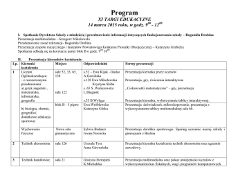 Program XI TARGI EDUKACYJNE 14 marca 2015 roku, w godz. 900 - 1200 I. Spotkanie Dyrektora Szkoły z młodzieżą i przedstawienie informacji dotyczących funkcjonowania szkoły – Bogumiła Drobina Prezentacja multimedialna - Grzegorz Mikołowski Przedstawienie zasad rekrutacji- Bogumiła Drobina Prezentacja zespołu muzycznego i laureatów Powiatowego Konkursu Piosenki Obcojęzycznej – Katarzyna Grabicka Spotkania odbędą się na korytarzu parter blok B o godz. 900 1000. II. Prezentacja kierunków kształcenia: Lp. Kierunki Miejsce Odpowiedzialni kształcenia Liceum sale 52, 33, 65, s.52 – Ewa Kijak –Dacko 1 Ogólnokształcące: 138 A.Gawińska - z rozszerzonymi s.138 Ewa Mikołowska przedmiotami: Krystyna Skiba a) język angielski , s. 65 S .Waliszewska matematyka, sala 122 L.Biegasik informatyka, geografia s.33 B.Wylęga blok B – I piętro Ewa.Wróblewska b) biologia, chemia, Katarzyna Górka geografia ( dodatkowo edukacja sportowa) Formy prezentacji Prezentacja kierunku przez uczniów Prezentacja, gry, ćwiczenia interaktywne ,,Ciekawostki matematyczne” – gry, prezentacja Prezentacja kierunku, wykorzystanie tablicy interaktywnej. Prezentacja doświadczeń, mikroskopowanie, prezentacja z wykorzystaniem tablicy multimedialnej sala 60.. Wychowanie fizyczne Nowa sala gimnastyczna Sylwia Bednarz Iwona Nowicka Prezentacja dorobku sportowego. Sparing uczennic naszej szkoły i gimnazjum z Bralina 2 Technik ekonomista sala 126 Urszula Tyra Anna Gawrońska Prezentacja kierunku kształcenia technik ekonomista oraz egzamin zawodowy. 3 Technik handlowiec sala 21 Grażyna Stempień K.Michalska Prezentacja multimedialna oraz pokaz umiejętności uczniów z wykorzystaniem kas fiskalnych, wag i programów komputerowych. 4 Technik ochrony środowiska Ip. Blok B Anna Paluszek Katarzyna Górka Prezentacja multimedialna kierunku kształcenia technik ochrony środowiska, pokaz doświadczeń oraz prezentacja tablic dydaktycznych, prace uczniów. 5 Technik żywienia i usług gastronomicznych sala nr 7 Anna Brzykowska Beata Ludwikowska Aneta Szczęsna 6 Technik informatyk sala 121 Iwona Idzikowska Prezentacja multimedialna kierunku kształcenia. Techniki składania serwetek. Nakrywanie do stołu, stoły okolicznościowe. Sporządzanie drobnych wypieków i zakąsek. Prezentacja multimedialna . Pokaz składania jednostki centralnej. Praca przy komputerze przy różnych pracach użytkowych. Technik organizacji reklamy sala 58 Małgorzata Lisiecka Ewelina Malinowska Atelier fotograficzne. Pokaz rysunku, malarstwa i grafiki komputerowej. Film reklamujący kierunek kształcenia. Technik architektury krajobrazu sala 57 Bogumiła Słowikowska Anna Chrząstowska Prezentacja multimedialna przedstawiająca kierunek kształcenia. Prezentacja projektów wykonawczych przez uczniów. Pokaz rysunku. Maria Cierlak Danuta Wabnic Grzegorz Mikołowski Prezentacja czytelni i biblioteki. Foldery ,,Biblioteka otwarta dla Ciebie”. Wystawa ,,Karykatura jako wypowiedź plastyczna”. Pokaz pierwszej pomocy. Prezentacja tablicy interaktywnej. Joanna Brajer, Barbara Posiewała Henryka Janecka-Dolata Prezentacja możliwości nauki języka niemieckiego. Prezentacje multimedialne uczniów. 7 8 Korytarz II p. B 10. Czytelnia Biblioteka EDB 11. Język niemiecki Sala 75 9 Sala 132 Samorząd Uczniowski: E. Kijak – Dacko, G. Mikołowski, I Idzikowska Kroniki Szkoły – M. Połomska – Wojtasik ZHP - M. Kacprzak Inne:Pedagog szkolny – korytarz I p. – Joanna Wawrzyniak Prezentacja wyposażenia sali vidoekonferencyjnej – sala 113 - projekty uczniowskie ,,Czas zawodowców” i unijne. Opracowała Agnieszka Krysiak