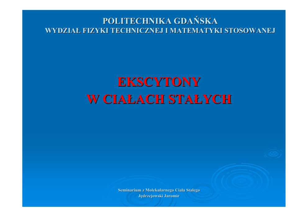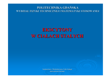 POLITECHNIKA GDAŃSKA WYDZIAŁ FIZYKI TECHNICZNEJ I MATEMATYKI STOSOWANEJ EKSCYTONY W CIAŁACH STAŁYCH Seminarium z Molekularnego Ciał Ciała Stał Stałego Jędrzejowski Jaromir Co to są ekscytony? • ekscyton to stan związany elektronu wzbudzonego do pasma przewodnictwa i dziury pozostałej w paśmie walencyjnym w wyniku oddziaływania kulombowskiego (podobieństwo: elektron-proton w atomie wodoru) • energia tworzenia eksctynów jest mniejsza od szerokości przerwy energetycznej (obszar, w którym kryształ powinien być przezroczysty • małe rozmiary ekscytonu i silne wiązanie elektronu z dziurą – ekscyton Frenkla (znaleziony w półprzewodnikach organicznych) • elektron i dziura słabo związane i odległość między nimi jest duża w porównaniu do stałej sieci – ekscyton Motta-Wanniera (typowy dla półprzewodnikach nieorganicznych) Poziomy energetyczne ekscytonów Jak wyznaczyć energię wiązania ekscytonu? • z pomiarów współczynnika absorpcji, jako różnica między energią potrzebną do utworzenia ekscytonu a energią potrzebną do utworzenia swobodnego elektronu i swobodnej dziury • z pomiarów luminescencji, jako różnica energii linii odpowiadającej rekombinacji swobodnego elektronu z dziura i linii odpowiadającej rekombinacji ekscytonu • z pomiarów fotojonizacji ekscytonów do stanu swobodnych nośników (w wyżej wymienionych metodach niezbędna jest duża koncentracja ekscytonów) Charakterystyczne energie wiązania dla półprzewodników nieorganicznych od 4.9meV , 5.1meV (GaAs, InP) do 29 meV , 59 meV (Zns, ZnO) dla półprzewodników organicznych od < 0.1eV do >> 1eV charakterystyczna: 0.3 eV dla ekscytonu Motta-Wanniera Eg ≈ 1 ε2 Ekscytony Frenkla • • • • • ekscyton o silnym wiązaniu zlokalizowany jest na jednym atomie dziura znajduje się w pobliżu tego samego atomu co elektron stan wzbudzony pojedynczego atomu, ale może przeskakiwać z atomu na atom (wykorzystanie sprzężenia między sąsiednimi atomami) energia ekscytonu liczona jest względem energii swobodnego elektronu w krysztale i swobodnej dziury, będących w spoczynku Stany translacyjne ekscytonów Frenkla mają postać fal rozchodzących się w periodycznej strukturze kryształu Ekscytony Motta-Wanniera • • • ekscytony o słabym wiązaniu stany związane są podobne do stanów w modelu atomu wodoru do opisu ekscytonów używa się formalizmu masy efektywnej (małe masy efektywne elektronów i dziur) Generacja ekscytonów • • • • • • • bezpośrednia absorpcja optyczna generacja poprzez promieniowanie wysokoenergetyczne (α, β, γ) generacja poprzez rekombinację nośników ładunku generacja poprzez przyspieszane nośniki ładunku wewnątrz materiału molekularnego generacja poprzez termiczne lub chemiczne procesy generacja w wyniku niebezpośredniego wzbudzenia generacja poprzez inne ekscytony Dyfuzja ekscytonów • przy wyższych temperaturach opis ekscytonów może być dokonywany przy użyciu dyfuzyjnego modelu ruchu ekscytonów d 2 S ( x) I 0κ exp(− κx ) − S ( x ) + D =0 τ0 dx 2 1 D – współczynnik dyfuzji ekscytonów τ 0 - czas życia ekscytonów S(x) – koncentracja ekscytonów w warunkach równowagi I 0 - natężenie padającego światła κ - liniowy współczynnik absorpcji Warunki brzegowe: • nieskończona grubość ciała absorbującego światło x→∞ S ( x) = 0 • ekscytony w pobliżu granicy ciała absorbującego mogą być wygaszane lub odbijane przez powierzchnię, a więc szybkość zaniku strumienia ekscytonów na powierzchni (s – szybkość wygaszania strumienia ekscytonów na powierzchni) dS D dx x =0 = sS (0) Koncentracja ekscytonów przy warunkach brzegowych ma postać: I 0κl 2 κlD + sl x ⎤ ⎡ exp( − ) − exp( − )⎥ κ x S ( x) = 2 2 ⎢ D + sl l ⎦ D(1 − κ l ) ⎣ gdzie l = Dτ 0 Interpretacja długości dyfuzji ekscytonów κ →∞ x I 0 l exp(− ) l S (∞ ) = D + sl I. II. III. l=0 l=40nm l=40nm s=0 s=∞ Kondensacja ekscytonów Do powstania kropli elektronowo-dziurowych (EHD – ang. electron-hole drop) prowadzi następująca sekwencja zdarzeń: • • • • • • w wyniku absorpcji fotonów o energii hω > E g powstają swobodne elektrony i dziury po krótkim czasie ok.. 1ns powstają ekscytony typowy czas życia ekscytonów wynosi 8 μs 13 −3 koncentracja ekscytonów powyżej , 10 cm to w temperaturze 2 K nastąpi kondensacja większości ekscytonów w krople czas kropli ekscytonów wynosi 40 μs wewnątrz kropli ekscytony rozpuszczają się tworząc zdegenerowany gaz Fermiego, o własnościach metalicznych, złożony z elektronów i dziur Kropla elektronowo-dziurowa w krążku czystego germanu Bibliografia • • • • • • • Godlewski J., Własności optyczne i elektryczne molekularnych ciał stałych, Wydawnictwo PG, Gdańsk 1996 Suffczyński M., Ekscytony związane na neutralnych domieszkach, Postępy Fizyki, tom 28, zeszyt 5, PWN, Kraków 1977 Suffczyński M., Dyskusja na temat kondensacji ekscytonów w półprzewodnikach, Postępy Fizyki, tom 24, zeszyt 2, PWN, Kraków 1973 Ibach H., Luth H., Fizyka ciała stałego, PWN, W-wa 1996 Kittel C., Wstęp do fizyki ciała stałego, PWN, W-wa 1999 http://edu.ioffe.ru/register/?doc=galperin/l9pdf7.tex http://kottan-labs.bgsu.edu/excitons.htm DZIĘKUJĘ ZA UWAGĘ ☺