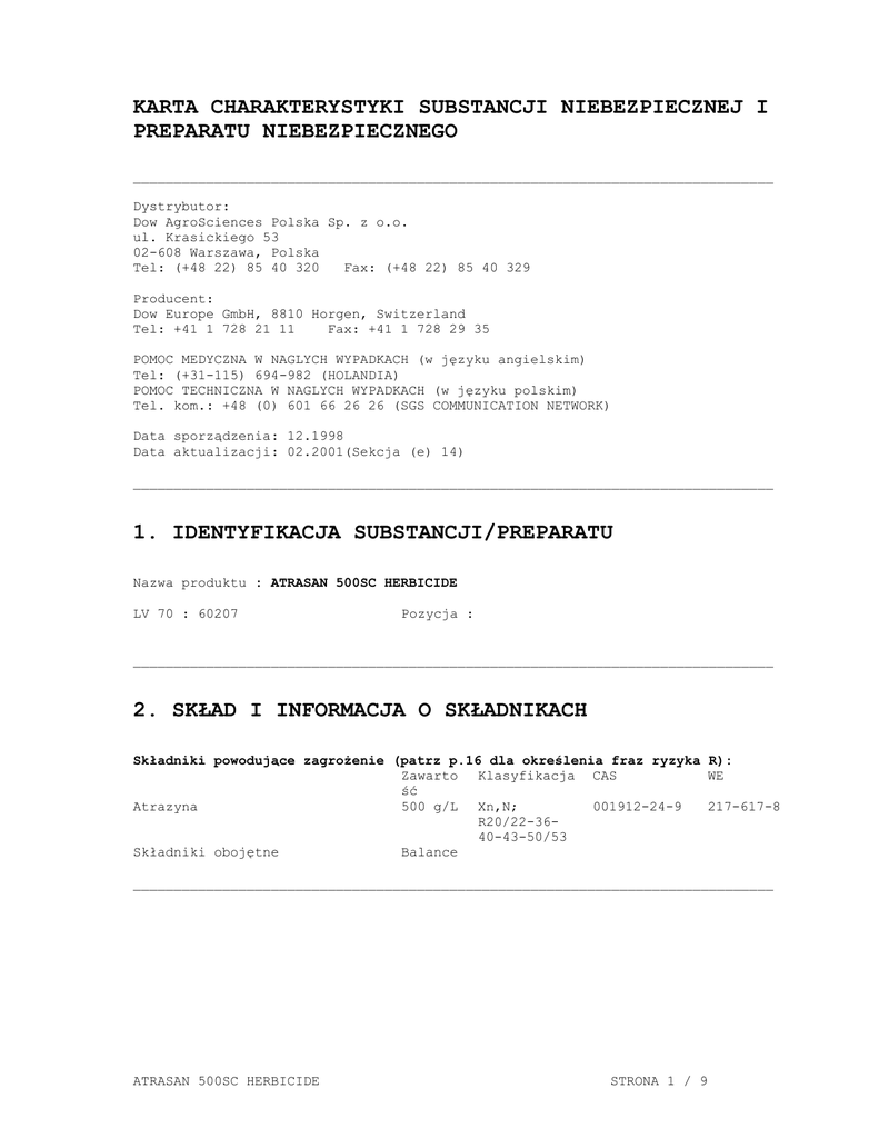 KARTA CHARAKTERYSTYKI SUBSTANCJI NIEBEZPIECZNEJ I PREPARATU NIEBEZPIECZNEGO _______________________________________________________________________________ Dystrybutor: Dow AgroSciences Polska Sp. z o.o. ul. Krasickiego 53 02-608 Warszawa, Polska Tel: (+48 22) 85 40 320 Fax: (+48 22) 85 40 329 Producent: Dow Europe GmbH, 8810 Horgen, Switzerland Tel: +41 1 728 21 11 Fax: +41 1 728 29 35 POMOC MEDYCZNA W NAGLYCH WYPADKACH (w języku angielskim) Tel: (+31-115) 694-982 (HOLANDIA) POMOC TECHNICZNA W NAGLYCH WYPADKACH (w języku polskim) Tel. kom.: +48 (0) 601 66 26 26 (SGS COMMUNICATION NETWORK) Data sporządzenia: 12.1998 Data aktualizacji: 02.2001(Sekcja (e) 14) _______________________________________________________________________________ 1. IDENTYFIKACJA SUBSTANCJI/PREPARATU Nazwa produktu : ATRASAN 500SC HERBICIDE LV 70 : 60207 Pozycja : _______________________________________________________________________________ 2. SKŁAD I INFORMACJA O SKŁADNIKACH Składniki powodujące zagrożenie (patrz p.16 dla określenia fraz ryzyka R): Zawarto Klasyfikacja CAS WE ść 001912-24-9 217-617-8 Atrazyna 500 g/L Xn,N; R20/22-3640-43-50/53 Składniki obojętne Balance _______________________________________________________________________________ ATRASAN 500SC HERBICIDE STRONA 1 / 9 3. IDENTYFIKACJA ZAGROŻEŃ Klasyfikacja produktu zgodnie z Rozporządzeniem Ministra Zdrowia z dnia 2 września 2003 r. w sprawie kryteriów i sposobu klasyfikacji substancji i preparatów chemicznych (Dz.U. nr 171/2003, poz. 1666): Produkt został sklasyfikowany jako preparat niebezpieczny i zaklasyfikowany do następujących kategorii niebezpieczeństwa: Szkodliwy Działa szkodliwie po połknięciu (R22). Oczekuje się, że materiał będzie toksyczny dla organizmów wodnych. _______________________________________________________________________________ 4. PIERWSZA POMOC Nigdy nie podawać płynów ani nie wywoływać wymiotów, jeśli poszkodowany jest nieprzytomny lub ma drgawki. Spożycie Nie wywoływać wymiotów. Natychmiast wezwać lekarza i / lub przewieźć do pogotowia ratunkowego. Decyzja o tym, czy należy wywołać wymioty, powinna być podjęta przez lekarza. Kontakt z oczami Przemywać natychmiast wodą przez co najmniej przez 5 minut. Kontakt ze skórą Zmyć pod bieżącą wodą lub pod prysznicem, w miarę możliwości z użyciem mydła. Wdychanie Wyprowadzić na świeże powietrze. Skonsultować się z lekarzem. Uwaga dla lekarza Brak specyficznej odtrutki. Opieka podtrzymująca. Leczenie oparte na ocenie lekarza na podstawie objawów u pacjenta. _______________________________________________________________________________ 5. POSTĘPOWANIE W PRZYPADKU POŻARU Środki gaśnicze Mgła wodna lub woda drobno rozpylona. Dwutlenek węgla. Sucha substancja jako środek gaśniczy. Piana. Niebezpieczne produkty spalania W czasie pożaru dym, poza toksycznymi lub drażniącymi produktami spalania o zmiennym składzie, może zawierać materiał wyjściowy. Produkty spalania zawierają: Chlorowodór. Tlenki azotu. Ochrona strażaków Nosić ubranie ochronne i stosować aparat oddechowy zasilaniem niezależnym od otaczającego powietrza. ATRASAN 500SC HERBICIDE STRONA 2 / 9 Informacje dodatkowe Chłodzić pojemniki przez spryskiwanie wodą. Ograniczyć wypływ, aby nie dopuścić do przedostania się do wody lub systemów ściekowych. _______________________________________________________________________________ 6. POSTĘPOWANIE W PRZYPADKU NIEZAMIERZONEGO UWOLNIENIA DO ŚRODOWISKA Osobiste środki ostrożności Nosić odpowiednie ubranie ochronne i ochronę oczu / twarzy (patrz Punkt 8). Środowiskowe środki ostrożności Nie zmywać do kanałów ściekowych ani do żadnej wody. Zawiadomić właściwe władze, jeśli wyciek przedostał się do cieku wodnego lub do systemu ściekowego. Sposoby oczyszczania Zaadsorbować w piasek lub inny niepalny materiał absorpcyjny i umieścić w pojemnikach do unieszkodliwienia. W przypadku dużych wycieków ogrodzić teren i skonsultować się z producentem. Jeśli potrzebna jest dalsza pomoc, telefonować pod alarmowy numer kontaktowy. _______________________________________________________________________________ 7. POSTĘPOWANIE Z SUBSTANCJĄ I JEJ MAGAZYNOWANIE Postępowanie Przestrzegać zasad higieny osobistej. Nie jeść i nie przechowywać produktów żywnościowych na stanowisku pracy. Umyć ręce i odsłoniętą skórę przed jedzeniem, piciem napojów lub paleniem tytoniu oraz po zakończeniu pracy. Podczas pracy z produktem należy stosować ogólne przepisy bezpieczeństwa i higieny pracy zawarte w Rozporządzeniu Ministra Pracy i Polityki Socjalnej z dnia 26 września 1997 r. (Dz.U. nr 129/1997, poz. 844). Magazynowanie Produkt powinien być przechowywany zgodnie z lokalnymi przepisami. Przechowywać w chłodnym, suchym, dobrze wentylowanym miejscu, w oryginalnym pojemniku. Chronić przed nadmiernym ogrzewaniem i chłodzeniem. Nie przechowywać w sąsiedztwie produktów żywnościowych, napojów, karmy dla zwierząt, wyrobów farmaceutycznych, kosmetyków, lub nawozów sztucznych. Trzymać z dala od dostępu dzieci. _______________________________________________________________________________ 8. KONTROLA NARAŻENIA I ŚRODKI OCHRONY INDYWIDUALNEJ Wytyczne dotyczące narażenia Normatywy higieniczne dla środowiska pracy wg Rozporządzenia Ministra Pracy i Polityki Socjalnej z dnia 17.06.1998 roku w sprawie najwyższych dopuszczalnych stężeń i natężeń czynników szkodliwych dla zdrowia w środowisku pracy (Dz.U. nr 79 z 1998 r., poz. 513) wraz z późniejszymi zmianami z dnia 2.01.2001 roku (Dz.U. nr 4 z 2001 r., poz. 36) nie zawierają żadnych składników substancji lub preparatu. ATRASAN 500SC HERBICIDE STRONA 3 / 9 Atrazyna: Progowa wartość graniczna (Threshold Limit Value - TLV) ustalona przez ACGIH wynosi 5 mg/m3, jako średnia ważona (TWA) 8-godzinnym czasem zmiany roboczej. Dopuszczalne stężenia w materiale biologicznym (DSB): Zaleca