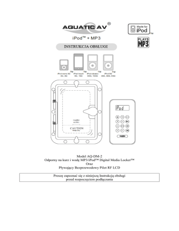 Model AQ-DM-2 Odporny na kurz i wodę MP3/iPod™ Digital Media Locker™ Oraz Pływający Bezprzewodowy Pilot RF LCD Proszę zapoznać się z niniejszą Instrukcją obsługi przed rozpoczęciem podłączania Rozmieszczenie przycisków Odporny na kurz i wodę MP3/iPod™ Digital Media Locker™ Numer 1 2 3 4 5 6 7 8 9 10 Opis Pokrętło i Drzwiczki Ochronne Dodatkowe pokrętła Przycisk zasilania WŁ/WYŁ Uszczelka zabezpieczająca przed wodą i kurzem Dodatkowe 3,5 mm wejście Jack na urządzenia MP3 Rowek odprowadzający wodę Światełko LED wskazujące włączenie/wyłączenie zasilania Pasek bezpieczeństwa dla urządzeń MP3/iPod™ Podłączenie iPoda™ Stacja dokująca dla iPoda™ (ogólnie 5 podłączeń) Rozpoczęcie Pracy ZAWARTOŚĆ: Upewnij się, że poniższe rzeczy zostały dostarczone: a) AQ-DM-2 Digital Media Locker™ b) Odporny na kurz i wodę Bezprzewodowy Pilot RF c) Dziesięć (10) zatyczek na nierdzewne śruby mocujące d) Pięć (5) Stacji dokujacych dla iPoda™ e) Dziesięć (10) nierdzewnych śrub mocujących f) Dwie (2) baterie CR-2032 INSTALACJA Podłączenie kabla 1. Podłączenie Plug and Play: AQ-DM-2 zawiera dwunastopinowe złącze „plug and play”. Jeżeli posiadasz inne urządzenia, mogą one wymagać alternatywnych rodzajów połączenia. Skontaktuj się ze sprzedawcą aby dowiedzieć się więcej. 2. Radio FM: AQ-DM-2 odbiera częstotliwości radiowe US i Euro. W obu przypadkach upewnij się, że antena radiowa jest całkowicie rozprostowana i zamontowana możliwe najwyżej. 3. Wejście RCA (cinch): AQ-DM-2 jest zaprojektowany tak abyś mógł korzystać z urządzeń podłączanych poprzez RCA (cinch). Dla innego sprzętu niż iPod™, okablowanie i złącze musi być zamawiane osobno. Numer części: AQ-UNH-1 lub AQ-UNH-2 Rozmieszczenie przycisków Bezprzewodowy Pilot RF LCD Przycisk Power Przełącznik 12 V Głośność + Głośność FM Radio Funkcja Muzyki Funkcja Radia Włącznik Zewnętrzne źródło prądu Zwiększa głośność o 3 decybele Wciśnij i przytrzymaj: Szybkie podgłaśnianie Zmniejsza głośność o 3 decybele Wciśnij i przytrzymaj: Szybkie ściszanie Zmienia na funkcję radia Nie działa Pamięć + Nie działa Zmiana lokalizacji w pamięci + Pamięć Nie działa Włącza tryb pamięci Pamięć - Nie działa Zmiana lokalizacji w pamięci - Muzyka Nie działa Zmienia na funkcję muzyki Przewijanie do tyłu Pauza/Włącz Poprzedni utwór Przytrzymaj: Przewijanie do tyłu -50kHz Przytrzymaj: skanuj do tyłu . Pauza/włącz Przytrzymaj: wyłącz iPoda™ Wycisz Przewijanie do przodu Następny utwór Przytrzymaj: Przewijanie do przodu +50kHz Przytrzymaj: skanuj do przodu o 1 pkt. Jeżeli używasz innego urządzenia niż iPod, nie będziesz miał możliwości przewijania i wyświetlania informacji o utworach Aby przedłużyć żywotność baterii, wyświetlacz LCD wyłączy się po 20 sekundach bezczynności. Naciśnięcie dowolnego przycisku włącza ponownie wyświetlacz. Rozpoczęcie Pracy Wyjmij odporny na kurz i wodę Bezprzewodowy Pilot RF z Digital Media Locker™. Odkręć wodoodporne zatyczki na tyle pilota, umieść baterie CR-2032 oraz zamontuj ponownie zatyczki. Zawsze upewnij się, że masz suche ręce podczas operacji podłączania/rozłączania sprzętu. Wyłączaj zasilanie gdy podłączasz Digital Media Locker™. Zwiększy to żywotność baterii Ważne informacje dotyczące używania pilota: Pilot wyświetli „- -” gdy będzie włączony. Ten komunikat będzie się utrzymywał, aż użytkownik włączy tryb radia lub tryb muzyki. Wyświetlacz LCD pokaże „- -” jeżeli będzie znajdował się powyżej 6 m od odbiornika. Pilot ten używa technologii najnowszej generacji aby informować cię czy odbiornik otrzymał polecenie. Jeżeli wyświetlacz LCD ponownie pokazuje „- -”, oznacza to, że pilot jest poza zasięgiem. Przycisk Power Aby włączyć Digital Media Locker™, wciśnij przycisk Power. Jeżeli sprzęt jest włączony, zaświeci się czerwona lampka LED. Przy działaniu urządzeń wymagających oddzielnych baterii 12 V, warto wyłączyć AQ-DM-2 poprzez bezprzewodowy pilot. Dzięki temu oddzielna bateria 12 V będzie dłużej działać. Synchronizacja Bezprzewodowego Pilota RF Do każdego Digital Media Locker™ dodawany jest pasujący Bezprzewodowy Pilot RF, aby użytkownik mógł w pełni cieszyć się wygodnym rozwiązaniem, jakim jest połączenie bezprzewodowe. Każdy nowy pilot należy aktywować/zsynchronizować, używając poniższej instrukcji: a. Wciśnij i przytrzymaj przycisk (Pauza/włącz) na pilocie i jednocześnie przycisk (Power) przez 2 sekundy. Wyświetlacz LCD pokaże komunikat „Pair”. b. Włącz Digital Media Locker™ wciskając przycisk (Power) w ciągu 10 sekund od wyświetlenia komunikatu „Pair”. (Jeżeli sprzęt jest włączony, zaświeci się czerwona lampka LED) c. Gdy synchronizacja się zakończy, wyświetlacz LCD powróci do oryginalnego ekranu. Jeżeli zakupiłeś nowy pilot, musi on być aktywowany zgodnie z powyższą instrukcją. Dwunastopinowe złącze Aquatic AV poleca używanie tego opcjonalnego połączenia „plug and play” (AQ-UNH-1), aby uzyskać najlepszą jakość dźwięku. Złącze nie jest standardowym wyposażeniem. Skontaktuj się ze swoim sprzedawcą aby dowiedzieć się więcej. Jeżeli nie zechcesz używać podłączenia „plug and play”, możesz użyć schematu okablowania poniżej. Wszelkie przewody powinny być przylutowane aby zabezpieczyć je przed zabrudzeniem i wodą. Instalacja jednostki 1. Szablony do montażu są załączone. Upewnij się, że wykonujesz otwory w odpowiednich miejscach i odpowiednich odległościach. 2. Po wykonaniu otworów oczyść obszar. AQ-DM-2 jest odporne na pył i wodę, ale wymaga czystej powierzchni aby działał poprawnie. 3. AQ-DM-2 ma dziesięć (10) miejsc na wkręty na wierzchu. Przykręć wkręty śrubokrętem. Wszystkie wkręty wkręć z taką samą siłą. Zapewni to lepsze zabezpieczen