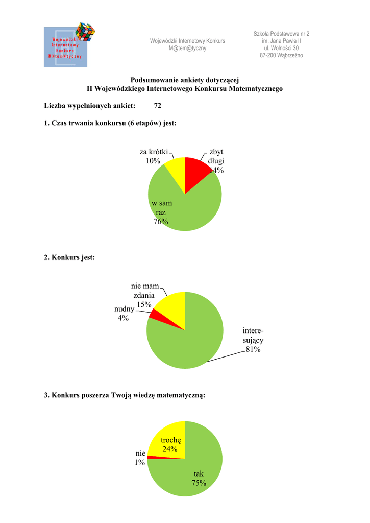 Wojewódzki Internetowy Konkurs M@tem@tyczny Szkoła Podstawowa nr 2 im. Jana Pawła II ul. Wolności 30 87-200 Wąbrzeźno Podsumowanie ankiety dotyczącej II Wojewódzkiego Internetowego Konkursu Matematycznego Liczba wypełnionych ankiet: 72 1. Czas trwania konkursu (6 etapów) jest: za krótki 10% zbyt długi 14% w sam raz 76% 2. Konkurs jest: nie mam zdania 15% nudny 4% interesujący 81% 3. Konkurs poszerza Twoją wiedzę matematyczną: nie 1% trochę 24% tak 75% Wojewódzki Internetowy Konkurs M@tem@tyczny Szkoła Podstawowa nr 2 im. Jana Pawła II ul. Wolności 30 87-200 Wąbrzeźno 4. Zadania rozwiązujesz: różnie 49% zawsze sam 43% zawsze z czyjąś pomocą 8% 5. Zadania są dla Ciebie: bardzo trudne 7% łatwe 18% trudne 75% 6. Polecenia do zadań są: zawsze jasno sformułowane 25% różnie 59% mało precyzyjnie sformułowane 16% Wojewódzki Internetowy Konkurs M@tem@tyczny Szkoła Podstawowa nr 2 im. Jana Pawła II ul. Wolności 30 87-200 Wąbrzeźno 7. Czy strona internetowa konkursu dostarcza Ci wszystkich potrzebnych informacji? nie mam zdania 14% nie 5% tak 81%