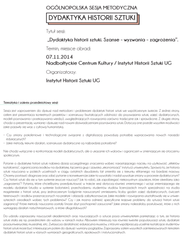 OGÓLNOPOLSKA SESJA METODYCZNA Tytuł sesji: „Dydaktyka historii sztuki. Szanse - wyzwania - zagrożenia”. Termin, miejsce obrad: 07.11.2014 Nadbałtyckie Centrum Kultury / Instytut Historii Sztuki UG Organizatorzy: Instytut Historii Sztuki UG Tematyka i zakres przedmiotowy sesji Sesja jest zaproszeniem do dyskusji nad metodami i problemami dydaktyki historii sztuki we współczesnym świecie. Z jednej strony, celem jest prezentacja konkretnych projektów i scenariuszy (kształcących zdolności do przyswajania sztuki, zajęć dydaktycznych, modeli poznawania i przekazywania wiedzy), uwzględniających rozwiązania zarówno tradycyjne jak i sprawdzone. Z drugiej strony, chodzi o prezentację, wymianę i dyskusję nad nowymi doświadczeniami poznawania sztuki. Dotyczą one przede wszystkim możliwości jakie pojawiły się wraz z cyfrową humanistyką. • Czy zmiany pokoleniowe i technologiczne związane z digitalizacją powodują potrzebę wypracowania nowych narzędzi edukacyjnych? • Jakie metody, kierunki działań, scenariusze dydaktyczne są najbardziej potrzebne? Nie chodzi wyłącznie o konfrontację modeli dydaktycznych, ale o ukazanie ich walorów i ograniczeń w zmieniającym się otoczeniu społecznym. Pytanie o dydaktykę historii sztuki nabiera dzisiaj szczególnego znaczenia wobec narastającego nacisku na użytkowość „efektów kształcenia”, ograniczania środków na dydaktykę, łączenia grup i zjawiska „ekonomizacji” instytucji uniwersytetu. Sprawia to, że historia sztuki nauczana w polskich uczelniach w ciągu ostatnich dwudziestu lat zmieniła się z kierunku elitarnego na bardziej masowy. Chcemy postawić diagnozę oraz zdać pytanie o konsekwencje: jakie to wywołało i nadal wywołuje zmiany w procesie dydaktycznym? Czy historii sztuki da się w tym systemie jeszcze nauczyć? Jak to robić, jak zapobiegać niekorzystnym zjawiskom, które określamy jako „zagrożenia”? Pytania, które chcielibyśmy przedyskutować w trakcie sesji dotyczą również zmienionego i wciąż zmieniającego się modelu dydaktyki (studia w systemie bolońskim), przechodzeniu studentów studiów licencjackich innych specjalności na studia magisterskie z historii sztuki, przy jednoczesnym (odgórnie narzucanym) zmniejszeniu liczby godzin zajęć dydaktycznych, ćwiczeń terenowych i środków przeznaczonych na praktyki i objazdy zabytkoznawcze. Jakie modele i rozwiązania ukształtowały się w uniwersyteckich ośrodkach wobec tych problemów? Czy i jak można odnieść specyficzne krajowe problemy do sytuacji historii sztuki zagranicą? Które metody nauczania zostały (może zbyt pochopnie) zarzucone? Jakie zmiany należałoby postulować, które z nich wymagają działań natychmiastowych, a które długofalowych? Do udziału zapraszamy nauczycieli akademickich oraz nauczających o sztuce poza uniwersytetem pamiętając o tym, że historia sztuki stała się np. przedmiotem do wyboru w ramach matur. Albowiem interesują nas również kwestie popularyzacji sztuki, dydaktyki pozauniwersyckiej, muzealnej, etc. Zwłaszcza działalność edukacyjna muzeów, z którymi współpracują uczelnie kształcące studentów historii sztuki może być interesującym polem do dyskusji i wymiany poglądów. Zapraszamy zatem wszystkich zainteresowanych tematem dydaktyki historii sztuki w różnych wymiarach geograficznych, epokowych i instytucjonalnych. Debata z udziałem Dyrekcji Instytutów Historii Sztuki w Polsce Podczas spotkania planujemy jedną sesję plenarną, która ma być debatą wszystkich zainteresowanych stron na temat dydaktyki historii sztuki w systemie bolońskim (ujednolicanie standardów kształcenia a kwestie specyfiki poszczególnych ośrodków, stosowanych metod). Sesja dotyczyć więc będzie również konsekwencji reformy systemu kształcenia oraz wejścia Polski w dzisiejszym system uniwersyteckim. Chcemy przyjrzeć się temu modelowi krytycznie, aby przedyskutować możliwości i realne formy alternatywne. Osobną kwestią będzie więc refleksja nad programami kształcenia w kontekście ich (niedo)finansowania, kwestii koordynacji, problemów organizacyjnych, a także zmieniających się oczekiwań ze strony pracodawców (zmiany we współczesnym muzealnictwie, nowe potrzeby i nowe kompetencje zawodowe) oraz ze strony przemian we współczesnej kulturze wizualnej. Zapraszamy w debacie do dyskusji na temat wyzwań związanych szerszymi przemianami kulturowymi, pokoleniowymi czy mentalnymi. Interesują nas tu czynniki, które determinują sposoby nauczania, a w konsekwencji jakość kształcenia. Przewidywany czas wystąpień Maksymalnie 20 minut. Termin zgłoszenia wystąpień Proponowane tytuły referatów i ich abstrakty (maksymalnie 1,5 strony) prosimy nadsyłać najpóźniej do 05.10.2014 na adres email sekretariatu Instytutu Historii Sztuki UG [email protected] oraz [email protected]. Wydarzenia towarzyszące Wydarzeniu będzie towarzyszyć Konferencja Dyrekcji Instytutów Historii Sztuki w Polsce oraz II Ogólnopolski Kongres Studentów i Doktorantów Historii Sztuki.