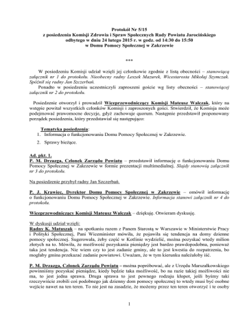 Protokół Nr 5/15 z posiedzenia Komisji Zdrowia i Spraw Społecznych Rady Powiatu Jarocińskiego odbytego w dniu 24 lutego 2015 r. w godz. od 14:30 do 15:50 w Domu Pomocy Społecznej w Zakrzewie *** W posiedzeniu Komisji udział wzięli jej członkowie zgodnie z listą obecności – stanowiącą załącznik nr 1 do protokołu. Nieobecny radny Leszek Mazurek, Wicestarosta Mikołaj Szymczak. Spóźnił się radny Jan Szczerbań. Ponadto w posiedzeniu uczestniczyli zaproszeni goście wg listy obecności – stanowiącej załącznik nr 2 do protokołu. Posiedzenie otworzył i prowadził Wiceprzewodniczący Komisji Mateusz Walczak, który na wstępie powitał wszystkich członków Komisji i zaproszonych gości. Stwierdził, że Komisja może podejmować prawomocne decyzje, gdyż zachowuje quorum. Następnie przedstawił proponowany porządek posiedzenia, który przedstawiał się następująco: Tematyka posiedzenia: 1. Informacja o funkcjonowaniu Domu Pomocy Społecznej w Zakrzewie. 2. Sprawy bieżące. Ad. pkt. 1. P. M. Drzazga, Członek Zarządu Powiatu – przedstawił informację o funkcjonowaniu Domu Pomocy Społecznej w Zakrzewie w formie prezentacji multimedialnej. Slajdy stanowią załącznik nr 3 do protokołu. Na posiedzenie przybył radny Jan Szczerbań. P. J. Krawiec, Dyrektor Domu Pomocy Społecznej w Zakrzewie – omówił informację o funkcjonowaniu Domu Pomocy Społecznej w Zakrzewie. Informacja stanowi załącznik nr 4 do protokołu. Wiceprzewodniczący Komisji Mateusz Walczak – dziękuję. Otwieram dyskusję. W dyskusji udział wzięli: Radny K. Matuszak – na spotkaniu razem z Panem Starostą w Warszawie w Ministerstwie Pracy i Polityki Społecznej, Pani Wiceminister mówiła, że pojawiła się tendencja na domy dzienne pomocy społecznej. Sugerowała, żeby część w Kotlinie wydzielić, można pozyskać wtedy milion złotych na to. Mówiła, że możliwość pozyskania pieniędzy jest bardzo prawdopodobna, ponieważ taka jest tendencja. Nie wiem czy to jest zadanie gminy, ale to jest kwestia do rozpatrzenia, bo mogłaby gmina przekazać zadanie powiatowi. Uważam, że w tym kierunku należałoby iść. P. M. Drzazga, Członek Zarządu Powiatu – można popróbować, ale z Urzędu Marszałkowskiego powinniśmy pozyskać pieniądze, kiedy będzie taka możliwość, bo na razie takiej możliwości nie ma, to jest jedna sprawa. Druga sprawa to jest pewnego rodzaju kłopot, jeśli byśmy taki rzeczywiście zrobili coś podobnego jak dzienny dom pomocy społecznej to wtedy musi być osobne wejście nawet na ten teren. To nie jest na zasadzie, że możemy przez ten teren otworzyć i te osoby 1 mogą wchodzić. Cały problem był związany z tym, że to jest kompleks przeznaczony pod konkretne osoby. Myśleliśmy, o rehabilitacji w stosunku do mieszkańców, chociażby gminy Kotlin, ale się okazuje, że nie ma takiej możliwości, bo trzeba osobne wejście zrobić, inaczej mówiąc musiałoby być przejście przez ten teren wydzielone, nie ma takiej możliwości, że ktoś sobie chodzi po tym obiekcie. Tutaj jest kłopot. Jak byłem pierwszy raz w Ministerstwie Pracy i Spraw Społecznych spotkałem się z taką opinią. Pamięta Pan, Panie Karolu jak w zeszłej kadencji byłem w Ministerstwie i oferowali dla powiatu 2 mln zł w grudniu i w grudniu należało wydać. Gdybyśmy nie wydali wtedy tych dwóch milionów jako samorząd, to wiadomo, że jest odpowiedzialność związana z tym. Do zwrotu i jeszcze z odsetkami byśmy musieli zwrócić. Radny Zb. Kuzdżał – czy jest możliwość pozyskania jakiejś dotacji do rozbudowy Kotlina? Radny K. Matuszak – cały czas działamy. Słyszę, że jest możliwość. Zabiegi trwają cały czas. W Ministerstwie mówiono nam o rezerwie, bo tak to pieniędzy nie ma. Albo z rezerwy rządowej. Pani w Ministerstwie sugerowała, żeby przedzielić korytarz, tak sugerowała. Radna B. Włodarczyk – prosiłabym, aby wytłumaczyć, bo nie jestem w temacie. Ile Pan Dyrektor ma pensjonariuszy z naszego powiatu na 110? P. J. Krawiec, Dyrektor Domu Pomocy Społecznej w Zakrzewie – to jest ponad 50%. Radna B. Włodarczyk – czyli to jest 50, 60 osób. Z naszego jarocińskiego powiatu. Mnie dręczy takie pytanie od dawna, mianowicie utrzymanie, rozbudowa, wszystko to co nam Pan Drzazga nam pokazywał jest bardzo ładne, ale to tylko i wyłącznie na barkach powiatu jarocińskiego. Dlaczego nie traktuje się jak ośrodka w Cerekwicy, przeszedł na „garnuszek” wojewódzki. W związku z tym, że połowa jest powiatu jarocińskiego, czyli naszego rodzinnego, ale reszta to jest z zewnątrz. Dlaczego nie ma partycypacji innych? My się głowimy skąd wziąć pieniądze, z zewnątrz pieniędzy też żeśmy nie pozyskali żadnych. Wobec tego to jest tylko i wyłącznie na garnuszku powiatu jarocińskiego ewentualnie jeśli Pani Minister cos pokombinuje w prawo czy w lewo. Pytam się Was czy wiecie dlaczego? P. M. Drzazga, Członek Zarządu Powiatu – przede wszystkim jest to zadanie powiatu, generalnie jak popatrzymy…. Radna B. Włodarczyk – przepraszam, że wejdę w słowo, powiatu czy gminy ? P. M. Drzazga, Członek Zarządu Powiatu – powiatu. Radna B. Włodarczyk – DPS jest na przykład w Raszewach i tym DPS-em zawiaduje Żerków. P. M. Drzazga, Członek Zarządu Powiatu – ale to gmina sama założyła. Radny Zb. Kuzdżał – przez gminę przechodzą pieniądze, ale to idzie z województwa, od Wojewody pieniążki idą, przez gminę Żerków. P. J. Krawiec, Dyrektor Domu Pomocy Społecznej w Zakrzewie – to co Pan Drzazga powiedział, że DPS-y w kraju są w większości są to zadania własne powiatu. Ustawodawca nie wyklucza prowadzenia takiego DPS-u przez gminy i tak jest w Żerkowie. Gmina Żerków prowadzi swój DPS, który jest w zadaniach gminy Żerków. DPS zawsze był tzn. od 1999 roku jak powstały powiaty zostały przekazane do DPS –ów. 98% prowadzącymi jest powiat. 2 Radna B. Włodarczyk – jeszcze moje pyta