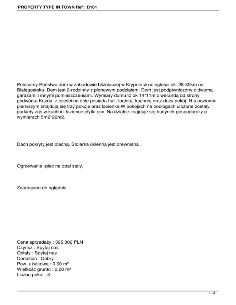 PROPERTY TYPE IN TOWN Ref : D161 Polecamy Państwu dom w zabudowie bliźniaczej w Krypnie w odległości ok. 28-30km od Białegostoku. Dom jest 2-rodzinny z pionowym podziałem. Dom jest podpiwniczony z dwoma garażami i innymi pomieszczeniami. Wymiary domu to ok 14*11m z werandą od strony podwórka.Każda z części na dole posiada hall, toaletę, kuchnię oraz duży pokój. N a poziomie pierwszym znajdują się trzy pokoje oraz łazienka.W pokojach na podłogach ułożone zostały parkiety zaś w kuchni i łazience płytki pcv. Na działce znajduje się budynek gospodarczy o wymiarach 5m2*22m2. Dach pokryty jest blachą. Stolarka okienna jest drewniana . Ogrzewanie -piec na opał stały. Zapraszam do oglądnia Cena sprzedaży : 395 000 PLN Czynsz : Spytaj nas Opłaty : Spytaj nas Condition : Dobry Pow. użytkowa : 0.00 m² Wielkość gruntu : 0.00 m² Liczba pokoi : 3 1/2 PROPERTY TYPE IN TOWN Ref : D161 Piętro : 2 Rok budowy : 1974 Technologia budowy : Pustak Stan prawny : Własność notarialna Adres : Gm.Krypno, GM.KRYPNO Osiedle : (*) http://nieruchomosciszymborska.pl/index.php?view=properties&id=1043%3Agmkrypno&option= com_jea&Itemid=23 2/2