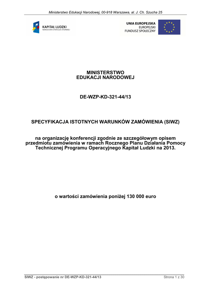 Ministerstwo Edukacji Narodowej, 00-918 Warszawa, al. J. Ch. Szucha 25 MINISTERSTWO EDUKACJI NARODOWEJ DE-WZP-KD-321-44/13 SPECYFIKACJA ISTOTNYCH WARUNKÓW ZAMÓWIENIA (SIWZ) na organizację konferencji zgodnie ze szczegółowym opisem przedmiotu zamówienia w ramach Rocznego Planu Działania Pomocy Technicznej Programu Operacyjnego Kapitał Ludzki na 2013. o wartości zamówienia poniżej 130 000 euro _____________________________________________________________________________ SIWZ - postępowanie nr DE-WZP-KD-321-44/13 Strona 1 z 30 Ministerstwo Edukacji Narodowej, 00-918 Warszawa, al. J. Ch. Szucha 25 Rozdział 1 Informacje ogólne 1. Zamawiającym jest: Ministerstwo Edukacji Narodowej, al. J. Ch. Szucha 25, 00-918 Warszawa NIP: 7010015610, REGON: 000177939, 2. Postępowanie prowadzi: Departament Ekonomiczny, tel.: (22) 34-74-192, (22) 34-74-242, fax: (22) 621-50-10, pon. – pt. 8:15-16:15. 3. Postępowanie jest prowadzone na podstawie przepisów ustawy z dnia 29 stycznia 2004 roku Prawo zamówień publicznych (tekst jedn.: Dz. U. z 2013 r. poz. 907) zwanej dalej „ustawą”, oraz aktów wykonawczych do ustawy. 4. Tryb udzielania zamówienia: PRZETARG NIEOGRANICZONY. 5. Postępowanie prowadzone jest w języku polskim. 6. Miejsce publikacji ogłoszenia o przetargu: a) Biuletyn Zamówień Publicznych, b) strona internetowa MEN: www.men.gov.pl (zakładka BIP), c) tablica ogłoszeń w budynku Zamawiającego. 7. Zamówienie współfinansowane ze środków Unii Europejskiej w ramach Europejskiego Funduszu Społecznego. Projekt jest finansowany w ramach Rocznego Planu Działania Pomocy Technicznej Programu Operacyjnego Kapitał Ludzki. Kod projektu KL 101-05-00000. Rozdział 2 Opis przedmiotu zamówienia Przedmiotem zamówienia jest organizacja konferencji pt. „Nowa perspektywa finansowa 20142020 – Wiedza, Edukacja, Rozwój” w ramach Rocznego Planu Działania Pomocy Technicznej Programu Operacyjnego Kapitał Ludzki na 2013 dla maksymalnie 130 osób w dniach 27-29 listopada 2013 roku w Krakowie w hotelu o standardzie co najmniej czterogwiazdkowym, w rozumieniu przepisów rozporządzenia Ministra Gospodarki i Pracy z dnia 19 sierpnia 2004 r. w sprawie obiektów hotelarskich i innych obiektów, w których są świadczone usługi hotelarskie, w którym będzie znajdować się sala konferencyjna, restauracja oraz pokoje dla gości. Szczegółowy opis przedmiotu zamówienia został przedstawiony w Załączniku nr 1 do SIWZ (Szczegółowy opis przedmiotu zamówienia) oraz Załączniku nr 2 do SIWZ (Istotne postanowienia umowy). Wspólny Słownik Zamówień (CPV): 55120000-7 (Usługi hotelarskie w zakresie spotkań i konferencji), 39294100-0 (Artykuły informacyjne i promocyjne). Rozdział 3 Informacje dodatkowe 1. Zamawiający nie dopuszcza składania ofert częściowych. 2. Zamawiający nie dopuszcza składania ofert wariantowych. 3. Zamawiający nie przewiduje udzielenia zamówień uzupełniających, o których mowa w art. 67 ust. 1 pkt 7 ustawy. 4. Zamawiający nie przewiduje aukcji elektronicznej. 5. Zamawiający nie przewiduje zawarcia umowy ramowej. 6. Rozliczenia z Wykonawcą dokonywane będą w walucie polskiej. 7. Zamawiający nie przewiduje udzielania zaliczek na poczet wykonania zamówienia. 8. Zamawiający nie przewiduje zwrotu kosztów udziału w postępowaniu, z zastrzeżeniem art. 93 ust. 4 ustawy. 9. Zamawiający nie ogranicza możliwości ubiegania się o zamówienie publiczne tylko dla Wykonawców, u których ponad 50% pracowników stanowią osoby niepełnosprawne. 10. Na podstawie art. 36 ust. 4 ustawy Wykonawca jest zobowiązany umieścić w składanej ofercie informację o części zamówienia, którą zamierza powierzyć podwykonawcom. Zamawiający nie zastrzega żadnej części zamówienia, która nie może być powierzona podwykonawcom. _____________________________________________________________________________ SIWZ - postępowanie nr DE-WZP-KD-321-44/13 Strona 2 z 30 Ministerstwo Edukacji Narodowej, 00-918 Warszawa, al. J. Ch. Szucha 25 11. DODATKOWE WYMAGANIA KLAUZULA SPOŁECZNA ZWIĄZANE Z REALIZACJĄ ZAMÓWIENIA – 1. Do realizacji umowy Wykonawca zatrudni co najmniej 1 osobę niepełnosprawną, o której mowa w Ustawie z dnia 27 sierpnia 1997 r. o rehabilitacji zawodowej i społecznej oraz zatrudnianiu osób niepełnosprawnych na podstawie umowy o pracę (Dz. U. z 2011 r. Nr 127, poz. 721 ze zm.), w wymiarze czasu pracy – minimum ½ (połowa) pełnego wymiaru czasu pracy. Wykonawca powierzy ww. osobie zadania związane bezpośrednio z przygotowaniem i organizacją konferencji. 2. Umowa o pracę powinna być zawarta nie później niż w terminie 7 dni od podpisania umowy w sprawie zamówienia publicznego. Stosunek pracy powinien trwać od dnia zawarcia umowy o pracę do końca realizacji przedmiotu umowy z zastrzeżeniem ust. 5. 3. Wykonawca zobowiązany jest do okazania Zamawiającemu oryginału umowy o pracę zawartej z osobą niepełnosprawną w terminie 3 dni roboczych od dnia jej zawarcia oraz kopię dokumentu potwierdzającego niepełnosprawność tej osoby. 4. W przypadku rozwiązania stosunku pracy albo wygaśnięcia stosunku pracy Wykonawca będzie obowiązany do zatrudnienia na to miejsce innego niepełnosprawnego w terminie do 7 dni od dnia ustania stosunku pracy. W takim przypadku ustępy 1, 2, 3, 5 oraz 6 stosuje się odpowiednio. 5. Zamawiający uprawniony jest do kontroli spełniania przez Wykonawcę wymagań dotyczących zatrudniania osoby niepełnosprawnej na każdym etapie realizacji umowy. Na żądanie Zamawiającego Wykonawca niezwłocznie udokumentuje fakt zatrudniania takiej osoby i przedłoży dokumenty, których zażąda Zamawiający. 6. W przypadku niezatrudniania na zasadach wskazanych powyżej, w sposób nieprzerwany przy realizacji przedmiotu umowy osoby niepełnosprawnej, Wykonawca zapłaci Zamawiającemu karę umowną zgodnie z § 7 ust. 9 umowy, chyba że Wykonawca wykaże, że niezatrudnienie osoby niepełnosprawnej nastąpi