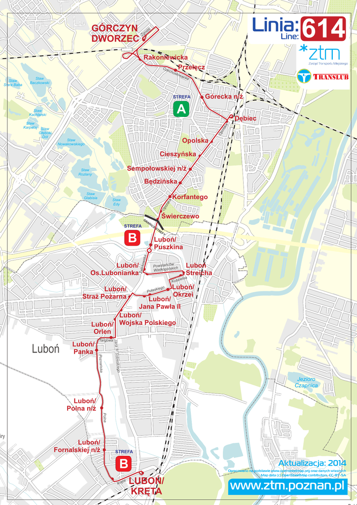 Linia: Line: 614 GÓRCZYN goda Z DWORZEC Rakoniewicka Cze Przełęcz ch osł ack a lsk a Dębiec Op o Staw Karpetaj Staw Głęboki Dół Górecka n/ż A Staw Kachlarski Opolska Staw Nowakowskiego Cieszyńska Sempołowskiej n/ż Staw Rozlany Będzińska Staw Glabisia Korfantego Op o lsk a Staw Edy STREFA GR A Świerczewo NI CA ST R EF B Y wska Luboń/ Puszkina Luboń/ Os.Lubonianka Powstańców ich Wielkopolsk Luboń Streicha ielna Kośc Luboń/ Straż Pożarna Puła skieg o Luboń/ Okrzei Luboń/ Jana Pawła II Luboń/ Luboń/ Wojska Polskiego Orlen Targowa skiego Jana III Sobie Luboń Luboń/ Panka Poznańska Jezioro Czapnica Luboń/ Polna n/ż Polna Wiry ow STREFA Żabik o Staw Stara Baba Staw Baczkowski Luboń/ Fornalskiej n/ż STREFA B Krę ta Aktualizacja: 2014 LUBOŃ/ KRĘTA Czapury www.ztm.poznan.pl