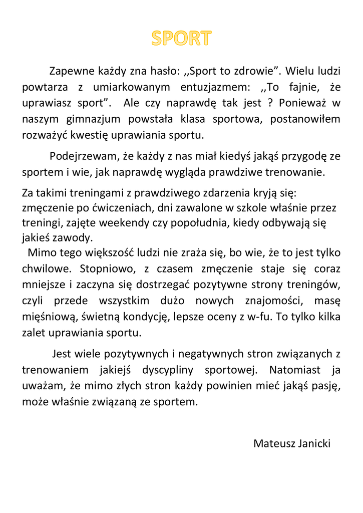 Zapewne każdy zna hasło: ,,Sport to zdrowie”. Wielu ludzi powtarza z umiarkowanym entuzjazmem: ,,To fajnie, że uprawiasz sport”. Ale czy naprawdę tak jest ? Ponieważ w naszym gimnazjum powstała klasa sportowa, postanowiłem rozważyć kwestię uprawiania sportu. Podejrzewam, że każdy z nas miał kiedyś jakąś przygodę ze sportem i wie, jak naprawdę wygląda prawdziwe trenowanie. Za takimi treningami z prawdziwego zdarzenia kryją się: zmęczenie po ćwiczeniach, dni zawalone w szkole właśnie przez treningi, zajęte weekendy czy popołudnia, kiedy odbywają się jakieś zawody. Mimo tego większość ludzi nie zraża się, bo wie, że to jest tylko chwilowe. Stopniowo, z czasem zmęczenie staje się coraz mniejsze i zaczyna się dostrzegać pozytywne strony treningów, czyli przede wszystkim dużo nowych znajomości, masę mięśniową, świetną kondycję, lepsze oceny z w-fu. To tylko kilka zalet uprawiania sportu. Jest wiele pozytywnych i negatywnych stron związanych z trenowaniem jakiejś dyscypliny sportowej. Natomiast ja uważam, że mimo złych stron każdy powinien mieć jakąś pasję, może właśnie związaną ze sportem. Mateusz Janicki