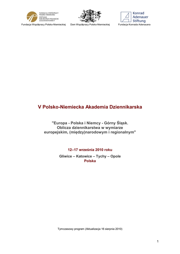 Fundacja Współpracy Polsko-Niemieckiej Dom Współpracy Polsko-Niemieckiej Fundacja Konrada Adenauera V Polsko-Niemiecka Akademia Dziennikarska "Europa - Polska i Niemcy - Górny Śląsk. Oblicza dziennikarstwa w wymiarze europejskim, (między)narodowym i regionalnym" 12–17 września 2010 roku Gliwice – Katowice – Tychy – Opole Polska Tymczasowy program (Aktualizacja 16 sierpnia 2010) 1 Fundacja Współpracy Polsko-Niemieckiej Dom Współpracy Polsko-Niemieckiej Fundacja Konrada Adenauera Niedziela, 12 września Witamy w Gliwicach 16.00 „A ty kim jesteś? - Und wer bist Du?“ (warsztaty integracyjne) Magdalena Mazik-Gorzelańczyk, trenerka 18.00 Zakwaterowanie i kolacja 19.00 „Uwaga, uwaga, tu Gliwice …“ (wycieczka do Radiostacji gliwickiej) Andrzej Jarczewski, klucznik Radiostacji gliwickiej Poniedziałek, 13 września Europa 09.30 Media. Europa – Polska i Niemcy – Górny Śląsk. Wprowadzenie (referat i rozmowa) Dr hab. Zbigniew Oniszczuk, zastępca Dyrektora Międzywydziałowych Indywidualnych Studiów Humanistycznych w Zakładie Dziennikarstwa Uniwersytetu Śląskiego w Katowicach (wystosowano zaproszenie) 10.15 Przerwa 10.30 Sytuacja mediów w Europie - część 1 (dyskusja) Marek Orzechowski, korespondent Polsat w Brukseli Michael Stabenow, korespondent dziennika Frankfurter Allgemeine Zeitung (FAZ) w Brukseli (wystosowano zaproszenie) Maciej Zglinicki, redaktor presseurop.eu/pl oraz Forum Moderacja: Robin Lautenbach, dziennikarz studia ARD w Berlinie (wystosowano zaproszenie) 11.30 Przerwa kawowa 11.45 Sytuacja mediów w Europie - część 2 (dyskusja) Marek Orzechowski, korespondent Polsat w Brukseli Michael Stabenow, korespondent dziennika Frankfurter Allgemeine Zeitung (FAZ) w Brukseli (wystosowano zaproszenie) Maciej Zglinicki, redaktor presseurop.eu/pl oraz Forum Moderacja: Robin Lautenbach, dziennikarz studia ARD w Berlinie (wystosowano zaproszenie) 13.00 Przerwa obiadowa 2 Fundacja Współpracy Polsko-Niemieckiej Dom Współpracy Polsko-Niemieckiej Fundacja Konrada Adenauera 14.00 Czy niemiecki kapitał dominuje na rynku mediów w Europie Środkowej i Wschodniej? (dyskusja) Michał Kobosko, wydawca Newsweek Polska (Axel Springer) Witold Woźniak, prezes Grupy Bauer Media (wystosowano zaproszenie) Tomasz Józefacki, członek Zarządu Agora S.A. (wystosowano zaproszenie) Moderacja: Robin Lautenbach, dziennikarz studia ARD w Berlinie (wystosowano zaproszenie) 15.15 Przerwa 15.30 Europa z perspektywy korespondentów zagranicznych. (Prze-)Życie w Brukseli. (Dyskusja) Marek Orzechowski, korespondent telewizji Polsat w Brukseli Michael Stabenow, korespondent dziennika Frankfurter Allgemeine Zeitung (FAZ) w Brukseli (wystosowano zaproszenie) Moderacja: Robin Lautenbach, dziennikarz studia ARD w Berlinie (wystosowano zaproszenie) 16.30 Przerwa kawowa 17.00 cafebabel.com jako przykład dziennikarstwa europejskiego (warsztat) Aleksandra Sygiel, redaktorka polskiej edycji cafebabel.com Katharina Kloss, redaktorka niemieckiej edycji cafebabel.com 19.30 Kolacja Wtorek, 14 września Niemcy i Polska 09.00 Radio Plus Śląsk (wizyta w redakcji) 10.45 Przerwa kawowa 11.00 20 lat po upadku żelaznej kurtyny. Przedstawienie polityki historycznej Polski i Niemiec w mediach (dyskusja) Ulrich Adrian, korespondent telewizji publicznej ARD Studio w Warszawie Adam Krzemiński, redaktor tygodnika Polityka, publicysta NN Moderacja: Bartosz Wieliński, dziennikarz Gazety Wyborczej 12.15 Demistyfikacja środków masowego przekazu: www.bildblog.de (referat i rozmowa) Lukas Heinser, dziennikarz, kierownik BILDblog (wystosowano zaproszenie) 3 Fundacja Współpracy Polsko-Niemieckiej Dom Współpracy Polsko-Niemieckiej Fundacja Konrada Adenauera 13.15 Obiad 14.00 Etyka dziennikarska w wieku globalizacji w Polsce i Niemczech (dyskusja) Janina Jankowska, dziennikarka, przewodnicząca Rady Programowej Prof. dr hab. Paweł Czarnecki, etyk, profesor nadzwyczajny na Wydziale Pedagogiki i Psychologii Wyższej Szkoły Ekonomii i Innowacji w Lublinie Lukas Heinser, dziennikarz, kierownik BILDblog (wystosowano zaproszenie) Moderacja: Bartosz Wieliński, dziennikarz Gazeta Wyborcza 15.30 Czas wolny 17.30 Polsko-Niemiecka Nagroda Dziennikarska. Przykłady polsko-niemieckiego dziennikarstwa (projekcja filmu / odczyt i dyskusja) „Dom na granicy“ (audycja telewizyjna) - Ewa Misiewicz, reżyserka, producentka Fama Films) NN Moderacja: Bartosz Wieliński, Dziennikarz Gazety Wyborczej 20.00 Kolacja Środa, 15 września Region Górnego Śląska 1 09.00 Wyjazd do Tychów 10.00 Gazeta Wyborcza Katowice (wizyta w redakcji i zwiedzanie drukarni Agora) 12.00 Przejazd do Katowic 13.00 Obiad 14.30 TV Silesia (wizyta w redakcji) 15.00 Krok po kroku: Wiadomości (warsztat) 16.00 Polskie Radio Katowice (wizyta w redakcji) 16.30 Krok po kroku: Przy mikrofonie (warsztat) 17.30 Powrót do Gliwic 19.0 Kolacja 4 Fundacja Współpracy Polsko-Niemieckiej Dom Współpracy Polsko-Niemieckiej Fundacja Konrada Adenauera Czwartek, 16 września Region Górnego Śląska 2 09.00 Wyjazd do Opola 10.30 Pro Futura (wizyta w Zespole Producenckim „Pro Futura”) 11.30 Ślązacy, Polacy, Europejczycy? Ankieta telewizyjna i radiowa na temat tożsamości regionalnej (warsztat) 11.30 13.00 Część 1: Wprowadzenie techniczne i szukanie tematu Obiad 14.00 Część 2: Ankieta wśród przechodniów w centrum Opola 16.00 Część 3: Przetwarzanie nagrań 17.30 Część 4: Prezentacja nagrań 18.30 Powrót do Gliwic 20.00 Kolacja Piątek, 17 września Europa - Polska i Niemcy - Region 10.00 Dziennikarstwo obywatelskie w służbie regionu? Kraju? Europy? Kontrowersje i perspektywy (referat i rozmowa) Tomasz Kowalski, redaktor naczelny wiadomosci24.pl 11.30 Podsumowanie i ewaluacja Akademii 13.00 Obiad 14.00 Pożegnanie i odjazd uczestników 5