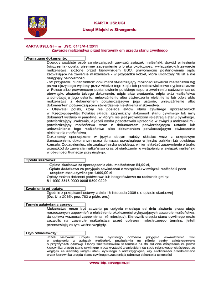 KARTA USŁUGI Urząd Miejski w Strzegomiu KARTA USŁUGI – nr USC. 0143/K-1/2011 Zawarcie małżeństwa przed kierownikiem urzędu stanu cywilnego Wymagane dokumenty: Dowody osobiste osób zamierzających zawrzeć związek małżeński, dowód wniesienia (uiszczenia) opłaty, pisemne zapewnienie o braku okoliczności wyłączających zawarcie małżeństwa, złożone przed kierownikiem USC, prawomocne postanowienie sądu zezwalające na zawarcie małżeństwa - w przypadku kobiet, które ukończyły 16 lat a nie osiągnęły pełnoletności. - W przypadku cudzoziemca: dokument stwierdzający możność zawarcia małżeństwa wg prawa ojczystego wydany przez władze tego kraju lub przedstawicielstwo dyplomatyczne w Polsce albo prawomocne postanowienie polskiego sądu o zwolnieniu cudzoziemca od obowiązku złożenia takiego dokumentu, odpis aktu urodzenia, odpis aktu małżeństwa z adnotacją o jego ustaniu, unieważnieniu albo stwierdzenia nieistnienia lub odpis aktu małżeństwa z dokumentem potwierdzającym jego ustanie, unieważnienie albo dokumentem potwierdzającym stwierdzenie nieistnienia małżeństwa. - Obywatel polski, który nie posiada aktów stanu cywilnego sporządzonych w Rzeczypospolitej Polskiej składa: zagraniczny dokument stanu cywilnego lub inny dokument wydany w państwie, w którym nie jest prowadzona rejestracja stanu cywilnego, potwierdzający urodzenie, a jeżeli osoba pozostawała uprzednia w związku małżeńskim potwierdzający małżeństwo wraz z dokumentem potwierdzającym ustanie lub unieważnienie tego małżeństwa albo dokumentem potwierdzającym stwierdzenie nieistnienia małżeństwa, Dokumenty sporządzone w języku obcym należy składać wraz z urzędowym tłumaczeniem, dokonanym przez tłumacza przysięgłego w języku polskim lub polskiego konsula. Cudzoziemiec, nie znający języka polskiego, winien składać zapewnienie o braku przeszkód do zawarcia małżeństwa oraz oświadczenie o wstąpieniu w związek małżeński w obecności tłumacza przysięgłego. Opłata skarbowa: - Opłata skarbowa za sporządzenie aktu małżeństwa: 84,00 zł, - Opłata dodatkowa za przyjęcie oświadczeń o wstąpieniu w związek małżeński poza urzędem stanu cywilnego: 1.000,00 zł Opłaty można dokonać gotówkowo lub bezgotówkowo na rachunek gminy: 81 1090 2343 0000 0005 9800 0229 Zwolnienia od opłaty: Zgodnie z przepisami ustawy z dnia 16 listopada 2006 r. o opłacie skarbowej (Dz. U. z 2015r. poz. 783 z późn. zm.) Termin załatwiania sprawy: Małżeństwo może być zawarte po upływie miesiąca od dnia złożenia przez oboje narzeczonych zapewnień o nieistnieniu okoliczności wyłączających zawarcie małżeństwa, do upływu ważności zapewnienia (6 miesięcy). Kierownik urzędu stanu cywilnego może zezwolić na zawarcie małżeństwa przed upływem miesięcznego terminu, jeżeli przemawiają za tym ważne względy. Tryb odwoławczy: Jeżeli kierownik urzędu stanu cywilnego odmawia przyjęcia oświadczenia woli o wstąpieniu w związek małżeński, powiadamia na piśmie osoby zainteresowane o przyczynach odmowy. Osoby zainteresowane w terminie 14 dni od dnia doręczenia im pisma kierownika urzędu stanu cywilnego mogą wystąpić z wnioskiem do sądu rejonowego właściwego ze względu na siedzibę urzędu stanu cywilnego o rozstrzygnięcie, czy okoliczności przedstawione przez kierownika urzędu stanu cywilnego uzasadniają odmowę dokonania czynności www.bip.strzegom.pl Uwagi: Osoby zamierzające zawrzeć małżeństwo powinny złożyć lub przedstawić kierownikowi urzędu stanu cywilnego dokumenty niezbędne do zawarcia małżeństwa. Przy zgłoszeniu zamiaru zawarcia małżeństwa narzeczeni podpisują przed kierownikiem urzędu stanu cywilnego zapewnienie o braku przeszkód prawnych do zawarcia związku małżeńskiego. W momencie składania zapewnienia narzeczeni dokonują wyboru nazwisk noszonych po zawarciu związku małżeńskiego przez małżonków oraz dzieci zrodzonych z tego małżeństwa. Na wniosek osoby zamierzającej zawrzeć małżeństwo kierownik urzędu stanu cywilnego przyjmuje oświadczenie o wstąpieniu w związek małżeński poza urzędem stanu cywilnego, jeżeli wskazane we wniosku miejsce zapewnia zachowanie uroczystej formy jego zawarcia oraz bezpieczeństwo osób obecnych przy składaniu oświadczeń o wstąpieniu w związek małżeński. Miejsce składania dokumentów: Urząd Stanu Cywilnego ul. Świdnicka 17, tel. 74 8550-730 (czynny: poniedziałek, środa, czwartek od godz. 8 ºº do godz.16 ºº, wtorek od godz.8ºº do godz. 17³º, piątek od godz. 8ºº do godz. 14³º). UWAGA – czas pracy Urzędu w miesiącach: lipiec i sierpień: poniedziałek, środa, czwartek od godz. 7ºº do godz.15ºº, wtorek od godz.7ºº do godz. 16³º, piątek od godz. 7ºº do godz. 13³º. Miejsce załatwienia sprawy: Małżeństwo można zawrzeć w dowolnie wybranym urzędzie stanu cywilnego w Polsce. Podstawa prawna: Ustawa z dnia 28 listopada 2014 r. Prawo o aktach stanu cywilnego (Dz. U. z 2014 r. poz. 1741, z późn. zm.), Ustawa z dnia 25 lutego 1964 r. Kodeks rodzinny i opiekuńczy (tekst jednolity Dz. U. z 2015 r. poz. 2082, z późn. zm.), Rozporządzenie Ministra Spraw Wewnętrznych z dnia 9 lutego 2015 r. w sprawie sposobu prowadzenia rejestru stanu cywilnego oraz akt zbiorowych rejestracji stanu cywilnego (Dz. U. z 2015 r. poz. 225 z późn. zm.). Rozporządzenie Ministra Spraw Wewnętrznych z dnia 22 stycznia 2015 r. w sprawie opłaty dodatkowej za przyjęcie oświadczeń o wstąpieniu w związek małżeński poza urzędem stanu cywilnego (Dz. U. z 2015 r. poz. 180). Forma załatwienia sprawy: Dokumentem stwierdzającym zawarcie małżeństwa jest akt małżeństwa sporządzony w USC, z którego małżonkowie otrzymują jeden odpis z urzędu (bezpłatnie). Sposób odebrania dokumentu: Sporządzenie aktu małżeństwa Wejście w życie karty usługi Rejestr zmian 06.06.2005r. Data zmiany: 23.11.2016r. w