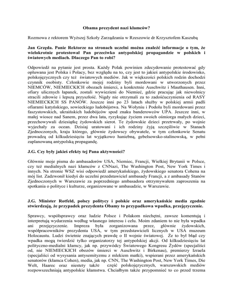 Obama prezydent nazi kłamców? Rozmowa z rektorem WyŜszej Szkoły Zarządzania w Rzeszowie dr Krzysztofem Kaszubą Jan Grzęda. Panie Rektorze na stronach uczelni moŜna znaleźć informacje o tym, Ŝe wielokrotnie protestował Pan przeciwko antypolskiej propagandzie w polskich i światowych mediach. Dlaczego Pan to robi? Odpowiedź na pytanie jest prosta. KaŜdy Polak powinien zdecydowanie protestować gdy opluwana jest Polska i Polacy, bez względu na to, czy jest to jakieś antypolskie środowisko, polskojęzycznych czy teŜ światowych mediów. Jak w większości polskich rodzin dochodzi czynnik osobisty. Członkowie mojej rodziny byli mordowani w utworzonych przez NIEMCÓW, NIEMIECKICH obozach śmierci, a konkretnie Auschwitz i Mauthausen. Inni, ofiary ulicznych łapanek, zostali wywiezieni do Niemieć, gdzie pracując jak niewolnicy stracili zdrowie i lepszą przyszłość. Nigdy nie otrzymali za to zadośćuczynienia od RASY NIEMIECKICH SS PANÓW. Jeszcze inni po 23 latach słuŜby w polskiej armii padli ofiarami katyńskiego, sowieckiego ludobójstwa. Na Wołyniu i Podolu byli mordowani przez faszystowskich, ukraińskich ludobójców spod znaku banderowców UPA. Jeszcze inni, w małej wiosce nad Sanem, przez dwa lata, ryzykując Ŝyciem swoich ośmiorga małych dzieci, przechowywali dziesiątkę Ŝydowskich sierot. Te Ŝydowskie dzieci przetrwały, po wojnie wyjechały za ocean. Dzisiaj uratowani i ich rodziny Ŝyją szczęśliwie w Stanach Zjednoczonych, kraju którego, głównie Ŝydowscy obywatele, w tym członkowie Senatu prowadzą od kilkudziesięciu lat wyjątkowo haniebną, gebelsowsko-stalinowską, w pełni zaplanowaną antypolską propagandę. J.G. Czy były jakieś efekty tej Pana aktywności? Głównie moje pisma do ambasadorów USA, Niemiec, Francji, Wielkiej Brytanii w Polsce, czy teŜ medialnych nazi kłamców z CNNazi, The Washington Post, New York Times i innych. Na stronie WSZ wisi odpowiedź amerykańskiego, Ŝydowskiego senatora Cohena na mój list. Zadzwonił kiedyś do uczelni przedstawiciel ambasady Francji, a z ambasady Stanów Zjednoczonych w Warszawie za poprzedniego ambasadora otrzymywałem zaproszenia na spotkania o polityce i kulturze, organizowane w ambasadzie, w Warszawie. J.G. Minister Rotfeld, polscy politycy i polskie oraz amerykańskie media zgodnie stwierdzają, Ŝe przypadek prezydenta Obamy to przypadkowa wpadka, przejęzyczenie. Sprawcy, współsprawcy oraz ludzie Polsce i Polakom niechętni, zawsze komentują i interpretują wydarzenia według własnego interesu i celu. Moim zdaniem to nie była wpadka ani przejęzyczenie. Impreza była zorganizowana przez, głównie Ŝydowskich, współpracowników prezydenta USA, w tym przedstawicieli licznych w USA muzeum Holocaustu. Ludzi świetnie znających prawdę o II wojnie światowej. śe to był błąd czy wpadka mogą twierdzić tylko organizatorzy tej antypolskiej akcji. Od kilkudziesięciu lat polityczno-medialni kłamcy, jak np. przywódcy Światowego Kongresu śydów (specjaliści od, nie NIEMIECKICH obozów śmierci w Auschwitz i Birkenau), premierzy Izraela (specjaliści od wysysania antysemityzmu z mlekiem matki), wspierani przez amerykańskich senatorów (kłamca Cohen), media, jak np. CNN, The Washington Post, New York Times, Die część polskojęzycznych, warszawskich mediów Welt, Haarec oraz niestety takŜe rozpowszechniają antypolskie kłamstwa. Chciałbym takŜe przypomnieć to co przed trzema lata przemilczały polskie media. Na Westerplatte w 70 rocznicę ludobójczego ataku Niemiec na Polskę premier Tusk, przedstawił zebranym tam prezydentom i premierom najwaŜniejszych państw świata, oraz oczywiście światowym mediom, stworzoną przez siebie nową teorię, Ŝe to nie NIEMCY, ale II wojna światowa zbudowała obozy śmierci. A skoro większość obozów NIEMCY zbudowali na okupowanej polskiej ziemi, to świat kojarzy te NIEMIECKIE OBOZY ŚMIERCI z Polakami i Polską. Nic dziwnego, Ŝe od tego czasu premier Tusk otrzymał od NIEMCÓW wszystkie moŜliwe, najwaŜniejsze, niemieckie krzyŜe i ordery, w tym ostatnio medal imienia niemiecko-Ŝydowskiego polityka zwalczającego Polskę i Polaków. A proszę się zastanowić co zrobił minister Rotfeld, uratowany kiedyś przez Polaków. Najpierw bił brawo Obamie kłamcy, a dopiero później po rozmowach z organizatorami spotkania zaczął mówić o nieszczęśliwym o przejęzyczeniu. A jak wynika z wywiadu opublikowanego przez Rzeczpospolią z ministrem Rotfeldem, przytaknął on ambasadorowi USA w Polsce, Feinsteinowi, który stwierdził, Ŝe przemówienie prezydenta Obamy było świetne i być moŜe brakło tam tylko słowa nazi. J.G. Jakie są Pana zdaniem źródła tej antypolskiej propagandy? Co najmniej kilka. Nie wszyscy wiedzą, Ŝe w czasie II wojny światowej Amerykanie, w tym społeczność amerykańskich śydów, nie była zainteresowana przyjmowaniem Ŝydowskich uciekinierów z okupowanej przez NIEMCÓW Europy. Po wojnie Ci, którzy byli przeciw, nagle otworzyli serca i kieszenie na kasę i zaczęli szukać winnych. Wspólnie z NIEMCAMI i STALINEM znaleźli ... Polaków (mord w Kielcach 4 lipca 1946 roku !!!, w dzień Święta Niepodległości Stanów Zjednoczonych – czysty przypadek?) Nie wszyscy wiedzą, Ŝe po II wojnie światowej wielu spośród kilkudziesięciu tysięcy Ŝydowskich Ŝołnierzy Hitlera (o czym piszą amerykańscy naukowcy) zamieniło mundury SS i gestapo na pasiaki i jako ofiary holocaustu osiedlili się w USA. To między innymi oni i ich dzieci opluwają Polskę i Polaków. Ich elementarz to The Complete Mouse, gebelsowskostalinowski antypolski paszkwil Arta Spiegelmana. To z tego komiksu, o Ŝydowskich myszach, niemieckich kotach i polskich świniach, dzieci ministra Sikorskiego, uczniowie w amerykańskich szkołach podstawowych i śydzi na całym świecie uczą się historii II wojny światowej. I niestety rząd i MSZ RP milcząc, wspiera te antypolskie działania, równocześnie ogranicza