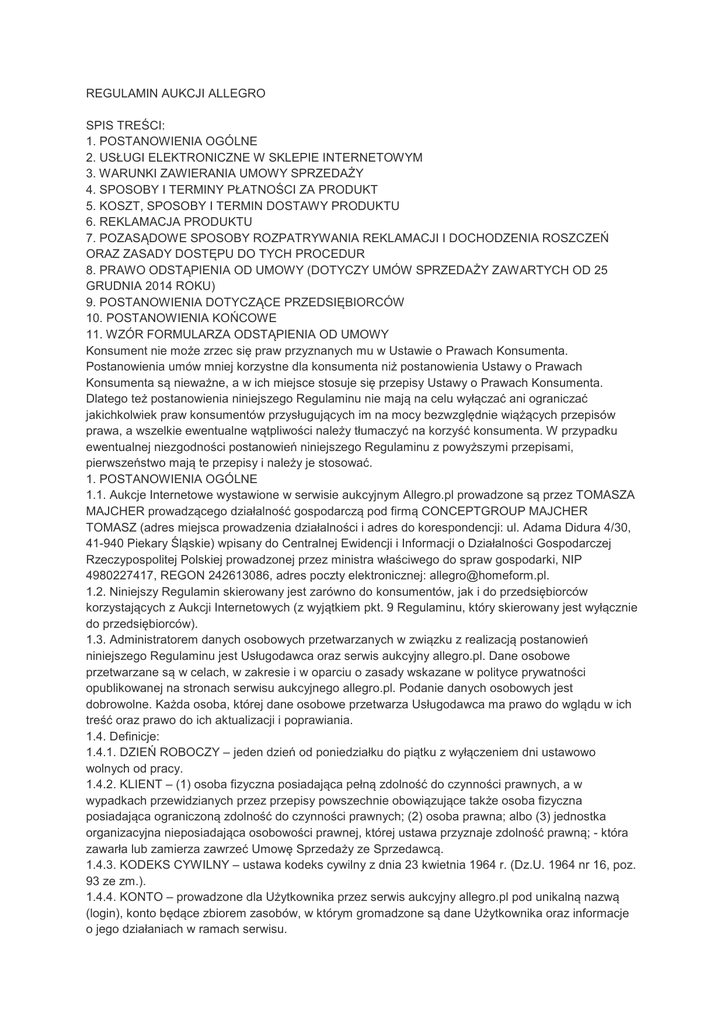 REGULAMIN AUKCJI ALLEGRO SPIS TREŚCI: 1. POSTANOWIENIA OGÓLNE 2. USŁUGI ELEKTRONICZNE W SKLEPIE INTERNETOWYM 3. WARUNKI ZAWIERANIA UMOWY SPRZEDAŻY 4. SPOSOBY I TERMINY PŁATNOŚCI ZA PRODUKT 5. KOSZT, SPOSOBY I TERMIN DOSTAWY PRODUKTU 6. REKLAMACJA PRODUKTU 7. POZASĄDOWE SPOSOBY ROZPATRYWANIA REKLAMACJI I DOCHODZENIA ROSZCZEŃ ORAZ ZASADY DOSTĘPU DO TYCH PROCEDUR 8. PRAWO ODSTĄPIENIA OD UMOWY (DOTYCZY UMÓW SPRZEDAŻY ZAWARTYCH OD 25 GRUDNIA 2014 ROKU) 9. POSTANOWIENIA DOTYCZĄCE PRZEDSIĘBIORCÓW 10. POSTANOWIENIA KOŃCOWE 11. WZÓR FORMULARZA ODSTĄPIENIA OD UMOWY Konsument nie może zrzec się praw przyznanych mu w Ustawie o Prawach Konsumenta. Postanowienia umów mniej korzystne dla konsumenta niż postanowienia Ustawy o Prawach Konsumenta są nieważne, a w ich miejsce stosuje się przepisy Ustawy o Prawach Konsumenta. Dlatego też postanowienia niniejszego Regulaminu nie mają na celu wyłączać ani ograniczać jakichkolwiek praw konsumentów przysługujących im na mocy bezwzględnie wiążących przepisów prawa, a wszelkie ewentualne wątpliwości należy tłumaczyć na korzyść konsumenta. W przypadku ewentualnej niezgodności postanowień niniejszego Regulaminu z powyższymi przepisami, pierwszeństwo mają te przepisy i należy je stosować. 1. POSTANOWIENIA OGÓLNE 1.1. Aukcje Internetowe wystawione w serwisie aukcyjnym Allegro.pl prowadzone są przez TOMASZA MAJCHER prowadzącego działalność gospodarczą pod firmą CONCEPTGROUP MAJCHER TOMASZ (adres miejsca prowadzenia działalności i adres do korespondencji: ul. Adama Didura 4/30, 41-940 Piekary Śląskie) wpisany do Centralnej Ewidencji i Informacji o Działalności Gospodarczej Rzeczypospolitej Polskiej prowadzonej przez ministra właściwego do spraw gospodarki, NIP 4980227417, REGON 242613086, adres poczty elektronicznej: [email protected]. 1.2. Niniejszy Regulamin skierowany jest zarówno do konsumentów, jak i do przedsiębiorców korzystających z Aukcji Internetowych (z wyjątkiem pkt. 9 Regulaminu, który skierowany jest wyłącznie do przedsiębiorców). 1.3. Administratorem danych osobowych przetwarzanych w związku z realizacją postanowień niniejszego Regulaminu jest Usługodawca oraz serwis aukcyjny allegro.pl. Dane osobowe przetwarzane są w celach, w zakresie i w oparciu o zasady wskazane w polityce prywatności opublikowanej na stronach serwisu aukcyjnego allegro.pl. Podanie danych osobowych jest dobrowolne. Każda osoba, której dane osobowe przetwarza Usługodawca ma prawo do wglądu w ich treść oraz prawo do ich aktualizacji i poprawiania. 1.4. Definicje: 1.4.1. DZIEŃ ROBOCZY – jeden dzień od poniedziałku do piątku z wyłączeniem dni ustawowo wolnych od pracy. 1.4.2. KLIENT – (1) osoba fizyczna posiadająca pełną zdolność do czynności prawnych, a w wypadkach przewidzianych przez przepisy powszechnie obowiązujące także osoba fizyczna posiadająca ograniczoną zdolność do czynności prawnych; (2) osoba prawna; albo (3) jednostka organizacyjna nieposiadająca osobowości prawnej, której ustawa przyznaje zdolność prawną; - która zawarła lub zamierza zawrzeć Umowę Sprzedaży ze Sprzedawcą. 1.4.3. KODEKS CYWILNY – ustawa kodeks cywilny z dnia 23 kwietnia 1964 r. (Dz.U. 1964 nr 16, poz. 93 ze zm.). 1.4.4. KONTO – prowadzone dla Użytkownika przez serwis aukcyjny allegro.pl pod unikalną nazwą (login), konto będące zbiorem zasobów, w którym gromadzone są dane Użytkownika oraz informacje o jego działaniach w ramach serwisu. 1.4.5. PRODUKT – dostępna w sprzedaży aykcyjnej rzecz ruchoma będąca przedmiotem Umowy Sprzedaży między Klientem a Sprzedawcą. 1.4.6. REGULAMIN – niniejszy regulamin aukcji. 1.4.7. SPRZEDAWCA; USŁUGODAWCA – TOMASZ MAJCHER prowadzący działalność gospodarczą pod firmą CONCEPTGROUP MAJCHER TOMASZ (adres miejsca prowadzenia działalności i adres do korespondencji: ul. Adama Didura 4/30, 41-940 Piekary Śląskie) wpisany do Centralnej Ewidencji i Informacji o Działalności Gospodarczej Rzeczypospolitej Polskiej prowadzonej przez ministra właściwego do spraw gospodarki, NIP 4980227417, REGON 242613086, adres poczty elektronicznej: [email protected]. 1.4.8. UMOWA SPRZEDAŻY – umowa sprzedaży Produktu zawierana albo zawarta między Klientem a Sprzedawcą za pośrednictwem serwisu aukcyjnego. 1.4.9. USŁUGA ELEKTRONICZNA – usługa świadczona drogą elektroniczną przez Usługodawcę na rzecz Usługobiorcy za pośrednictwem serwisu aukcyjnego. 1.4.10. USŁUGOBIORCA – (1) osoba fizyczna posiadająca pełną zdolność do czynności prawnych, a w wypadkach przewidzianych przez przepisy powszechnie obowiązujące także osoba fizyczna posiadająca ograniczoną zdolność do czynności prawnych; (2) osoba prawna; albo (3) jednostka organizacyjna nieposiadająca osobowości prawnej, której ustawa przyznaje zdolność prawną; korzystająca lub zamierzająca korzystać z Usługi Elektronicznej. 1.4.11. USTAWA O PRAWACH KONSUMENTA, USTAWA – ustawa z dnia 30 maja 2014 r. o prawach konsumenta (Dz.U. 2014 poz. 827 ze zm.) 1.4.12. ZAMÓWIENIE - oświadczenie woli Klienta składne za pomocą serwisu aukcyjnego i zmierzające bezpośrednio do zawarcia Umowy Sprzedaży Produktu ze Sprzedawcą. 2. USŁUGI ELEKTRONICZNE W SKLEPIE INTERNETOWYM 2.1. Wymagania techniczne niezbędne do współpracy z systemem teleinformatycznym, którym posługuje się Usługodawca: (1) komputer, laptop lub inne urządzenie multimedialne z dostępem do Internetu; (2) dostęp do poczty elektronicznej; (3) przeglądarka internetowa: Mozilla Firefox w wersji 17.0 i wyższej lub Internet Explorer w wersji 10.0 i wyższej, Opera w wersji 12.0 i wyższej, Google Chrome w wersji 23.0. i wyższej, Safari w wersji 5.0 i wyższej; (4) zalecana minimalna rozdzielczość ekranu: 1024x768; (5) włączenie w przeglądarce internetowej możliwości zapisu plików Cookies oraz obsługi Javascript. 2.2. Usługobiorca obowiązany jest do korzystania ze serwisu aukcyj