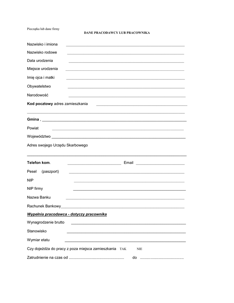Pieczątka lub dane firmy DANE PRACODAWCY LUB PRACOWNIKA Nazwisko i imiona _________________________________________________________________________ Nazwisko rodowe ________________________________________________________________________ Data urodzenia _______________________________________________________________________ Miejsce urodzenia _________________________________________________________________________ Imię ojca i matki _________________________________________________________________________ Obywatelstwo ________________________________________________________________________ Narodowość ________________________________________________________________________ Kod pocztowy adres zamieszkania ________________________________________________________ _________________________________________________________________________________________________ Gmina , ____________________________________________________________________ Powiat _________________________________________________________________________________ Województwo _______________________________________________________________ Adres swojego Urzędu Skarbowego ___________________________________________________________________________ Telefon kom. Pesel (paszport) _________________________________ Email ______________________________ _______________________________________________________________________ NIP ____________________________________________________________________ NIP firmy _____________________________________________________ Nazwa Banku _________________________________________________________________________ Rachunek Bankowy____________________________________________________________________________ Wypełnia pracodawca - dotyczy pracownika Wynagrodzenie brutto Stanowisko Wymiar etatu ______________________________________________________ ________________________________________________________ _________________________________________________________ Czy dojeżdża do pracy z poza miejsca zamieszkania TAK Zatrudnienie na czas od .................................................... NIE do .........................................