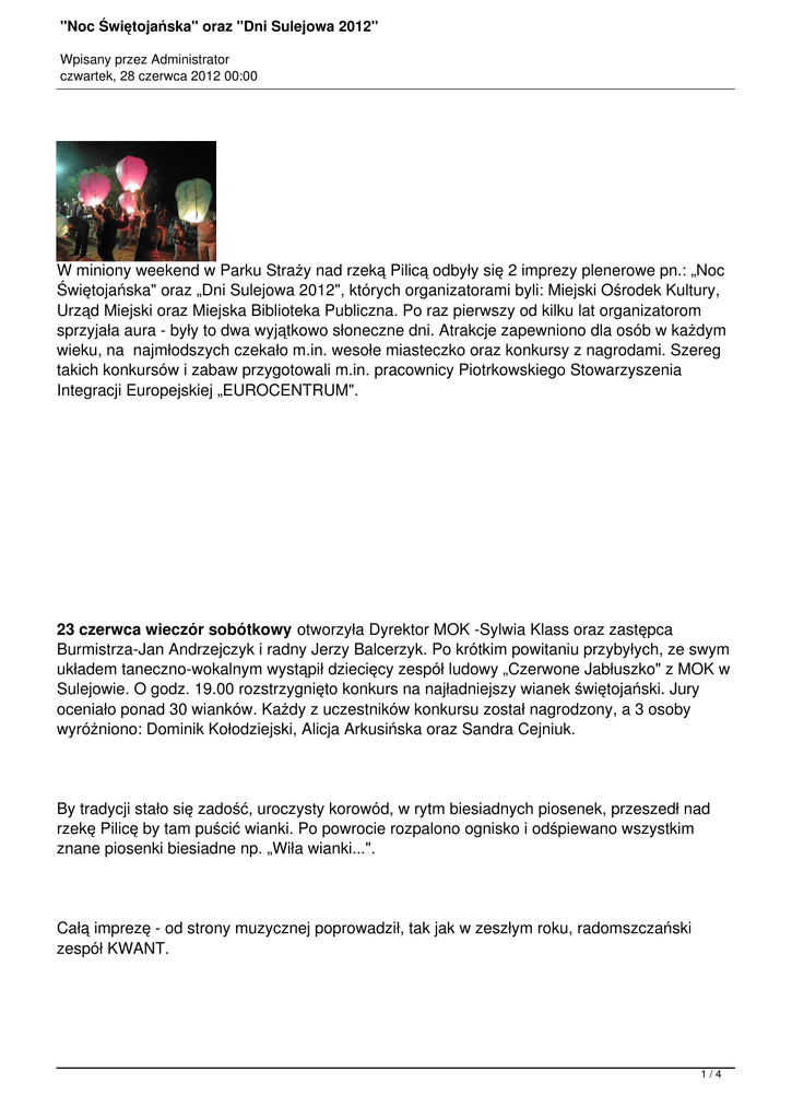 Świętojańska" oraz „Dni Sulejowa 2012", których organizatorami byli: Miejski Ośrodek Kultury,