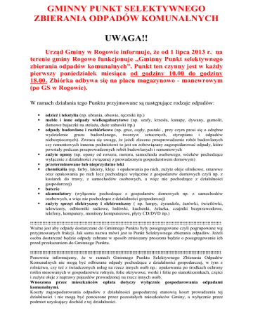 GMINNY PUNKT SELEKTYWNEGO ZBIERANIA ODPADÓW KOMUNALNYCH UWAGA!! Urząd Gminy w Rogowie informuje, że od 1 lipca 2013 r. na terenie gminy Rogowo funkcjonuje „Gminny Punkt selektywnego zbierania odpadów komunalnych”. Punkt ten czynny jest w każdy pierwszy poniedziałek miesiąca od godziny 10.00 do godziny 18.00. Zbiórka odbywa się na placu magazynowo - manewrowym (po GS w Rogowie). W ramach działania tego Punktu przyjmowane są następujące rodzaje odpadów: odzież i tekstylia (np. ubrania, obuwie, ręczniki itp.) meble i inne odpady wielkogabarytowe (np. szafy, krzesła, kanapy, dywany, gumolit, domowe bujaczki na stelażu, duże zabawki itp.) odpady budowlane i rozbiórkowe (np. gruz, cegły, pustaki , przy czym prosi się o odrębne wydzielenie gruzu budowlanego, tworzyw sztucznych, styropianu i odpadów niebezpiecznych). Zwraca się uwagę, że jeżeli zlecono przeprowadzenie robót budowlanych czy remontowych innemu podmiotowi to jest on zobowiązany zagospodarować odpady, które powstały podczas przeprowadzonych robót budowlanych i remontowych zużyte opony (np. opony od roweru, motoru, samochodu osobowego, wózków pochodzące wyłącznie z działalności związanej z prowadzonym gospodarstwem domowym) przeterminowane lub nieprzydatne leki chemikalia (np. farby, lakiery, kleje i opakowania po nich, zużyte oleje silnikowe, smarowe oraz opakowania po nich lecz pochodzące wyłącznie z gospodarstw domowych czyli np. z kosiarek do trawy, z samochodów osobowych, a więc nie pochodzące z działalności gospodarczej) baterie akumulatory (wyłącznie pochodzące z gospodarstw domowych np. z samochodów osobowych, a więc nie pochodzące z działalności gospodarczej) zużyty sprzęt elektryczny i elektroniczny ( np. lampy, żyrandole, żarówki, świetlówki, telewizory, odbiorniki radiowe, lodówki, kuchenki, żelazka, czajniki bezprzewodowe, telefony, komputery, monitory komputerowe, płyty CD/DVD itp.) !!!!!!!!!!!!!!!!!!!!!!!!!!!!!!!!!!!!!!!!!!!!!!!!!!!!!!!!!!!!!!!!!!!!!!!!!!!!!!!!!!!!!!!!!!!!!!!!!!!!!!!!!!!!!!!!!!!!!!!!!!! Ważne jest aby odpady dostarczane do Gminnego Punktu były posegregowane czyli pogrupowane wg przyjmowanych frakcji. Jak sama nazwa mówi jest to Punkt Selektywnego zbierania odpadów. Jeżeli osoba dostarczać będzie odpady zebrane w sposób zmieszany proszona będzie o posegregowanie ich przed przekazaniem do Gminnego Punktu. !!!!!!!!!!!!!!!!!!!!!!!!!!!!!!!!!!!!!!!!!!!!!!!!!!!!!!!!!!!!!!!!!!!!!!!!!!!!!!!!!!!!!!!!!!!!!!!!!!!!!!!!!!!!!!!!!!!!!!!!!!! Ponownie informujemy, że w ramach Gminnego Punktu Selektywnego Zbierania Odpadów Komunalnych nie mogą być odbierane odpady pochodzące z działalności gospodarczej, w tym z rolnictwa, czy też z świadczonych usług na rzecz innych osób np.: opakowania po środkach ochrony roślin stosowanych w gospodarstwie rolnym, folie okrywowe, worki i folie po sianokiszonkach, części i zużyte oleje z naprawy pojazdów prowadzonej na rzecz innych osób. Wnoszona przez mieszkańców opłata dotyczy wyłącznie gospodarowania odpadami komunalnymi. Koszty zagospodarowania odpadów z działalności gospodarczej stanowią koszt prowadzenia tej działalności i nie mogą być ponoszone przez pozostałych mieszkańców Gminy, a wyłącznie przez podmiot uzyskujący dochód z tej działalności.