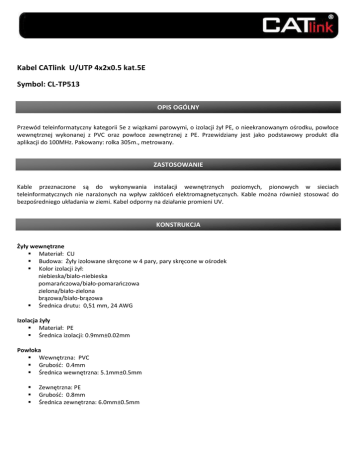 Kabel CATlink U/UTP 4x2x0.5 kat.5E Symbol: CL-TP513 OPIS OGÓLNY Przewód teleinformatyczny kategorii 5e z wiązkami parowymi, o izolacji żył PE, o nieekranowanym ośrodku, powłoce wewnętrznej wykonanej z PVC oraz powłoce zewnętrznej z PE. Przewidziany jest jako podstawowy produkt dla aplikacji do 100MHz. Pakowany: rolka 305m., metrowany. ZASTOSOWANIE Kable przeznaczone są do wykonywania instalacji wewnętrznych poziomych, pionowych w sieciach teleinformatycznych nie narażonych na wpływ zakłóceń elektromagnetycznych. Kable można również stosować do bezpośredniego układania w ziemi. Kabel odporny na działanie promieni UV. KONSTRUKCJA Żyły wewnętrzne Materiał: CU Budowa: Żyły izolowane skręcone w 4 pary, pary skręcone w ośrodek Kolor izolacji żył: niebieska/biało-niebieska pomarańczowa/biało-pomarańczowa zielona/biało-zielona brązowa/biało-brązowa Średnica drutu: 0,51 mm, 24 AWG Izolacja żyły Materiał: PE Średnica izolacji: 0.9mm±0.02mm Powłoka Wewnętrzna: PVC Grubość: 0.4mm Średnica wewnętrzna: 5.1mm±0.5mm Zewnętrzna: PE Grubość: 0.8mm Średnica zewnętrzna: 6.0mm±0.5mm DANE TECHNICZNE Impedancja falowa ( Ω ): 100±15 Ohm @ 1-250 MHz Asymetria pojemności względem ziemi (max): 1600 pF/km Szybkość propagacji (f> >1MHz): 66 % Max. napięcie pracy: 300 V (RMS) Zakres temperatur st. C Podczas pracy : -20 ÷ +70 Podczas układania: 0 ÷ +50 Przystosowanie do standardu: EIA/TIA5668B Certyfikat ROHS Częstotliwość (MHz) 1 4 10 16 20 25 31,25 62,5 100 POZOSTAŁE PARAMETRY TRANSMISYJNE Współczynnik Tłumienność NEXT PSNEXT tłumienia (dB) (dB/100m) (dB) (dB) 20,0 23,0 25,0 25,0 25,0 24,3 23,6 21,5 20,1 2,04 4,10 6,50 8,20 9,30 10,40 11,70 17,00 22,00 65,3 56,3 50,3 47,2 45,8 44,3 42,9 38,4 35,3 62,3 53,3 47,3 44,2 42,0 41,3 39,9 35,4 32,3 ELFEXT (dB) PSELFEXT (dB) 63,8 51,8 43,8 39,7 37,8 35,8 33,9 27,9 23,8 60,8 48,8 40,8 36,7 34,8 32,8 30,9 24,9 20,8