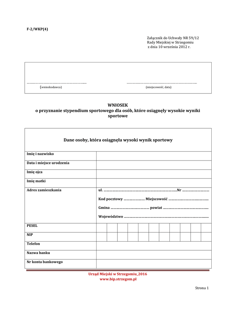 F-2/WKP(4) Załącznik do Uchwały NR 59/12 Rady Miejskiej w Strzegomiu z dnia 10 września 2012 r. …………………………………………………….... (wnioskodawca) ………………………………….…………………………….. (miejscowość, data) WNIOSEK o przyznanie stypendium sportowego dla osób, które osiągnęły wysokie wyniki sportowe Dane osoby, która osiągnęła wysoki wynik sportowy Imię i nazwisko Data i miejsce urodzenia Imię ojca Imię matki Adres zamieszkania ul. ……………………………………………………….………...Nr …………….………… Kod pocztowy …………………. Miejscowość …………………………..…….... Gmina ……………………….………… powiat ……………………………………….. Województwo ………………………………………….……….……………………..... PESEL NIP Telefon Nazwa banku Nr konta bankowego Urząd Miejski w Strzegomiu_2016 www.bip.strzegom.pl Strona 1 Dane klubu sportowego, do którego przynależy osoba, która osiągnęła wysoki wynik sportowy Nazwa klubu Adres Ul. ……………………………………………. Nr ………………………… Kod pocztowy ……………… Miejscowość ……………………. Województwo ………………………………………………………... Telefon/fax/e-mail Oświadczam, że powyższe dane są zgodne ze stanem faktycznym. Jednocześnie oświadczam, że o zmianach wynikających z wniosku powiadomię właściwą komórkę merytoryczną Urzędu Miejskiego w Strzegomiu przed wypłatą stypendium za miesiąc, w którym zaszła zmiana. Wyrażam zgodę na przetwarzanie moich danych osobowych w celach związanych z przyznaniem stypendium sportowego zgodnie z ustawą z dnia 29 sierpnia 1997 roku o ochronie danych osobowych ( Dz. U. z 2014 r. poz. 1182). Dane Wnioskodawcy Nazwa wnioskodawcy Adres Ul. …………………………………………. Nr ………………………….. Kod pocztowy ……………… Miejscowość ……………………. Województwo ………………………………………………………… Telefon/fax/e-mail Urząd Miejski w Strzegomiu_2016 www.bip.strzegom.pl Strona 2 Osiągnięcia sportowe osoby ubiegającej sie o przyznanie stypendium sportowego Dyscyplina …………………………………………………………………………………………………………………………….………….…………….. Kategoria wiekowa ………………………………………………………………………………………………………………………….….…………… Osiągnięte wyniki/ nazwa zawodów, termin/: ………………………………………………………………………………………………………………………………………………………………………… ………………………………………………………………………………………………………………………………………………………………………… ………………………………………………………………………………………………………………………………………………………………………… ………………………………………………………………………………………………………………………………………………………………………… ………………………………………………………………………………………………………………………………………………………………………… ………………………………………………………………………………………………………………………………………………………………………… ………………………………………………………………………………………………………………………………………………………………………… ………………………………………………………………………………………………………………………………………………………………………… ………………………………………………………………………………………………………………………………………………………………………… ………………………………………………………………………………………………………………………………………………………………………… ………………………………………………………………………………………………………………………………………………………………………… ………………………………………………………………………………………………………………………………………………………………………… …………………………………………………………… (podpis osoby wnioskującej) Urząd Miejski w Strzegomiu_2016 www.bip.strzegom.pl Strona 3 Strzegom, dnia …………………………………………………………… OŚWIADCZENIE Dane do PIT-u Nazwisko…………………………………………………………………………………………………………………….. Imię 1. ………………………………………………………… 2. …………..…………………………………………….. Imię Ojca ………………………………………………Imię Matki ……………………………………………….…... Miejsce ur. ………………………………………… data ur. ………………………………………………………...… PESEL ……………………………………………….. NIP …………