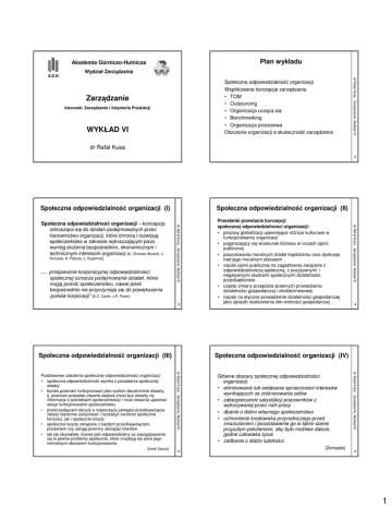 Plan wykładu Akademia Górniczo-Hutnicza Wydział Zarządzania Zarządzanie kierunek: Zarządzanie i Inżynieria Produkcji WYKŁAD VI dr Rafał Kusa, Zarządzanie, Wykład VI Społeczna odpowiedzialność organizacji Współczesne koncepcje zarządzania • TQM • Outsourcing • Organizacja ucząca się • Benchmarking • Organizacja procesowa Otoczenie organizacji a skuteczność zarządzania dr Rafał Kusa 2 Społeczna odpowiedzialność organizacji (I) „… przejawianie korporacyjnej odpowiedzialności społecznej oznacza podejmowanie działań, które mogą pomóc społeczeństwu, nawet jeżeli bezpośrednio nie przyczyniają się do powiększenia zysków korporacji” [S.C. Certo, J.P. Peter] 3 Społeczna odpowiedzialność organizacji (III) Główne obszary społecznej odpowiedzialności organizacji: • eliminowanie lub osłabianie sprzeczności interesów wynikających ze zróżnicowania celów • zabezpieczenie satysfakcji pracowników z wykonywanej przez nich pracy • dbanie o dobro własnego społeczeństwa • uchronienie środowiska przyrodniczego przed zniszczeniem i pozostawienie go w takim stanie przyszłym pokoleniom, aby było możliwe dalsze, godne człowieka życie • zadbanie o dobro ludzkości dr Rafał Kusa, Zarządzanie, Wykład VI [Keith Davis] 4 Społeczna odpowiedzialność organizacji (IV) dr Rafał Kusa, Zarządzanie, Wykład VI Podstawowe założenia społecznej odpowiedzialności organizacji: • społeczna odpowiedzialność wynika z posiadania społecznej władzy • biznes powinien funkcjonować jako system dwustronnie otwarty, tj. powinien posiadać otwarte wejścia (musi być otwarty na informacje o potrzebach społeczeństwa) i musi otwarcie ujawniać swoje funkcjonowanie społeczeństwu • przed podjęciem decyzji o rozpoczęciu jakiegoś przedsięwzięcia należy starannie oszacować i rozważyć zarówno społeczne korzyści, jak i społeczne koszty • społeczne koszty związane z każdym przedsięwzięciem, produktem czy usługą powinny obciążać klientów • tak jak obywatele, biznes jest odpowiedzialny za zaangażowanie się w pewne problemy społeczne, które znajdują się poza jego normalnym obszarem funkcjonowania. Przesłanki powstania koncepcji społecznej odpowiedzialności organizacji: • procesy globalizacji ujawniające różnice kulturowe w funkcjonowaniu organizacji • pogarszający się wizerunek biznesu w oczach opinii publicznej • poszukiwania moralnych źródeł kapitalizmu oraz dyskusje nad jego moralnym statusem • nacisk opinii publicznej na zagadnienia związane z odpowiedzialnością społeczną, z pozytywnymi i negatywnymi skutkami społecznymi działalności przedsiębiorstw • częste zmiany przepisów prawnych prowadzenia działalności gospodarczej i okołobiznesowej • nacisk na etyczne prowadzenie działalności gospodarczej jako sposób realizowania idei wolności gospodarczej dr Rafał Kusa, Zarządzanie, Wykład VI Korczak, A. Pakuła, J. Supernat] dr Rafał Kusa, Zarządzanie, Wykład VI Społeczna odpowiedzialność organizacji – koncepcja odnosząca się do działań podejmowanych przez kierownictwo organizacji, które chronią i rozwijają społeczeństwo w zakresie wykraczającym poza wymóg służenia bezpośrednim, ekonomicznym i technicznym interesom organizacji [A. Chrisidu-Budnik, J. Społeczna odpowiedzialność organizacji (II) [Żemigała] 5 6 1 Geneza nadzoru korporacyjnego 7 ORGANIZACJA dostawcy Nadzór korporacyjny – nadzór równoważący interesy wszystkich podmiotów powiązanych z funkcjonowaniem organizacji i tworzenie mechanizmów, które pozwalają uniknąć działań menedżerów niezgodnych z interesami właścicieli, wierzycieli i innych grup interesariuszy. dr Rafał Kusa, Zarządzanie, Wykład VI klienci wierzyciele dr Rafał Kusa, Zarządzanie, Wykład VI właściciele pracownicy 8 Nadzór korporacyjny (corporate governance) Interesariusze Interesariusze – podmioty, które mają bezpośredni lub pośredni wpływ na realizację celów organizacji lub podlegają wpływowi realizacji tych celów. Podstawowe założenia menedżerskiego modelu funkcjonowania firmy: rozdział własności od kontroli nad przedsiębiorstwem jest faktem nie podważalnym, • zawsze istnieje rozbieżności interesów pomiędzy właścicielami a menedżerami, wynajętymi przez nich do kierowania firmą, • otoczenie firmy działa coraz mocniej na rzecz wzrostu pola „swobody menedżerskiej”. Menedżerowie nie są całkowicie zdeterminowani przez właścicieli i otoczenie firmy, lecz posiadają swobodę w realizacji swoich prywatnych celów, które nie muszą sprowadzać się do maksymalizacji zysku długookresowego w kierowanej przez nich korporacji. Można więc przyjąć założenie, że kierownictwo firmy może dążyć do maksymalizowania swoich własnych korzyści, przy zachowaniu warunku uzyskania minimalnego zysku na poziomie zapewniającym bezpieczeństwo dalszego zatrudnienia tego kierownictwa przez właścicieli spółki. • dr Rafał Kusa, Zarządzanie, Wykład VI Sytuacja ta doprowadziła do skonstruowania menedżerskich modeli funkcjonowania firmy. dr Rafał Kusa, Zarządzanie, Wykład VI Ponad siedemdziesiąt lat temu Adolf Berle i Gardiner Means opublikowali wyniki badań największych korporacji amerykańskich stwierdzając, iż więcej jak połowa ich aktywów jest tak rozproszona, że nie może być kontrolowana przez właścicieli. Z badań tych autorzy wyprowadzili tezę, że nastąpiło wyraźne rozdzielenie własności przedsiębiorstw od zarządzania nim i menedżerowie zarządzający dużymi prywatnymi korporacjami, prowadzą własną politykę mając na uwadze cele osobiste, nie dążą natomiast do osiągania celów właścicieli kapitału. Pojawiła się potrzeba ochrony interesów właścicieli przedsiębiorstw przed samowolą menedżerów zarządzających spółkami Menedżerski model funkcjonowania firmy [Nogalski, Rybicki] rząd i samorząd ruchy sp