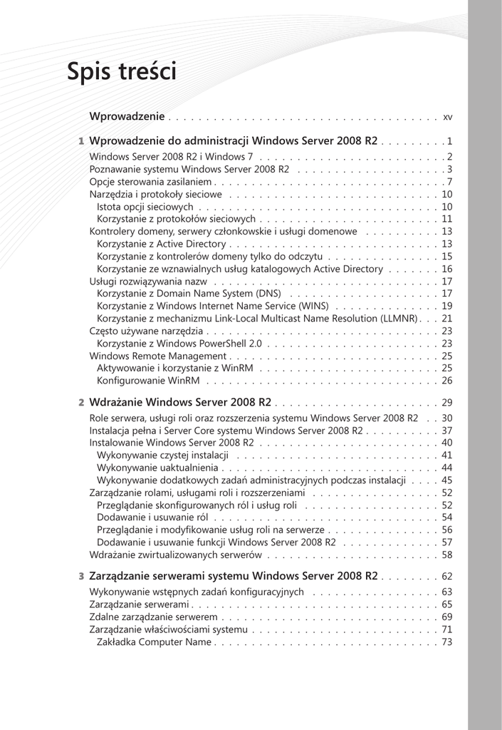 Spis treści Wprowadzenie . . . . . . . . . . . . . . . . . . . . . . . . . . . . . . . . . . . . xv 1 Wprowadzenie do administracji Windows Server 2008 R2 . . . . . . . . . 1 Windows Server 2008 R2 i Windows 7 . . . . . . . . . . . . . . . . . . . . . . Poznawanie systemu Windows Server 2008 R2 . . . . . . . . . . . . . . . . . Opcje sterowania zasilaniem . . . . . . . . . . . . . . . . . . . . . . . . . . . . Narzędzia i protokoły sieciowe . . . . . . . . . . . . . . . . . . . . . . . . . . Istota opcji sieciowych . . . . . . . . . . . . . . . . . . . . . . . . . . . . . . Korzystanie z protokołów sieciowych . . . . . . . . . . . . . . . . . . . . . . Kontrolery domeny, serwery członkowskie i usługi domenowe . . . . . . . . Korzystanie z Active Directory . . . . . . . . . . . . . . . . . . . . . . . . . . Korzystanie z kontrolerów domeny tylko do odczytu . . . . . . . . . . . . . Korzystanie ze wznawialnych usług katalogowych Active Directory . . . . . Usługi rozwiązywania nazw . . . . . . . . . . . . . . . . . . . . . . . . . . . . Korzystanie z Domain Name System (DNS) . . . . . . . . . . . . . . . . . . Korzystanie z Windows Internet Name Service (WINS) . . . . . . . . . . . . Korzystanie z mechanizmu Link-Local Multicast Name Resolution (LLMNR) . Często używane narzędzia . . . . . . . . . . . . . . . . . . . . . . . . . . . . . Korzystanie z Windows PowerShell 2.0 . . . . . . . . . . . . . . . . . . . . . Windows Remote Management . . . . . . . . . . . . . . . . . . . . . . . . . . Aktywowanie i korzystanie z WinRM . . . . . . . . . . . . . . . . . . . . . . Konfigurowanie WinRM . . . . . . . . . . . . . . . . . . . . . . . . . . . . . . . . . . . . . . . . . . . . . . . . . . . . . . . . . . . . . . . . . . . .2 .3 .7 10 10 11 13 13 15 16 17 17 19 21 23 23 25 25 26 2 Wdrażanie Windows Server 2008 R2 . . . . . . . . . . . . . . . . . . . . . . 29 Role serwera, usługi roli oraz rozszerzenia systemu Windows Server 2008 R2 Instalacja pełna i Server Core systemu Windows Server 2008 R2 . . . . . . . . Instalowanie Windows Server 2008 R2 . . . . . . . . . . . . . . . . . . . . . . Wykonywanie czystej instalacji . . . . . . . . . . . . . . . . . . . . . . . . . Wykonywanie uaktualnienia . . . . . . . . . . . . . . . . . . . . . . . . . . . Wykonywanie dodatkowych zadań administracyjnych podczas instalacji . . Zarządzanie rolami, usługami roli i rozszerzeniami . . . . . . . . . . . . . . . Przeglądanie skonfigurowanych ról i usług roli . . . . . . . . . . . . . . . . Dodawanie i usuwanie ról . . . . . . . . . . . . . . . . . . . . . . . . . . . . Przeglądanie i modyfikowanie usług roli na serwerze . . . . . . . . . . . . . Dodawanie i usuwanie funkcji Windows Server 2008 R2 . . . . . . . . . . . Wdrażanie zwirtualizowanych serwerów . . . . . . . . . . . . . . . . . . . . . . . . . . . . . . . . . . . . . . . . . . . . . 30 37 40 41 44 45 52 52 54 56 57 58 3 Zarządzanie serwerami systemu Windows Server 2008 R2 . . . . . . . . 62 Wykonywanie wstępnych zadań konfiguracyjnych Zarządzanie serwerami . . . . . . . . . . . . . . . . Zdalne zarządzanie serwerem . . . . . . . . . . . . Zarządzanie właściwościami systemu . . . . . . . . Zakładka Computer Name . . . . . . . . . . . . . . . . . . . . . . . . . . . . . . . . . . . . . . . . . . . . . . . . . . . . . . . . . . . . . . . . . . . . . . . . . . . . . . . . . . . . . . . . . . . . . . . . . . 63 65 69 71 73 Zakładka Hardware . . . . . Zakładka Advanced . . . . . Zakładka Remote . . . . . . Zarządzanie bibliotekami DLL . . . . . . . . . . . . . . . . . . . . . . . . . . . . . . . . . . . . . . . . . . . . . . . . . . . . . . . . . . . . . . . . . . . . . . . . . . . . . . . . . . . . . . . . . . . . . . . . . . . . . . . . . . . . . . . . . . . . 74 74 83 83 4 Monitorowanie procesów, usług i zdarzeń . . . . . . . . . . . . . . . . . . 85 Zarządzanie aplikacjami, procesami i wydajnością . . . . . . . . . . . . . Task Manager . . . . . . . . . . . . . . . . . . . . . . . . . . . . . . . . Zarządzanie aplikacjami . . . . . . . . . . . . . . . . . . . . . . . . . . Administrowanie procesami . . . . . . . . . . . . . . . . . . . . . . . . Przeglądanie usług systemowych . . . . . . . . . . . . . . . . . . . . . Wyświetlanie i zarządzanie wydajnością systemu . . . . . . . . . . . . Przeglądanie i zarządzanie wydajnością sieci . . . . . . . . . . . . . . . Przeglądanie i zarządzanie sesjami użytkowników . . . . . . . . . . . . Zarządzanie usługami systemowymi . . . . . . . . . . . . . . . . . . . . Uruchamianie, zatrzymywanie i wstrzymywanie usług . . . . . . . . . Konfigurowanie uruchamiania usług . . . . . . . . . . . . . . . . . . . Konfigurowanie konta logowania usługi . . . . . . . . . . . . . . . . . Konfigurowanie odzyskiwania usług . . . . . . . . . . . . . . . . . . . Wyłączanie niepotrzebnych usług . . . . . . . . . . . . . . . . . . . . . Rejestrowanie i przeglądanie zdarzeń . . . . . . . . . . . . . . . . . . . . Uzyskiwanie dostępu i korzystanie z dzienników zdarzeń . . . . . . . . Filtrowanie dzienników . . . . . . . . . . . . . . . . . . . . . . . . . . . Określanie opcji dzienników zdarzeń . . . . . . . . . . . . . . . . . . . Czyszczenie dzienników zdarzeń . . . . . . . . . . . . . . . . . . . . . Archiwizowanie dzienników zdarzeń . . . . . . . . . . . . . . . . . . . Monitorowanie wydajności i aktywności serwera . . . . . . . . . . . . . Po co monitorować serwery? . . . . . . . . . . . . . . . . . . . . . . . Przygotowanie do monitorowania . . . . . . . . . . . . . . . . . . . . Korzystanie z konsoli monitorowania . . . . . . . . . . . . . . . . . . . Wybieranie liczników do monitorowania . . . . . . . . . . . . . . . . . Rejestrowanie wydajności . . . . . . . . . . . . . . . . . . . . . . . . . Przeglądanie raportów modułów zbierających dane . . . . . . . . . . Konfigurowanie alertów liczników wydajności . . . . . . . . . . . . . . Dost