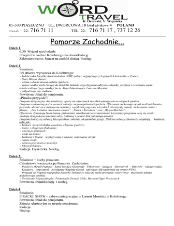 05-500 PIASECZNO TEL/FAX 22- 716 71 K. Orłowski, V. Wojeńska UL. DWORCOWA 18 lokal użytkowy 4 POLAND 11 TEL 22- 716 71 17 , 737 12 26 Pomorze Zachodnie... Dzień 1 6.30 Wyjazd spod szkoły. Przejazd w okolice Kołobrzegu na obiadokolację. Zakwaterowanie. Spacer na zachód słońca. Nocleg. Dzień 2 Śniadanie. Pół dniowa wycieczka do Kołobrzegu: - kołobrzeska Bazylika Konkatedralna NMP- jeden z najpiękniejszych gotyckich kościołów w Polsce; - Stare Miasto, Ratusz; - wizyta u ducha miasta-Jakuba Adebara; - spacer wzdłuż rzeki Parsęty do Źródełka Solankowego (legenda odkrycia solanek); przejście i zwiedzanie portu kołobrzeskiego i jego atrakcji (m.in. Aleja Zakochanych, Latarnia Morska); - półgodzinny rejs statkiem. Powrót na obiad do pensjonatu. „Piracka przygoda”: Program integracyjny dla młodzieży, oparty na obyczajach morskich panujących na okrętach piratów. Program realizowany jest w scenerii autentycznego napoleońskiego fortu. Oficerowie zachowują się jak na dżentelmenów przystało, ubrani są w stylizowane mundury, a podczas programu wszystkich obowiązują zasady zachowania znane z filmów: „Pan i władca. Na krańcu świata”, „Piraci z Karaibów” oraz „Wyspa Skarbów”. Oficerowie dysponują białą bronią, pistoletami, muszkietami oraz latarniami. Uczestnicy programu uczą się szant i smakują dym podczas ostatniej salwy (oddanej z petard, którymi ładują armaty). Program kończy się zabawą lub ogniskiem, zależnie od upodobań grupy. Podczas zabawy oficerowie urządzają konkursy takie jak: - konkurs ciesielski (kilka sposobów wbijania gwoździ); - taniec z obijaczem (balonem); - wyścig po plankach; - walki na bomie; - konkursy z linami – wyplątywanie z więzów, cumowanie okrętu; - nauka szant; - zabawa przy muzyce morskiej; - lekcja fechtunku.. Kolacja. Dyskoteka. Nocleg. Dzień 3 Śniadanie + suchy prowiant. Całodniowa wycieczka po Pomorzu Zachodnim: - Pustkowo (Krzyż Papieski - kopia krzyża z Giewontu) - Pobierowo – Łukęcin – Dziwnówek – Dziwnów - Międzywodzie. - Kołczewo - (przystanek - zwiedzanie Wzgórza Gosań - najwyższy klif nadmorski na terenie WPN). - Przejazd do Wapnicy nad piękne Jeziorko Turkusowe (czas na suchy prowiant i wyżywienie - możliwość zakupu dodatkowego posiłku). - Zwiedzanie Międzyzdrojów: Promenada Gwiazd, Molo, Muzeum Figur Woskowych. Powrót na obiadokolację i nocleg. Dzień 4 Śniadanie. PIRACKI SHOW – zabawa integracyjna w Latarni Morskiej w Kołobrzegu. Powrót na obiad do pensjonatu. Zajęcia rekreacyjne na terenie pensjonatu. Kolacja. Nocleg. Dzień 5 Śniadanie + suchy prowiant. Wyjazd w kierunku szkoły, po drodze możliwość postoju w Mc Donald's (konsumpcja we własnym zakresie). Ok. 19.30-20.30 Przyjazd pod szkołę. KOLEJNOŚĆ ZWIEDZANIA MOŻE ULEC ZMIANIE Świadczenia: - transport lux autokarem marki, np. Mercedes, Volvo, Scania, MAN, Neoplan z WC, DVD, barkiem, uchylnymi siedzeniami - zakwaterowanie w hotelu, pensjonacie, ośrodku wypoczynkowym, pokoje z łazienkami lub studio - wyżywienie zgodnie z programem - realizacja programu turystycznego - opieka pilota - ubezpieczenie NW 5000 zł - VAT - grupy 30 os. - 2 miejsca gratis dla nauczycieli, od 30 do 45 os. – 3 miejsca gratis dla nauczycieli Cena: 590 zł /min. 40 os. - max. 45 os. płacących 640 zł /min. 35 os. - max. 39 os. płacących 690 zł /min. 30 os. - max. 34 os. płacących +dodatkowo bilety wstępu od 50 do 80 zł/os. (kwota ta jest uzależniona od konkretnych punktów programu, którymi jesteście Państwo zainteresowani) Standardowy rozmiar naszych autokarów to 49 miejsc (do dyspozycji grupy wraz z opiekunami). Na Państwa życzenie możemy zarezerwować autokary 57-70 miejsc (w tym przypadku prosimy o kontakt z biurem w celu sprawdzenia kalkulacji na ponadstandardowy pojazd i jego dostępności w wybranym przez Państwa terminie). W celu podpisania umowy i rezerwacji konkretnego terminu prosimy o telefon do biura 022 716 71 11 lub 022 716 71 17 lub mail [email protected] Zaliczka konieczna do podpisania umowy: 200 zł/os Ze względu na szczyt sezonu wycieczek szkolnych w miesiącach maj-czerwiec sugerujemy dokonanie rez. Wstępnej. Termin, który Państwa interesuje, potwierdzamy po sprawdzeniu dostępności wolnych miejsc w hotelu. Dokonujemy rezerwacji wstępnej na czas zebrania zaliczek przez nauczyciela ( najczęściej nie dłużej niż 4 tyg.) KWOTĘ NA BILETY WSTĘPU POTWIERDZAMY PRZED DOPŁATĄ ZGODNIE Z OBOWIĄZUJĄCYMI CENNIKAMI Wyciąg z warunków uczestnictwa imprez turystycznych organizowanych przez B.P. Word Travel (pełna wersja warunków uczestnictwa dostępna jest u nauczyciela organizującego wycieczkę): 13. W przypadku rezygnacji lub nie uczestniczenia Uczestnika w wykupionej imprezie Organizator uprawniony jest do potrącenia RZECZYWIŚCIE PONIESIONYCH KOSZTÓW. 14. Zmiana uczestnika nie pociąga za sobą kosztów finansowych. 18. Uczestnik odpowiada za wszelkie szkody materialne wyrządzone w trakcie trwania imprezy (zniszczenia w hotelu, autokarze). 15. Jeżeli w programie jest wyjazd poza granicę Polski - uczestnik winien posiadać na miejscu zbiórki aktualnie obowiązujące dokumenty uprawniające do przekroczenia granic krajów objętych programem imprezy (wyłącznie dowód osobisty lub paszport ważny min. 6 m-cy od daty powrotu). 9 B. W przypadku chorób uznawanych za przewlekłe uczestnik winien na własny koszt wykupić dodatkowe ubezpieczenie ! (dotyczy wycieczek zagranicznych). Klient przez dokonanie wpłaty (całkowitej lub częściowej) akceptuje program wycieczki i warunki uczestnictwa.