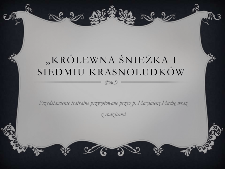 „KRÓLEWNA ŚNIEŻKA I SIEDMIU KRASNOLUDKÓW Przedstawienie teatralne przygotowane przez p. Magdalenę Muchę wraz z rodzicami INFORMACJE: Głównym celem było nawiązanie bliższej współpracy z rodzicami, zachęcenie rodziców do współdziałania na rzecz z przedszkola, współpraca ze środowiskiem lokalnym, promowanie przedszkola w środowisku lokalnym Niniejsze przedstawienie zostało przygotowane przez rodziców dla dzieci. Rodzice wcielili się w bohaterów (aktorów) przedstawienia. Samodzielnie przygotowali stroje i rekwizyty. Opracowała: Kinga Jagielska