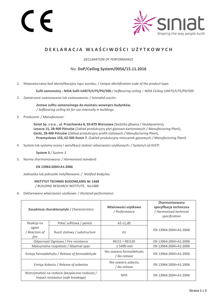 DEKLARACJA WŁAŚCIWOŚCI UŻYTKOWYCH DECLARATION OF PERFORMANCE No. DoP/Ceiling System/0056/15.11.2016 1. Niepowtarzalny kod identyfikacyjny typu wyrobu: / Unique identification code of the product-type: Sufit samonośny - NIDA Sufit UAR75/U75/PD/500 / Selfbearing ceiling – NIDA Ceiling UAR75/U75/PD/500 2. Zamierzone zastosowanie lub zastosowania: / Intended use/es: Zestaw sufitu samonośnego do montażu wewnątrz budynków. / Selfbearing ceiling kit for use internally in buildings. 3. Producent: / Manufacturer: Siniat Sp. z o.o. , ul. Przecławska 8, 03-879 Warszawa (Siedziba główna / Headquarters), Leszcze 15, 28-400 Pińczów (Zakład produkcyjny płyt gipsowo-kartonowych / Manufacturing Plant), Gacki, 28-400 Pińczów (Zakład produkcyjny profili stalowych / Manufacturing Plant), Przemysłowa 153, 62-505 Konin 7 (Zakład produkcyjny mieszanek gipsowych / Manufacturing Plant). 4. System lub systemy oceny I weryfikacji stałości właściwości użytkowych: / System/s of AVCP: System 3 / System 3 5. Norma zharmonizowana: / Harmonised standard: EN 13964:2004+A1:2006 Jednostka lub jednostki notyfikowane: / Notified body/ies: INSTYTUT TECHNIKI BUDOWLANEJ Nr 1488 / BUILDING RESEARCH INSTITUTE, No1488 6. Deklarowane właściwości użytkowe: / Declared performance: Zasadnicze charakterystyki / Characteristics Reakcja na Połać sufitowa / panels ogień / Reaction of Ruszt stalowy / substructure fire Odporność Ogniowa / Fire resistance Maksymalna rozpietość / Maximal span Właściwości użytkowe / Performance Zharmonizowana specyfikacja techniczna / Harmonised technical specification A2-s1,d0 A1 EN 13964:2004+A1:2006 REI15 ÷ REI120 ≤ 5490 mm EN 13964:2004+A1:2006 EN 13964:2004+A1:2006 Emisja formaldehydu / Release of formaldehyde Nie zawiera formaldehydu / No release EN 13964:2004+A1:2006 Emisja Azbestu / Release of asbestos Nie zawiera azbestu / No release EN 13964:2004+A1:2006 Wytrzymałość na rozbicie (bezpieczne rozbicie) / Impact resistance (safe breakage) NPD EN 13964:2004+A1:2006 Strona 1 z 3 Zasadnicze charakterystyki / Characteristics Właściwości użytkowe / Performance Zharmonizowana specyfikacja techniczna / Harmonised technical specification Odporność na zginanie / Flexual tensile strenght NPD EN 13964:2004+A1:2006 NIDA UAR75 +PD Ff ≥ 971,90 N Klasa 1 (L/500) / 1 Class (L/500) EN 13964:2004+A1:2006 NIDA U75 Feff ≥ 31,53 N Nośność / Load bearing capacity 7. Podkonstrukcja / Substructure Wymiary I tolerancje / Tolerances and dimensions Patrz materiały informacyjne producenta / See information materials manufacturer EN 13964:2004+A1:2006 Przewodność cieplna / Thermal conductivity NPD EN 13964:2004+A1:2006 Bezpieczeństwo elektryczne / Electrical Safety NPD EN 13964:2004+A1:2006 Izolacyjność od dźwięków powietrznych / Direct airbone sound insulation NPD EN 13964:2004+A1:2006 Pochłanianie dźwięku / Sound absorption NPD EN 13964:2004+A1:2006 Izolacyjność cieplna / Thermal performances, as thermal conductivity NPD EN 13964:2004+A1:2006 Trwałość / Durability Klasa B (C2 - długi okres trwałości) /B class (C2 - long term durability) EN 13964:2004+A1:2006 Odpowiednia dokumentacja techniczna lub specjalna dokumentacja techniczna: / Appropriate Technical Documentation and/or Specific Technical Documentation: Instytut Techniki Budowlanej ZKBiG - Raporty z Badań Wstępnych Typu (ITT) : LK00-01060/15/R102NK, LK00-1060/12/R32NK/16/LZK, LK03-1060/11/R14NK/16/LZK, LM01- 00772/16/Z00NM. Instytut Techniki Budowlanej ZBO : LZP11-1060/14/R82NZP, 1060.2.1/14/R82NZP, 1060.2.2/14/R82NZP, 1060.2.3/14/R82NZP, 1060.2.4/14/R82NZP, 1060/13/R54NP. GryfitLab : LBO - 302 - K/15, LBO-458-K/13. Strona 2 z 3 Właściwości użytkowe określonego powyżej wyrobu są zgodne z zestawem deklarowanych właściwości użytkowych. Niniejsza deklaracja właściwości użytkowych wydana zostaje zgodnie z rozporządzeniem (UE) nr 305/2011 na wyłączną odpowiedzialność producenta określonego powyżej. / The performance of the product identified above is in conformity with the set of declared performance/s. This declaration of performance is issued, in accordance with Regulation (EU) No 305/2011, under the sole responsibility of the manufacturer identified above. W imieniu producenta podpisał: / Signed for and on behalf of the manufacturer by: Radosław Kowalski - Kierownik Rozwoju Technicznego Produktów I Systemów (nazwisko i stanowisko / name and function) Warszawa 15.11.2016 r. (miejsce i data wystawienia / place and date of issue) …………………………………………………………………………… (podpis / singature) Strona 3 z 3