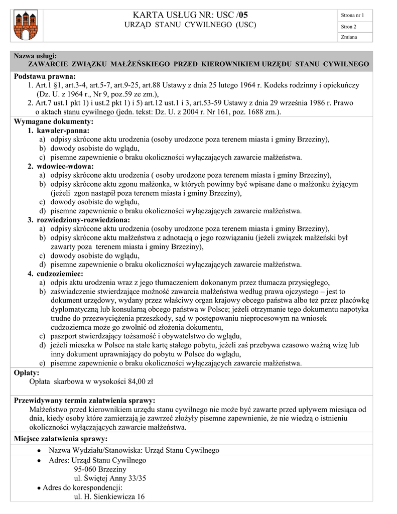 KARTA USŁUG NR: USC /05 URZĄD STANU CYWILNEGO (USC) Strona nr 1 Stron 2 Zmiana Nazwa usługi: ZAWARCIE ZWIĄZKU MAŁŻEŃSKIEGO PRZED KIEROWNIKIEM URZĘDU STANU CYWILNEGO Podstawa prawna: 1. Art.1 §1, art.3-4, art.5-7, art.9-25, art.88 Ustawy z dnia 25 lutego 1964 r. Kodeks rodzinny i opiekuńczy (Dz. U. z 1964 r., Nr 9, poz.59 ze zm.), 2. Art.7 ust.1 pkt 1) i ust.2 pkt 1) i 5) art.12 ust.1 i 3, art.53-59 Ustawy z dnia 29 września 1986 r. Prawo o aktach stanu cywilnego (jedn. tekst: Dz. U. z 2004 r. Nr 161, poz. 1688 zm.). Wymagane dokumenty: 1. kawaler-panna: a) odpisy skrócone aktu urodzenia (osoby urodzone poza terenem miasta i gminy Brzeziny), b) dowody osobiste do wglądu, c) pisemne zapewnienie o braku okoliczności wyłączających zawarcie małżeństwa. 2. wdowiec-wdowa: a) odpisy skrócone aktu urodzenia ( osoby urodzone poza terenem miasta i gminy Brzeziny), b) odpisy skrócone aktu zgonu małżonka, w których powinny być wpisane dane o małżonku żyjącym (jeżeli zgon nastąpił poza terenem miasta i gminy Brzeziny), c) dowody osobiste do wglądu, d) pisemne zapewnienie o braku okoliczności wyłączających zawarcie małżeństwa. 3. rozwiedziony-rozwiedziona: a) odpisy skrócone aktu urodzenia (osoby urodzone poza terenem miasta i gminy Brzeziny), b) odpisy skrócone aktu małżeństwa z adnotacją o jego rozwiązaniu (jeżeli związek małżeński był zawarty poza terenem miasta i gminy Brzeziny), c) dowody osobiste do wglądu, d) pisemne zapewnienie o braku okoliczności wyłączających zawarcie małżeństwa. 4. cudzoziemiec: a) odpis aktu urodzenia wraz z jego tłumaczeniem dokonanym przez tłumacza przysięgłego, b) zaświadczenie stwierdzające możność zawarcia małżeństwa według prawa ojczystego – jest to dokument urzędowy, wydany przez właściwy organ krajowy obcego państwa albo też przez placówkę dyplomatyczną lub konsularną obcego państwa w Polsce; jeżeli otrzymanie tego dokumentu napotyka trudne do przezwyciężenia przeszkody, sąd w postępowaniu nieprocesowym na wniosek cudzoziemca może go zwolnić od złożenia dokumentu, c) paszport stwierdzający tożsamość i obywatelstwo do wglądu, d) jeżeli mieszka w Polsce na stałe kartę stałego pobytu, jeżeli zaś przebywa czasowo ważną wizę lub inny dokument uprawniający do pobytu w Polsce do wglądu, e) pisemne zapewnienie o braku okoliczności wyłączających zawarcie małżeństwa. Opłaty: Opłata skarbowa w wysokości 84,00 zł Przewidywany termin załatwienia sprawy: Małżeństwo przed kierownikiem urzędu stanu cywilnego nie może być zawarte przed upływem miesiąca od dnia, kiedy osoby które zamierzają je zawrzeć złożyły pisemne zapewnienie, że nie wiedzą o istnieniu okoliczności wyłączających zawarcie małżeństwa. Miejsce załatwienia sprawy: Nazwa Wydziału/Stanowiska: Urząd Stanu Cywilnego Adres: Urząd Stanu Cywilnego 95-060 Brzeziny ul. Świętej Anny 33/35 Adres do korespondencji: ul. H. Sienkiewicza 16 95-060 Brzeziny Nr telefonu: (0-46) 874-26-82, Nr faksu: (0-46) 874-27-93 Godziny pracy: poniedziałek, wtorek, czwartek, piątek 8.00-16.00, środa 8.00-17.00. Tryb odwoławczy: Jeżeli kierownik urzędu stanu cywilnego odmawia przyjęcia oświadczeń o wstąpieniu w związek małżeński powiadamia na piśmie osobę zainteresowaną o przyczynach odmowy. Osoba zainteresowana w terminie 14 dni od dnia doręczenia jej pisma kierownika urzędu stanu cywilnego może wystąpić z wnioskiem do Sądu Rejonowego w Brzezinach, o rozstrzygnięcie, czy okoliczności przedstawione przez kierownika urzędu stanu cywilnego uzasadniają odmowę dokonania czynności. Uwagi: 1. Zawarcie małżeństwa następuje w urzędzie stanu cywilnego wybranym przez osoby zamierzające wstąpić w związek małżeński. 2. Małżeństwo zostaje zawarte, gdy mężczyzna i kobieta jednocześnie obecni złożą przed kierownikiem urzędu stanu cywilnego oświadczenia , że wstępują ze sobą w związek małżeński. 3. Nie może zawrzeć małżeństwa osoba nie mająca ukończonych lat osiemnastu. Z ważnych powodów sąd opiekuńczy może zezwolić na zawarcie małżeństwa kobiecie, która ukończyła lat szesnaście, jeżeli z okoliczności wynika, że zawarcie małżeństwa będzie zgodne z dobrem założonej rodziny. 4. Kierownik urzędu stanu cywilnego może zezwolić na zawarcie małżeństwa przed miesiącem wyczekiwania, jeżeli przemawiają za tym ważne względy. 5. Przedłożone odpisy aktów stanu cywilnego winny być z opłatą skarbową. Miejsce na notatki: