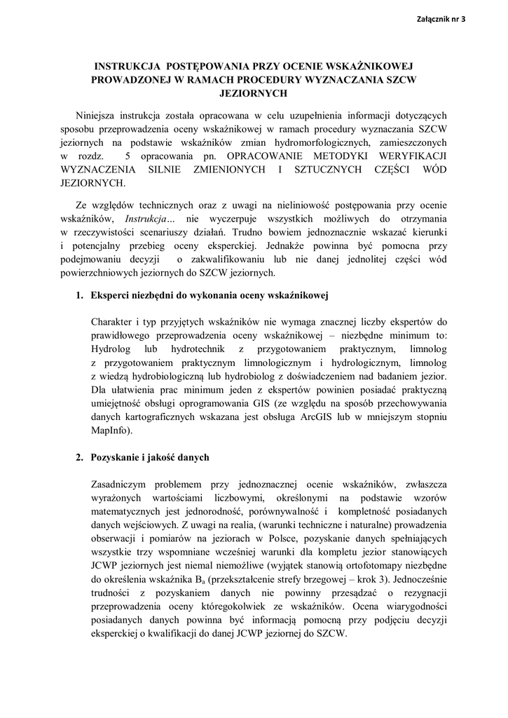 Załącznik nr 3 INSTRUKCJA POSTĘPOWANIA PRZY OCENIE WSKAŻNIKOWEJ PROWADZONEJ W RAMACH PROCEDURY WYZNACZANIA SZCW JEZIORNYCH Niniejsza instrukcja została opracowana w celu uzupełnienia informacji dotyczących sposobu przeprowadzenia oceny wskaźnikowej w ramach procedury wyznaczania SZCW jeziornych na podstawie wskaźników zmian hydromorfologicznych, zamieszczonych w rozdz. 5 opracowania pn. OPRACOWANIE METODYKI WERYFIKACJI WYZNACZENIA SILNIE ZMIENIONYCH I SZTUCZNYCH CZĘŚCI WÓD JEZIORNYCH. Ze względów technicznych oraz z uwagi na nieliniowość postępowania przy ocenie wskaźników, Instrukcja… nie wyczerpuje wszystkich możliwych do otrzymania w rzeczywistości scenariuszy działań. Trudno bowiem jednoznacznie wskazać kierunki i potencjalny przebieg oceny eksperckiej. Jednakże powinna być pomocna przy podejmowaniu decyzji o zakwalifikowaniu lub nie danej jednolitej części wód powierzchniowych jeziornych do SZCW jeziornych. 1. Eksperci niezbędni do wykonania oceny wskaźnikowej Charakter i typ przyjętych wskaźników nie wymaga znacznej liczby ekspertów do prawidłowego przeprowadzenia oceny wskaźnikowej – niezbędne minimum to: Hydrolog lub hydrotechnik z przygotowaniem praktycznym, limnolog z przygotowaniem praktycznym limnologicznym i hydrologicznym, limnolog z wiedzą hydrobiologiczną lub hydrobiolog z doświadczeniem nad badaniem jezior. Dla ułatwienia prac minimum jeden z ekspertów powinien posiadać praktyczną umiejętność obsługi oprogramowania GIS (ze względu na sposób przechowywania danych kartograficznych wskazana jest obsługa ArcGIS lub w mniejszym stopniu MapInfo). 2. Pozyskanie i jakość danych Zasadniczym problemem przy jednoznacznej ocenie wskaźników, zwłaszcza wyrażonych wartościami liczbowymi, określonymi na podstawie wzorów matematycznych jest jednorodność, porównywalność i kompletność posiadanych danych wejściowych. Z uwagi na realia, (warunki techniczne i naturalne) prowadzenia obserwacji i pomiarów na jeziorach w Polsce, pozyskanie danych spełniających wszystkie trzy wspomniane wcześniej warunki dla kompletu jezior stanowiących JCWP jeziornych jest niemal niemożliwe (wyjątek stanowią ortofotomapy niezbędne do określenia wskaźnika Ba (przekształcenie strefy brzegowej – krok 3). Jednocześnie trudności z pozyskaniem danych nie powinny przesądzać o rezygnacji przeprowadzenia oceny któregokolwiek ze wskaźników. Ocena wiarygodności posiadanych danych powinna być informacją pomocną przy podjęciu decyzji eksperckiej o kwalifikacji do danej JCWP jeziornej do SZCW. Wiarygodność danych pochodzących z poszczególnych źródeł: a) Dane pełnowartościowe lub przyjęte za pełnowartościowe. Do tej grupy zaliczyć można ortofotomapy pochodzące z zasobów GUGiK (geoportal , serwer WMS – ortofotomapy mono i kolor), dane pomiarowe, wyniki obserwacji bezpośrednich i obliczonych wartości charakterystycznych dla stanów wód, przepływów i opadów, pochodzące z prac PSHM przy IMGWPIB, dane pochodzące z banku Hydro (PIG), dane PMŚ, pomiary stanów prowadzone przez użytkowników urządzeń piętrzących (w tym wojewódzkich ZMiUW). b) Dane względnie wiarygodne, ale niejednorodne. Dane pochodzące z pozwoleń wodno prawnych (pozostających w zasobach RZGW), a także z miejscowych i gminnych planów zagospodarowania przestrzennego, opracowań ekofizjograficznych, zasobów nadzoru budowlanego szczebla powiatowego i wojewódzkiego. Do tej grupy zaliczyć należy również obliczone (zgodnie z metodami powszechnie stosowanymi w hydrologii) wartości przepływów charakterystycznych (SNQ, SSQ) dla profili niekontrolowanych zlokalizowanych na wypływach z jezior, dane z badań epizodycznych (prace badawcze – dotyczy szczególnie wskaźnik dodatkowefo FA). c) Dane pomocnicze – niejednorodne wymagające oceny indywidualnej i wiedzy eksperckiej. W tej grupie znajdą się m.in. dane oparte na archiwalnych materiałach kartograficznych, pochodzące z operatów rybackich i od użytkowników rybackich oraz zasobów Urzędów Żeglugi Śródlądowych, itp. 3. Kolejność wykonywania działań i wytyczne do interpretacji wyników 3.1. Krok 1 – działanie i interpretacja wskaźników Obliczenie wskaźników podstawowych z grupy A (hydrologia). W zależności od dostępności i wiarygodności danych należy obliczyć wszystkie trzy lub tylko wybrane wskaźniki przy założeniu, że dążyć należy do uwzględnienia wszystkich, co jest jednocześnie warunkiem ewentualnej, bezpośredniej kwalifikacji JCWP jeziornej do SZCW. W tym kroku niedopuszczalne jest uzasadnienie jego pominięcia na podstawie braku danych. W skrajnym przypadku należy ustalić średnie wysokie stany ekspercko na podstawie zmian obserwowanych na roślinności brzegowej i odnieść do archiwalnych materiałów kartograficznych (w takim przypadku poziom wiarygodności c – ustęp 2 Instrukcji). Gradacja wskaźników – Aa – wskaźnik najważniejszy, następnie odpowiednio Ab i Ac. Potencjalne wyniki: Wariant I – obliczone wszystkie wskaźniki - wszystkie wskaźniki wskazują na istotność zmian z punktu widzenia oceny hydromorfologicznej – bezpośrednia kwalifikacja do SZCW jez. Wariant II – obliczone wszystkie wskaźniki – część wskaźników wskazuje na zmiany istotne z punktu widzenia oceny hydromorfologicznej – przejście do kroku 2. Wariant III – obliczone wszystkie wskaźniki – wskaźnik lub wskaźniki wskazują jedynie na możliwość wystąpienia istotnych zmian z punktu widzenia oceny hydromorfologicznej (np. wartość wskaźnika Aa ze środkowego przedziału, Ab zmiana istotna, Ac naturalny charakter) – przejście do kroku 2. Wariant IV – obliczone wybrane wskaźniki (Aa i Ab), wskazują na istotność zmian z punktu widzenia oceny hydromorfologicznej (przy założeniu, że dane posiadają wiarygodność „a” lub „b”– patrz ustęp 2) – bezpośrednia kwalifikacja do SZCW jez. Wariant V – obli