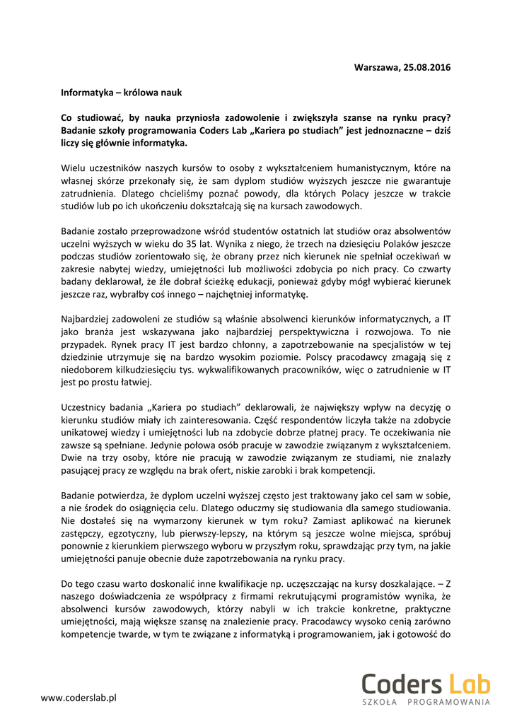 Warszawa,25.08.2016 Informatyka–królowanauk Co studiować, by nauka przyniosła zadowolenie i zwiększyła szanse na rynku pracy? BadanieszkołyprogramowaniaCodersLab„Karierapostudiach”jestjednoznaczne–dziś liczysięgłównieinformatyka. Wielu uczestników naszych kursów to osoby z wykształceniem humanistycznym, które na własnej skórze przekonały się, że sam dyplom studiów wyższych jeszcze nie gwarantuje zatrudnienia. Dlatego chcieliśmy poznać powody, dla których Polacy jeszcze w trakcie studiówlubpoichukończeniudokształcająsięnakursachzawodowych. Badaniezostałoprzeprowadzonewśródstudentówostatnichlatstudióworazabsolwentów uczelniwyższychwwiekudo35lat.Wynikazniego,żetrzechnadziesięciuPolakówjeszcze podczas studiów zorientowało się, że obrany przez nich kierunek nie spełniał oczekiwań w zakresie nabytej wiedzy, umiejętności lub możliwości zdobycia po nich pracy. Co czwarty badanydeklarował,żeźledobrałścieżkęedukacji,ponieważgdybymógłwybieraćkierunek jeszczeraz,wybrałbycośinnego–najchętniejinformatykę. Najbardziej zadowoleni ze studiów są właśnie absolwenci kierunków informatycznych, a IT jako branża jest wskazywana jako najbardziej perspektywiczna i rozwojowa. To nie przypadek. Rynek pracy IT jest bardzo chłonny, a zapotrzebowanie na specjalistów w tej dziedzinie utrzymuje się na bardzo wysokim poziomie. Polscy pracodawcy zmagają się z niedoboremkilkudziesięciutys.wykwalifikowanychpracowników,więcozatrudnieniewIT jestpoprostułatwiej. Uczestnicy badania „Kariera po studiach” deklarowali, że największy wpływ na decyzję o kierunku studiów miały ich zainteresowania. Część respondentów liczyła także na zdobycie unikatowejwiedzyiumiejętnościlubnazdobyciedobrzepłatnejpracy.Teoczekiwanianie zawszesąspełniane.Jedyniepołowaosóbpracujewzawodziezwiązanymzwykształceniem. Dwie na trzy osoby, które nie pracują w zawodzie związanym ze studiami, nie znalazły pasującejpracyzewzględunabrakofert,niskiezarobkiibrakkompetencji. Badaniepotwierdza,żedyplomuczelniwyższejczęstojesttraktowanyjakocelsamwsobie, anieśrodekdoosiągnięciacelu.Dlategooduczmysięstudiowaniadlasamegostudiowania. Nie dostałeś się na wymarzony kierunek w tym roku? Zamiast aplikować na kierunek zastępczy, egzotyczny, lub pierwszy-lepszy, na którym są jeszcze wolne miejsca, spróbuj ponowniezkierunkiempierwszegowyboruwprzyszłymroku,sprawdzającprzytym,najakie umiejętnościpanujeobecniedużezapotrzebowanianarynkupracy. Dotegoczasuwartodoskonalićinnekwalifikacjenp.uczęszczającnakursydoszkalające.–Z naszego doświadczenia ze współpracy z firmami rekrutującymi programistów wynika, że absolwenci kursów zawodowych, którzy nabyli w ich trakcie konkretne, praktyczne umiejętności,mająwiększeszansęnaznalezieniepracy.Pracodawcywysokoceniązarówno kompetencjetwarde,wtymtezwiązanezinformatykąiprogramowaniem,jakigotowośćdo www.coderslab.pl dalszej nauki i rozwoju – to ostatnie jest szczególnie ważne u kandydatów bez doświadczenia. Badanie„Karierapostudiach”zostałoprzeprowadzonewczerwcu2016r.wformieankiety internetowej(CAWI)napróbie1400osób. www.coderslab.pl