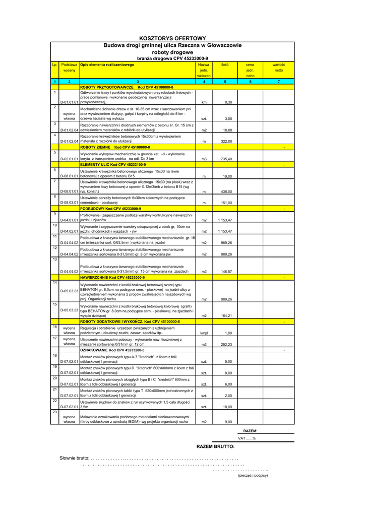 KOSZTORYS OFERTOWY Budowa drogi gminnej ulica Rzeczna w Głowaczowie roboty drogowe branża drogowa CPV 45233000-9 Lp. Podstawa Opis elementu rozliczeniowego Nazwa wyceny 1 1 2 3 ROBOTY PRZYGOTOWAWCZE Kod CPV 45100000-8 Odtworzenie trasy i punktów wysokościowych przy robotach liniowych prace pomiarowe i wykonanie geodezyjnej inwentaryzacji D-01.01.01 powykonawczej, 2 wycena własna Mechaniczne ścinanie drzew o śr. 16-35 cm wraz z karczowaniem pni oraz wywiezieniem dłużycy, gałęzi i karpiny na odległość do 5 km drzewa liściaste wg wykazu cena wartość jedn. jedn. netto rozliczen. netto 4 ilość 5 km 0,30 szt. 3,00 3 Rozebranie nawierzchni i drodnych elementów z betonu śr. Gr. 15 cm z D-01.02.04 odwiezieniem materiałów z robiórki do utylizacji m2 10,00 4 Rozebranie krawężników betonowych 15x30cm z wywiezieniem D-01.02.04 materiału z rozbiórki do utylizacji m 322,00 ROBOTY ZIEMNE 5 6 Kod CPV 45100000-8 Wykonanie wykopów mechanicznie w gruncie kat. I-II - wykonanie D-02.01.01 koryta z transportem urobku na odl. Do 3 km 7 m3 735,40 ELEMENTY ULIC Kod CPV 45233100-0 - 6 Ustawienie krawężnika betonowego ulicznego 15x30 na ławie D-08.01.01 betonowej z oporem z betonu B15 m 19,00 7 Ustawienie krawężnika betonowego ulicznego 15x30 (na płask) wraz z wykonaniem ławy betonowej z oporem 0.12m3/mb z betonu B15 (wg D-08.01.01 rys. konstr.) m 438,00 8 Ustawienie obrzeży betonowych 8x30cm kolorowych na podsypce D-08.03.01 cementowo - piaskowej m 151,00 PODBUDOWY Kod CPV 45233000-9 - 9 Profilowanie i zagęszczenie podłoża warstwy kontrukcyjne nawierzchni D-04.01.01 jezdni i zjazdów m2 1 153,47 10 Wykonanie i zagęszczenie warstwy odsączającej z piask gr. 10cm na D-04.02.01 jezdni, chodniikach i wjazdach - j/w m2 1 153,47 11 Podbudowa z kruszywa łamanego stabilizowanego mechanicznie gr. 15 D-04.04.02 cm (mieszanka sort. 0/63,5mm ) wykonana na jezdni m2 989,26 12 Podbudowa z kruszywa łamanego stabilizowanego mechanicznie D-04.04.02 (mieszanka sortowana 0-31,5mm) gr. 8 cm wykonana j/w m2 989,26 Podbudowa z kruszywa łamanego stabilizowanego mechanicznie D-04.04.02 (mieszanka sortowana 0-31,5mm) gr. 15 cm wykonana na zjazdach m2 146,57 13 NAWIERZCHNIE Kod CPV 45233000-9 14 15 - Wykonanie nawierzchni z kostki brukowej betonowej szarej typu D-05.03.23 BEHATON gr. 8.0cm na podsypce cem. - piaskowej na jezdni ulicy z uzwzględnieniem wykonania 2 progów zwalniających najazdowych wg proj. Organizacji ruchu m2 989,26 Wykonanie nawierzchni z kostki brukowej betonowej kolorowej (grafit) D-05.03.23 typu BEHATON gr. 8.0cm na podsypce cem. - piaskowej na zjazdach i wyspie dzielącej m2 164,21 ROBOTY DODATKOWE I WYKOŃCZ. Kod CPV 45100000-8 16 wycena własna Regulacja i obrobienie urzadzen zwiazanych z uzbrojeniem podziemnym - obudowy studni, zasuw, sączków itp.. 17 wycena własna Ulepszenie nawierzchni poboczy - wykonanie naw. tłuczniowej z mieszanki sortowanej 0/31mm gr. 12 cm kmpl m2 1,00 252,23 OZNAKOWANIE Kod CPV 45233280-5 - 18 Montaż znaków pionowych typu A-7 "średnich" z licem z folii D-07.02.01 odblaskowej I generacji szt. 5,00 19 Montaż znaków pionowych typu D "średnich" 600x600mm z licem z folii D-07.02.01 odblaskowej I generacji szt. 8,00 20 Montaż znaków pionowych okrągłych typu B i C "średnich" 800mm z D-07.02.01 licem z folii odblaskowej I generacji szt. 6,00 21 Montaż znaków pionowych tablic typu T 520x600mm jednostronnych z D-07.02.01 licem z folii odblaskowej I generacji szt. 2,00 22 Ustawienie słupków do znaków z rur ocynkowanych 1,5 cala długości D-07.02.01 3,5m szt. 18,00 m2 9,00 23 wycena własna Malowanie oznakowania poziomego materiałami cienkowarstwowymi (farby odblaskowe z aprobatą IBDIM)- wg projektu organizacji ruchu RAZEM: VAT ......% RAZEM BRUTTO: Słownie brutto: . . . . . . . . . . . . . .. . . . . . . . . . . . . . . . . . . . . . . . . . . . . . . . . . . . . . . . . . . . . . .................................................................. . . . . . . . . . . . . . . . . . . . . . .. (pieczęć i podpisy)