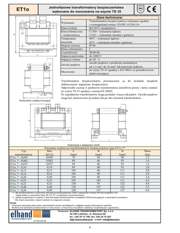 Jednofazowe transformatory bezpieczeństwa wykonane do mocowania na szynie TS 35 ET1o Dane techniczne: Wykonanie Klasa izolacji Klasa klimatyczna / środowiskowa Temperatura otoczenia Stopień ochrony Klasa ochronności Częstotliwość Napięcia pierwotne Napięcia wtórne Zaciski prądowe Mocowanie Transformatory bezpieczeństwa wykonane zgodnie z wymaganiami normy: EN/IEC 61558-2-6 B(130ºC) standardowo C1/E0 - wykonanie lądowe C2/E1 - wykonanie morskie i górnicze o 40 C - wykonanie lądowe 45oC - wykonanie morskie i górnicze IP 00 I 50/60 Hz do 1000 V do 50 V zaciski prądowe o przekroju nominalnym od 1,5 mm2 do 10 mm2 lub końcówki kablowe do szyny TS 35 zgodnej z EN 50022 za pośrednictwem płytki mocującej Transformatory bezpieczeństwa przeznaczone są do zasilania urządzeń elektrycznych napięciem bezpiecznym. Odpowiedni zaczep w podstawie transformatora umożliwia prosty i łatwy montaż na szynie TS 35 zgodnej z normą EN 50022. Po uzgodnieniu transformatory mogą posiadać więcej odczepów. Zaciski prądowe mogą być umieszczone po jednej lub po obu stronach transformatora. Wykonanie z płytką mocującą Wykonanie z adapterem GA35 Typ transformatora ET1o_* - 0,050 ET1o_* - 0,063 ET1o_* - 0,075 ET1o_* - 0,10 ET1o_* - 0,13 ET1o_* - 0,16 ET1o_* - 0,20 ET1o_* - 0,25 ET1o_* - 0,32 ET1o_* - 0,40 ET1o_* - 0,50 Parametry techniczne transformatorów bezpieczeństwa typu ET1o ** Moc L B H [kVA] [mm] [mm] [mm] 0,050 78 64 90 0,063 84 66 93 93 0,075 84 66 84 80 93 0,10 80 111 0,13 105 0,16 105 80 111 0,20 105 88 111 0,25 105 103 111 0,32 120 95 122 0,40 120 107 122 0,50 120 137 127 *) - dla transformatorów w wykonaniu klimatyczno/środowiskowym C2/E1 (wykonanie morskie W/3 lub tropikalne T/3) należy dodać w oznaczeniu literę "M" lub "G" w zależności od przeznaczenia **) - tabelę przygotowano w oparciu o dokumentację transformatorów o przekładni 230//24 pracujących w warunkach normalnych. Dla innych warunków i danych wartości te mogą ulec zmianie Uwagi: Producent zastrzega sobie prawo wprowadzania zmian wynikających z ciągłego rozwoju oferowanych wyrobów. Możliwe jest wykonanie transformatora w innej wersji i o innej mocy niż podano w tabeli po wcześniejszym uzgodnieniu. Producent: ELHAND TRANSFORMATORY Sp. z o.o. ET/2014/X/04 42-700 Lubliniec, ul. Klonowa 60 tel.: (34) 34 73 100, fax: (34) 34 70 207 http://www.elhand.pl e-mail: [email protected] 4 Masa [kg] 1,2 1,4 1,5 2,0 2,8 2,9 3,4 4,3 4,4 5,3 6,9