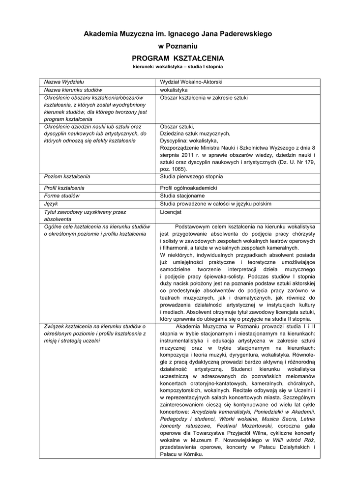 Akademia Muzyczna im. Ignacego Jana Paderewskiego w Poznaniu PROGRAM KSZTAŁCENIA kierunek: wokalistyka – studia I stopnia Nazwa Wydziału Wydział Wokalno-Aktorski Nazwa kierunku studiów Określenie obszaru kształcenia/obszarów kształcenia, z których został wyodrębniony kierunek studiów, dla którego tworzony jest program kształcenia Określenie dziedzin nauki lub sztuki oraz dyscyplin naukowych lub artystycznych, do których odnoszą się efekty kształcenia wokalistyka Obszar kształcenia w zakresie sztuki Poziom kształcenia Obszar sztuki, Dziedzina sztuk muzycznych, Dyscyplina: wokalistyka, Rozporządzenie Ministra Nauki i Szkolnictwa Wyższego z dnia 8 sierpnia 2011 r. w sprawie obszarów wiedzy, dziedzin nauki i sztuki oraz dyscyplin naukowych i artystycznych (Dz. U. Nr 179, poz. 1065). Studia pierwszego stopnia Profil kształcenia Forma studiów Język Profil ogólnoakademicki Studia stacjonarne Studia prowadzone w całości w języku polskim Tytuł zawodowy uzyskiwany przez absolwenta Ogólne cele kształcenia na kierunku studiów o określonym poziomie i profilu kształcenia Licencjat Związek kształcenia na kierunku studiów o określonym poziomie i profilu kształcenia z misją i strategią uczelni Podstawowym celem kształcenia na kierunku wokalistyka jest przygotowanie absolwenta do podjęcia pracy chórzysty i solisty w zawodowych zespołach wokalnych teatrów operowych i filharmonii, a także w wokalnych zespołach kameralnych. W niektórych, indywidualnych przypadkach absolwent posiada już umiejętności praktyczne i teoretyczne umożliwiające samodzielne tworzenie interpretacji dzieła muzycznego i podjęcie pracy śpiewaka-solisty. Podczas studiów I stopnia duży nacisk położony jest na poznanie podstaw sztuki aktorskiej co predestynuje absolwentów do podjęcia pracy zarówno w teatrach muzycznych, jak i dramatycznych, jak również do prowadzenia działalności artystycznej w instytucjach kultury i mediach. Absolwent otrzymuje tytuł zawodowy licencjata sztuki, który uprawnia do ubiegania się o przyjęcie na studia II stopnia. Akademia Muzyczna w Poznaniu prowadzi studia I i II stopnia w trybie stacjonarnym i niestacjonarnym na kierunkach: instrumentalistyka i edukacja artystyczna w zakresie sztuki muzycznej oraz w trybie stacjonarnym na kierunkach: kompozycja i teoria muzyki, dyrygentura, wokalistyka. Równolegle z pracą dydaktyczną prowadzi bardzo aktywną i różnorodną działalność artystyczną. Studenci kierunku wokalistyka uczestniczą w adresowanych do poznańskich melomanów koncertach oratoryjno-kantatowych, kameralnych, chóralnych, kompozytorskich, wokalnych. Recitale odbywają się w Uczelni i w reprezentacyjnych salach koncertowych miasta. Szczególnym zainteresowaniem cieszą się kontynuowane od wielu lat cykle koncertowe: Arcydzieła kameralistyki, Poniedziałki w Akademii, Pedagodzy i studenci, Wtorki wokalne, Musica Sacra, Letnie koncerty ratuszowe, Festiwal Mozartowski, coroczna gala operowa dla Towarzystwa Przyjaciół Wilna, cykliczne koncerty wokalne w Muzeum F. Nowowiejskiego w Willi wśród Róż, przedstawienia operowe, koncerty w Pałacu Działyńskich i Pałacu w Kórniku. Różnice w stosunku do innych programów o podobnie zdefiniowanych celach i efektach kształcenia prowadzonych na uczelni Możliwości zatrudnienia Jedną z najważniejszych sfer aktywności Akademii Muzycznej im. I. J. Paderewskiego stanowi współpraca międzynarodowa, a formy kontaktów z zagranicą mają charakter wielokierunkowy i komplementarny. Umożliwiają one wymianę artystyczną, naukową oraz pedagogiczną pracowników i studentów w oparciu o umowy dwustronne pomiędzy uczelniami. Realizując umowę zawartą z Agencją Narodową FRSE z siedzibą w Warszawie, Akademia Muzyczna im. I. J. Paderewskiego umożliwia wymianę pracowników oraz studentów z uczelniami partnerskimi w Europie w ramach programu Erasmus. Współpraca artystyczna, naukowa i dydaktyczna na kierunku wokalistyka realizowana jest w takich formach działania, jak: – występy gościnne (w Poznaniu) pedagogów, studentów i zespołów muzycznych z uczelni zagranicznych; – koncerty pedagogów, studentów i zespołów muzycznych za granicą; – wyjazdy studentów do uczelni zagranicznych w celu realizowania programu edukacyjnego; – przyjmowanie studentów z uczelni zagranicznych na studia w poznańskiej Uczelni; – prowadzenie kursów, klas mistrzowskich, konferencji, seminariów, warsztatów i wykładów Reasumując, pedagodzy i studenci kierunku wokalistyka aktywnie uczestniczą w życiu kulturalnym i naukowym miasta, Wielkopolski i kraju. Prowadzą działalność koncertową i nagraniową oraz badania naukowe. Współpracują z licznymi uczelniami zagranicznymi. O randze oraz prestiżu kierunku świadczą laury studentów i absolwentów na konkursach krajowych i zagranicznych oraz zaproszenia pedagogów do prowadzenia kursów mistrzowskich oraz prac jury międzynarodowych konkursów wokalnych. Kierunek wokalistyka zorientowany jest na wykształcenie profesjonalnego śpiewaka - solisty i aktora scen muzycznych. Z tego założenia wynikają różnice w stosunku do innych kierunków prowadzonych w Akademii Muzycznej w Poznaniu. Jest to jedyny kierunek na uczelni, na którym oprócz predyspozycji ogólnomuzycznych rozwijanych podczas studiów, główny nacisk położony jest na kształtowanie naturalnego, własnego instrumentarium jakim jest głos ludzki, zarówno jeśli chodzi o jego strukturę i budowę, jak i umiejętności techniczne. Kształtowanie osobowości artystycznej śpiewaka jest również bardzo zindywidualizowane i znacznie odbiega od innych kierunków prowadzonych na uczelni m.in. poprzez konieczność rozwijania predyspozycji aktorskich i kształtowanie świadomości ciała. Różnice w stosunku do innych kierunków zauważalne są również w związku z koniecznością praktycznej umiejętności czytania nut głosem i rozwijaniem słuchu harmonicz