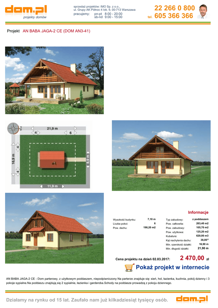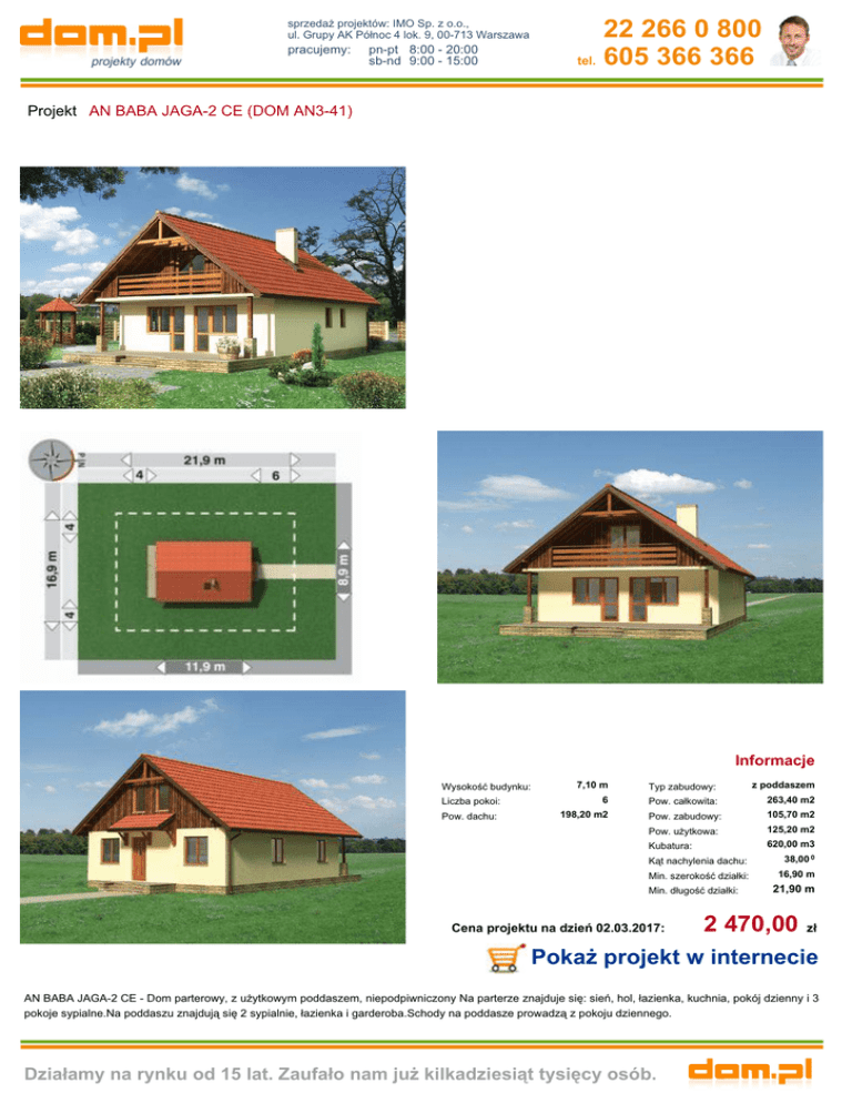 sprzedaż projektów: IMO Sp. z o.o., ul. Grupy AK Północ 4 lok. 9, 00-713 Warszawa pracujemy: pn-pt 8:00 - 20:00 sb-nd 9:00 - 15:00 22 266 0 800 tel. 605 366 366 Projekt AN BABA JAGA-2 CE (DOM AN3-41) Informacje Wysokość budynku: Liczba pokoi: Pow. dachu: 7,10 m Typ zabudowy: z poddaszem 6 Pow. całkowita: 263,40 m2 Pow. zabudowy: 105,70 m2 Pow. użytkowa: 125,20 m2 Kubatura: 620,00 m3 198,20 m2 Kąt nachylenia dachu: 38,00 0 Min. szerokość działki: 16,90 m Min. długość działki: Cena projektu na dzień 02.03.2017: 21,90 m 2 470,00 zł Pokaż projekt w internecie AN BABA JAGA-2 CE - Dom parterowy, z użytkowym poddaszem, niepodpiwniczony Na parterze znajduje się: sień, hol, łazienka, kuchnia, pokój dzienny i 3 pokoje sypialne.Na poddaszu znajdują się 2 sypialnie, łazienka i garderoba.Schody na poddasze prowadzą z pokoju dziennego. Działamy na rynku od 15 lat. Zaufało nam już kilkadziesiąt tysięcy osób.