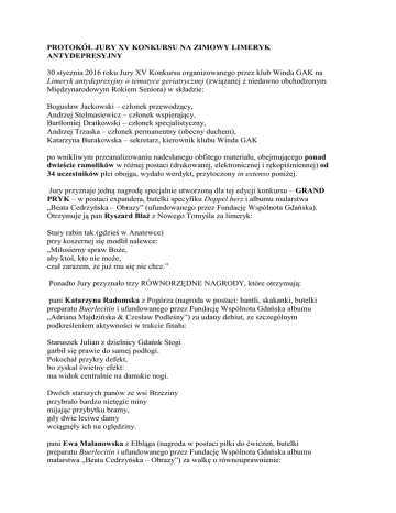 PROTOKÓŁ JURY XV KONKURSU NA ZIMOWY LIMERYK ANTYDEPRESYJNY 30 stycznia 2016 roku Jury XV Konkursu organizowanego przez klub Winda GAK na Limeryk antydepresyjny o tematyce geriatrycznej (związanej z niedawno obchodzonym Międzynarodowym Rokiem Seniora) w składzie: Bogusław Jackowski – członek przewodzący, Andrzej Stelmasiewicz – członek wspierający, Bartłomiej Dratkowski – członek specjalistyczny, Andrzej Trzaska – członek permanentny (obecny duchem), Katarzyna Burakowska – sekretarz, kierownik klubu Winda GAK po wnikliwym przeanalizowaniu nadesłanego obfitego materiału, obejmującego ponad dwieście ramolików w różnej postaci (drukowanej, elektronicznej i rękopiśmiennej) od 34 uczestników płci obojga, wydało werdykt, przytoczony in extenso poniżej. Jury przyznaje jedną nagrodę specjalnie utworzoną dla tej edycji konkursu – GRAND PRYK – w postaci expandera, butelki specyfiku Doppel herz i albumu malarstwa „Beata Cedrzyńska – Obrazy” (ufundowanego przez Fundację Wspólnota Gdańska). Otrzymuje ją pan Ryszard Błaż z Nowego Tomyśla za limeryk: Stary rabin tak (gdzieś w Anatewce) przy koszernej się modlił nalewce: „Miłosierny spraw Boże, aby ktoś, kto nie może, czuł zarazem, że już mu się nie chce.” Ponadto Jury przyznało trzy RÓWNORZĘDNE NAGRODY, które otrzymują: pani Katarzyna Radomska z Pogórza (nagroda w postaci: hantli, skakanki, butelki preparatu Buerlecitin i ufundowanego przez Fundację Wspólnota Gdańska albumu „Adriana Majdzińska & Czesław Podleśny”) za udany debiut, ze szczególnym podkreśleniem aktywności w trakcie finału: Staruszek Julian z dzielnicy Gdańsk Stogi garbił się prawie do samej podłogi. Pokochał przykry defekt, bo zyskał świetny efekt: ma widok centralnie na damskie nogi. Dwóch starszych panów ze wsi Brzeziny przybrało bardzo nietęgie miny mijając przybytku bramy, gdy dwie leciwe damy wciągnęły ich na oględziny. pani Ewa Malanowska z Elbląga (nagroda w postaci piłki do ćwiczeń, butelki preparatu Buerlecitin i ufundowanego przez Fundację Wspólnota Gdańska albumu malarstwa „Beata Cedrzyńska – Obrazy”) za walkę o równouprawnienie: Emerytki z miejscowości Śniadów z transparentem do Sejmu dziś jadą: „Stare Babki znikają z mapy naszego kraju – zlikwidujmy więc też starych dziadów!” pan Zbigniew Witosławski z Gorzowa Wielkopolskiego (nagroda w postaci jak wyżej) za walory edukacyjne i zaszczycenienie finału obecnością: Pewien staruszek z Astrachania w przerębel skakał bez wahania, bo w zimnym mu ciało nareszcie twardniało i Wiera mówiła: „Aleś ty jest, Wania!” Starszy pan w uroczysku Pod Działem* mimo mrozu zachwycił się ciałem oraz duszą kobiety. I co dalej? Niestety, nie opowiem, bo zapomniałem. *Pod Działem – uroczysko w gminie Krzywcza w powiecie przemyskim (N49o49'42", E22o34'45"). Po długim namyśle Jury przyznało 2 (słownie dwie) NAGRODY SPECJALNE, które otrzymują: pani Magdalena Basta z przyzwyczajenia, bez podania przyczyn, ale z podaniem przykładów: Chwat-emeryt, co w mieście żył Rawa, silnych podniet z paniami doznawał. Gdy czarował raz Stenię, rymnął nagle na ziemię i dziś nie wie: miał orgazm, czy zawał? Starej daty Indiance z Teksasu chrupło w nodze, gdy szła do szałasu. Potem tuż na polanie posłyszała mlaskanie... A to nadgryzł ją właśnie ząb czasu. oraz pan Piotr Piela za zidentyfikowanie nowej formy poetyckiej i nadanie jej niezwykle trafnej i adekwatnej nazwy RAMOLIKI. Po jeszcze dłuższym namyśle Jury postanowiło przyznać 11 (słownie jedenaście) WYRÓŻNIEŃ i nagrodzić wyróżnionych autorów sprzętem sportowym (do wyboru: skakanka lub hantle) lub ufundowaną przez Fundację Wspólnota Gdańska książką. Wyróżnienia otrzymują (w porządku niealfabetycznym): pan Adam Gwara z Hornówka bez podania przyczyn, za to z podaniem limeryku: Rosą wonną pan Jan pod Jabłonną zjechał konno i wziął ją bezbronną. Panna Anna mu skłonna, ma sto wiosen. Czy on na miłość Anny jest gotów dozgonną? pani Zofia Nowacka-Wilczek z Lublina za użycie gwary i propagowanie folkloru i higieny tradycyjnej: Zalotnie doniósł dziadek w Swarzędzu, że go „przydatki coś cięgiem swendzu”. Sąsiadka na to, że „rzyć trza bardzo dokładnie myć: – niech włażu w baliu i już nie glendzu!” pan Mirek Mularski za upór i wierność, z podaniem wybranego bez podania przyczyn limeryku: W kurorcie Ciechocinku po ulubionym drinku starsza pani na bani nago biega po rynku. pan Bogdan Malach za wierność, z podaniem limeryku homonimowego: Pewien wdowiec, repatriant zza Buga, do dziewczyny znacząco zamrugał – chociaż chodzi o lasce, ciągle marzy o lasce, może w końcu mu któraś wystruga... pan Bogdan Krajewski za wierność i za pamiętanie: Tli się wciąż w dziadku, w mieście Dakota, na sprośne figle dzika ochota. Dybie w sobotę na babci cnotę, jeśli pamięta, że to sobota. pani Bożena Kansy z Krzywiczyny za optymizm optyczny: Babuni Petroneli z Naroku ubywało lat każdego roku. Ciągle młodniała, bo nie wiedziała, że jej lusterko ma wadę wzroku. pan Grzegorz Lewkowicz przypuszczalnie z Trójmiasta za wierność i finanse: Pewien pazerny zgred z Bojanowa, swoje dochody w skarpecie chował. Kiedy umarł – niestety, puste były skarpety, bo z oszczędności dziur nie cerował. pan Eryk Lime też przypuszczalnie z Trójmiasta za zwartość zawartości i niezłomną wierność mimo nieobecności: Dziadek obiadek spożył. Nie dożył... Spadek! pan Artur Kozłowski z Ząbkowic Śląskich za wierność i lokalność nadmorską: Stary szyper (ma dom w Jelitkowie) gdy chuć poczuł to stawał na głowie. W ten sposób osiągał on właściwy i zwrot i pion. Mają głowę ci starzy szyprowie! pan Grzegorz Zarodkiewicz przypuszczalnie stąd za lokalność i donos osobisty: W tczewskim domu starości leciwy generał tak się poczuł niedobrze, że prawie umie