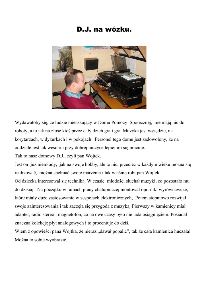 D.J. na wózku. Wydawałoby się, że ludzie mieszkający w Domu Pomocy Społecznej, nie mają nic do roboty, a tu jak na złość ktoś przez cały dzień gra i gra. Muzyka jest wszędzie, na korytarzach, w dyżurkach i w pokojach . Personel tego domu jest zadowolony, że na oddziale jest tak wesoło i przy dobrej muzyce lepiej im się pracuje. Tak to nasz domowy D.J., czyli pan Wojtek. Jest on już niemłody, jak na swoje hobby, ale to nic, przecież w każdym wieku można się realizować, można spełniać swoje marzenia i tak właśnie robi pan Wojtek. Od dziecka interesował się techniką. W czasie młodości słuchał muzyki, co pozostało mu do dzisiaj. Na początku w ramach pracy chałupniczej montował oporniki wyrównawcze, które miały duże zastosowanie w zespołach elektronicznych, Potem stopniowo rozwijał swoje zainteresowania i tak zaczęła się przygoda z muzyką. Pierwszy w kamienicy miał adapter, radio stereo i magnetofon, co na owe czasy było nie lada osiągnięciem. Posiadał znaczną kolekcję płyt analogowych i to procentuje do dziś. Wiem z opowieści pana Wojtka, że nieraz „dawał popalić”, tak że cała kamienica huczała! Można to sobie wyobrazić. Jak już wspomniałem, wszystkie wolne chwile spędzał na słuchaniu muzyki. W taki sposób, po latach ukształtował w sobie muzyczny gust. Teraz wspomina tamte chwile z przyjemnością. Jest pewien, że zostawiły one w nim, zacięcie do muzyki . Dzisiaj mieszka w Domu Pomocy Społecznej, gdzie w dalszym ciągu realizuje swoje pasje . Godzina dziesiąta rano, po śniadaniu, pan Wojtek jedzie do radiowęzła, gdzie prowadzi audycję radiową. Rozbrzmiewa ona w całym Domu. Radiowęzeł dysponuje sporą kolekcją płyt analogowych, należących do pana Wojtka, które wraz z nim przywędrowały do nas. Audycja trwa do godziny dwunastej. Potem obiad, hmmmm… Pan Wojtek bardzo lubi jeść, ponieważ oprócz wrażliwości muzycznej posiada też wrażliwość kulinarną. Popołudniu trzeba się wziąć do pracy, więc jak przystało na D.J-a siada za komputerem i nagrywa różnego rodzaju składanki przebojów, tych starszych i tych nowszych. Możliwości jest mnóstwo. Muzykę nagrywa na płytki lub kompiluje w komputerze i tak do wieczora. Przyznam, że jest to bardzo pracochłonne zajęcie. Trzy dni w tygodniu bierze udział w warsztatach terapii zajęciowej organizowanych przez KLIKĘ, czyli Katolickie Stowarzyszenie Osób Niepełnosprawnych i Ich Przyjaciół. Tam również pracuje na komputerze, po to by dokształcić się i poszerzyć swoją wiedzę komputerową. W przyszłości ma zamiar założyć swoją stronę w internecie. Nie sposób pominąć najważniejszej funkcji naszego D.J-a, którą jest obsługa muzyczna zabaw, organizowanych zarówno przez DPS, jak i przez KLIKĘ. Takie zabawy odbywają się kilka razy w roku. Pan Wojtek starannie się do nich przygotowuje. Są to duże wydarzenie w jego karierze. Gra zarówno z zespołami, które oprawiają muzycznie takie zabawy, jak i solo. Czasem wraca nad samym ranem po nieprzespanej nocy, ale takie są uroki bycia D.J-em. Jak sam mówi to jego pasja, hobby, bez którego nie wyobraża sobie życia. Pasja, która kieruje człowiekiem. Sprawia, że staje się kimś niezwykłym, potrzebnym. Pasja dająca z jednej strony duże zadowolenie, a z drugiej strony męczy. Jak to dobrze, że mamy rozum i wolną wolę, że możemy wybierać, co chcemy zrobić ze swoim życiem. Zapomniał bym zaprosić Państwa na zabawy, które nasz D.J. prowadzi i które nigdy nie mają końca. Serdecznie zapraszam i życzę wszystkim miłej zabawy z D.J. Wojtkiem. Czy ktoś kiedy widział w dawnych latach D.J-a na wózku inwalidzkim? Bo ja nie. A.J.