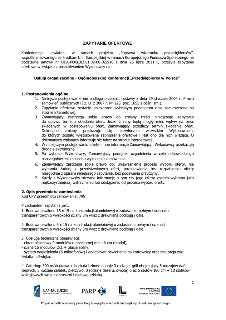 ZAPYTANIE OFERTOWE Konfederacja Lewiatan, w ramach projektu „Poprawa wizerunku przedsiębiorców”, współfinansowanego ze środków Unii Europejskiej w ramach Europejskiego Funduszu Społecznego na podstawie umowy nr UDA-POKL.02.01.02-00-022/10 z dnia 26 lipca 2011 r., przesyła zapytanie ofertowe w związku z poszukiwaniem Wykonawcy na: Usługi organizacyjne - Ogólnopolskiej konferencji „Przedsiębiorcy w Polsce” 1. Postanowienia ogólne 1. Niniejsze postępowanie nie podlega przepisom ustawy z dnia 29 stycznia 2004 r. Prawo zamówień publicznych (Dz. U. z 2007 r. Nr 223, poz. 1655 z późn. zm.). 2. Zapytanie ofertowe zostanie przekazane wybranym podmiotom oraz zamieszczone na stronie internetowej. 3. Zamawiający zastrzega sobie prawo do zmiany treści niniejszego zapytania do upływu terminu składania ofert. Jeżeli zmiany będą mogły mieć wpływ na treść składanych w postępowaniu ofert, Zamawiający przedłuży termin składania ofert. Dokonane zmiany przekazuje się niezwłocznie wszystkim Wykonawcom, do których zostało wystosowane zaproszenie ofertowe i jest ono dla nich wiążące. O dokonanych zmianach informuje się także na stronie internetowej. 4. W niniejszym postępowaniu ofertę i inne informacje Zamawiający i Wykonawcy przekazują drogą elektroniczną. 5. Po wyborze Wykonawcy, Zamawiający podejmie uzgodnienia w celu odpowiedniego uszczegółowienia sposobu wykonania zamówienia. 6. Zamawiający zastrzega sobie prawo do: unieważnienia procesu wyboru oferty, nie wybrania żadnej z przedstawionych ofert, pozostawienia bez rozpatrzenia oferty niezgodnej z opisem niniejszego zapytania, bez podawania przyczyny. 7. Każdy z Wykonawców otrzyma informację o tym czy jego oferta została wybrana jako najkorzystniejsza, wstrzymaniu lub odstąpieniu od procesu wyboru oferty. 2. Opis przedmiotu zamówienia Kod CPV przedmiotu zamówienia: 799 Przedmiotem zapytania jest: 1. Budowa pawilonu 15 x 15 na konstrukcji aluminiowej o zadaszeniu pełnym i ścianach transparentnych o wysokości ściany 3m wraz z drewnianą podłogą i galą. 2. Budowa pawilonu 5 x 15 na konstrukcji aluminiowej o zadaszeniu pełnym i ścianach transparentnych o wysokości ściany 3m wraz z drewnianą podłogą i galą. 3. Obsługa techniczna obejmująca: - ekran plazmowy 9 modułów o przekątnej min 46 cm (modół), - scena 15 modułów 2x1 + obicie sceny, - system nagłośnienia (6 mikrofonów) i dodatkowe oświetlenie na kratownicy oraz realizacja wizji światła i dźwięku. 4. Catering: 300 osób (kawa + herbata i zimne napoje 3 rodzaje, grill obejmujący 5 rodzajów dań ciepłych, 3 rodzaje sałatek, pieczywo, 3 rodzaje deseru, owoce) oraz 5 stołów 180 cm + 10 stolików koktajlowych wraz z obrusami i zastawą szklaną. 1 5. Ochrona 5 osób x 5 godzin. 6. Krzesła składane 300 sztuk. 7. Dokumentacja fotograficzna. 8. Termin konferencji 12 lipca 2013. 3. Ogólny zarys Ogólnopolskiej konferencji „Przedsiębiorcy w Polsce Miejscem konferencji będzie siedziba Konfederacji Lewiatan. Ze względu na dużą frekwencję planujemy wykorzystanie parku wokół siedziby (teren zamknięty) oraz zbudowanie namiotów konferencyjnych. Zorganizowanie konferencji podsumowującej projekt planujemy na 12 lipca 2013 r. Głównym elementem konferencji będzie panel ekspercki, do którego zostaną zaproszeni naukowcy zajmujący się problematyką wizerunku, przedstawiciel PARP oraz przedsiębiorcy i reprezentanci administracji. W wydarzeniu tym weźmie udział min. 300 osób, głównie zaangażowanych w projekt na kolejnych etapach jego realizacji (uczestnicy konsultacji, spotkań i badań, laureaci konkursu, dziennikarze i patroni medialni). 4. WARUNKI UDZIAŁU W POSTĘPOWANIU, KTÓRE MUSZĄ SPEŁNIĆ WYKONAWCY. 4.1 O udzielenie zamówienia mogą ubiegać się Wykonawcy, którzy spełniają łącznie następujące warunki: Formalny: 4.1.1 posiadają doświadczenie w wykonaniu w okresie 3 lat co najmniej 4/czterech usług odpowiadających swoim rodzajem usługom stanowiącym przedmiot zamówienia, tj. polegających na zorganizowaniu 5 konferencji ogólnopolskich, (dla min. 300 osób), w skład których wchodziło zapewnienie nadzoru i koordynacji przebiegu wydarzenia oraz budowa pawilonów i przeprowadzenie obsługi cateringowej. Merytoryczne: 4.1.2 dysponują osobami zdolnymi do wykonania usług będących przedmiotem zamówienia, tj: 4.1.2.1 zapewnienie pełnej obsługi technicznej ogólnopolskiej konferencji „Przedsiębiorcy w Polsce. Sprzętu (w tym zapasowego), tj. min. budowa pawilonów, nagłośnienia, sprzętu multimedialnego (rzutniki, ekrany, sprzęt do odtwarzania prezentacji multimedialnych), mikrofonów przewodowych i bezprzewodowych oraz serwisu technicznego sprzętu w razie awarii sprzętu lub trudności w jego obsłudze; 4.1.2.2 zapewnienie niezbędnej infrastruktury (w tym m.in. krzesła, stoły koktajlowe, zastawa, itd.); 4.1.2.3 zapewnienie personelu w liczbie adekwatnej do zabezpieczenia należytego przebiegu ogólnopolskiej konferencji „Przedsiębiorcy w Polsce; 4.1.2.4 zapewnienie obsługi kelnerskiej podczas ogólnopolskiej konferencji; 4.1.2.5 zorganizowanie i obsługa stanowiska do rejestracji uczestników konferencji; 4.1.3 nie otwarto w stosunku do nich likwidacji oraz nie ogłoszono w stosunku do nich upadłości, z wyjątkiem wykonawców, którzy po ogłoszeniu upadłości zawarli układ zatwierdzony prawomocnym postanowieniem sądu, jeżeli układ nie przewiduje zaspokojenia wierzycieli przez likwidację majątku upadłego; 2 4.2 Wykonawca jest zobowiązany wykazać odpowiednio, nie później niż na dzień składania ofert, że spełnia warunki udziału określone w niniejszym postępowaniu, tj. warunki wskazane w pkt. 4.1.1. - 4.1.3 4.3 Wykonawcy samodzielnie ubiegający się o zamówienie muszą wykazać, że warunki określone w pkt. 4.1.1. - 4.1.3. spełniają samodzielnie, natomiast wykonawcy wspólnie ubiegający się o udzielenie zamówienia warunek określ