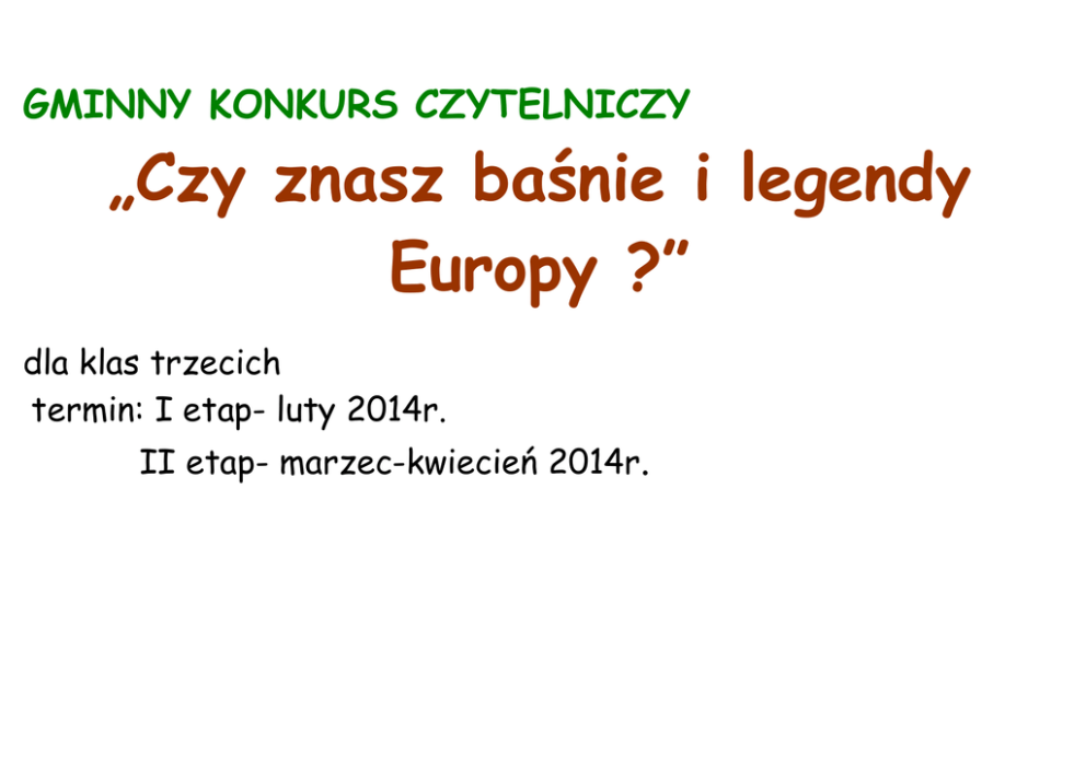 GMINNY KONKURS CZYTELNICZY „Czy znasz baśnie i legendy Europy ?” dla klas trzecich termin: I etap- luty 2014r. II etap- marzec-kwiecień 2014r. BIBLIOTECZNY KONKURS PLASTYCZNY „ Przysłowia mądrością narodu” - zilustruj przysłowie o niebie dla klas czwartych, piątych i szóstych termin: październik 2013r. międzyszkolnych konkursach czytelniczych Udział w organizowanych przez inne szkoły i biblioteki dla klas I – III i IV - VI termin: w ciągu roku szkolnego