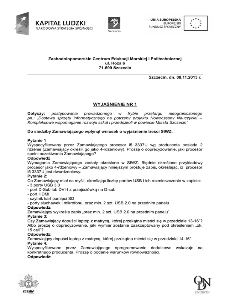 Zachodniopomorskie Centrum Edukacji Morskiej i Politechnicznej ul. Hoża 6 71-699 Szczecin Szczecin, dn. 08.11.2013 r. WYJAŚNIENIE NR 1 Dotyczy: postępowania prowadzonego w trybie przetargu nieograniczonego pn.: „Dostawa sprzętu informatycznego na potrzeby projektu Nowoczesny Nauczyciel – Kompleksowe wspomaganie rozwoju szkół i przedszkoli w powiecie Miasta Szczecin” Do siedziby Zamawiającego wpłynął wniosek o wyjaśnienie treści SIWZ: Pytanie 1 Wyspecyfikowany przez Zamawiającego procesor i5 3337U wg producenta posiada 2 rdzenie (Zamawiający określił go jako 4-rdzeniowy). Proszę o doprecyzowanie, jaki procesor spełni oczekiwania Zamawiającego? Odpowiedź Wymagania Zamawiającego zostały określone w SIWZ. Błędnie określono przykładowy procesor jako 4-rdzeniowy – Zamawiający niniejszym prostuje zapis, określając, iż procesor i5 3337U jest dwurdzeniowy. Pytanie 2: Co Zamawiający miał na myśli, określając liczbę portów USB i ich rozmieszczenie w zapisie: - 3 porty USB 3.0 - port D-Sub lub DVI-I z przejściówką na D-sub - port HDMI - czytnik kart pamięci SD - porty słuchawek i mikrofonu, oraz min. 2 szt. USB 2.0 na przednim panelu Odpowiedź: Zamawiający wykreśla zapis „oraz min. 2 szt. USB 2.0 na przednim panelu” Pytanie 3: Czy Zamawiający dopuści laptop z matrycą, której przekątna mieści się w przedziale 13-16”? Albo proszę o doprecyzowanie, jaki wymiar zostanie zaakceptowany pod określeniem „ok. 15 cali”? Odpowiedź: Zamawiający dopuści laptop z matrycą, której przekątna mieści się w przedziale 14-16” Pytanie 4: Wyspecyfikowane przez Zamawiającego oprogramowanie dodatkowe wskazuje na konkretnego producenta. Proszę o podanie warunków równoważności. Odpowiedź: Oprogramowanie MS Office 2010 lic. EDU lub równoważne (pakiet biurowy musi zawierać wszystkie elementy MS Office 2010 EDU) pozwalające na: • otwieranie dokumentów utworzonych przy pomocy programów MS Word 2010, MS Excel 2010, MS Power Point 2010, MS Access 2010, MS Word 2007, MS Excel 2007, MS Power Point 2007, MS Access 2007, MS Word 2003, MS Excel 2003, MS Power Point 2003, MS Access 2003. W otwieranych dokumentach musi być zachowane oryginalne formatowanie oraz ich treść bez utraty jakichkolwiek ich parametrów i cech użytkowych (korespondencja seryjna, arkusze kalkulacyjne zawierające makra i formularze, bazy danych itp. • Dostarczony program musi zapewniać możliwość modyfikacji plików utworzonych za pomocą ww. programów w taki sposób by możliwe było ich poprawne otworzenie przy pomocy programu, który oryginalnie służył do utworzenia pliku. • Oprogramowanie musi być dostarczone w polskiej wersji językowej • Oprogramowanie musi działać na platformie Windows 7, Windows XP, Windows Vista, Windows 8 W przypadku dostarczenie oprogramowania równoważnego należy zapewnić odpowiednie szkolenie użytkowników i administratorów w siedzibie zamawiającego ponadto na Wykonawcy spoczywa obowiązek udowodnienia zachowania cech określonych powyżej. W przeprowadzonym dowodzie należy odnieść się do norm, parametrów oraz standardów i dokonać porównania z oprogramowaniem wskazanym przez Zamawiającego jako standard. Z porównania musi jednoznacznie wynikać, iż produkt oferowany jako równoważny jest identyczny lub lepszy od produktu wskazanego przez Zamawiającego. Pytanie 5: Czy Zamawiający dopuści laptop o wadze 2,5 kg? Odpowiedź: Zamawiający dopuści laptop o wadze do 2,0 kg wraz z baterią. Pytanie 6: Czy Zamawiający dopuści laptop z pamięcią 4 GB? Odpowiedź: Nie. Uwaga W związku z faktem, iż wprowadzono zmiany do SIWZ, niniejszym dokonuje się zmiany terminu składania i otwarcia ofert na dzień 19 listopada 2013 r. Godziny oraz miejsce składania i otwarcia ofert pozostają bez zmian. Z poważaniem