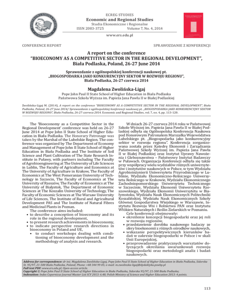 ECREG STUDIES Economic and Regional Studies Studia Ekonomiczne i Regionalne ISSN 2083-3725 Volume 7, No. 4, 2014 www.ers.edu.pl CONFERENCE ORIGINAL ARTICLE REPORT SPRAWOZDANIE ZARTYKUŁ KONFERENCJI A report on the conference “BIOECONOMY AS A COMPETITIVE SECTOR IN THE REGIONAL DEVELOPMENT”, Biała Podlaska, Poland, 26-27 June 2014 Sprawozdanie z ogólnopolskiej konferencji naukowej pt. „BIOGOSPODARKA JAKO KONKURENCYJNY SEKTOR W ROZWOJU REGIONU”, Biała Podlaska, 26-27 czerwca 2014 Magdalena Zwolińska-Ligaj Pope John Paul II State School of Higher Education in Biała Podlaska Państwowa Szkoła Wyższa im. Papieża Jana Pawła II w Białej Podlaskiej Zwolińska-Ligaj M. (2014), A report on the conference “BIOECONOMY AS A COMPETITIVE SECTOR IN THE REGIONAL DEVELOPMENT”, Biała Podlaska, Poland, 26-27 June 2014/ Sprawozdanie z ogólnopolskiej konferencji naukowej pt. „BIOGOSPODARKA JAKO KONKURENCYJNY SEKTOR W ROZWOJU REGIONU”, Biała Podlaska, 26-27 czerwca 2014. Economic and Regional Studies, vol. 7, no. 4, pp. 113-120. The ‘Bioeconomy as a Competitive Sector in the Regional Development’ conference was held on 26-27 June 2014 at Pope John II State School of Higher Education in Biała Podlaska. The Honorary Patronage was taken by the Marshal of the Lubelskie Region. The conference was organized by The Department of Economy and Management of Pope John II State School of Higher Education in Biała Podlaska and The Institute of Soil Science and Plant Cultivation of The State Research Institute in Puławy, with partners including The Faculty of Agrobioengineering at The University of Life Sciences in Lublin, The Faculty of Agriculture and Economics at The University of Agriculture in Krakow, The Faculty of Economics at The West Pomeranian University of Technology in Szczecin, The Faculty of Economics at The University of Rzeszów, The Faculty of Economics at The University of Bialystok, The Department of Economic Sciences at The Koszalin University of Technology, The Faculty of Economic Sciences at The Warsaw University of Life Sciences, The Institute of Rural and Agricultural Development PAS and The Institute of Natural Fibres and Medicinal Plants in Poznan. The conference aims included: • to describe a conception of bioeconomy and its role in the regional development, • to present research achievements in bioeconomy, • to indicate perspective research directions in bioeconomy in Poland and UE, • to conduct workshops dealing with conditioning of bioeconomy development and the methodology of analysis and research. W dniach 26-27 czerwca 2014 roku w Państwowej Szkole Wyższej im. Papieża Jana Pawła II w Białej Podlaskiej odbyła się Ogólnopolska Konferencja Naukowa pod Honorowym Patronatem Marszałka Województwa Lubelskiego pt. „Biogospodarka jako konkurencyjny sektor w rozwoju regionu”. Konferencja zorganizowana została przez Katedrę Ekonomii i Zarządzania Państwowej Szkoły Wyższej im. Papieża Jana Pawła II w Białej Podlaskiej oraz Instytut Uprawy Nawożenia i Gleboznawstwa – Państwowy Instytut Badawczy w Puławach. Organizacja Konferencji odbyła się także przy współpracy wielu wydziałów różnych uniwersytetów i instytutów naukowych w Polsce, w tym Wydziału Agrobioinżynierii Uniwersytetu Przyrodniczego w Lublinie, Wydziału Ekonomiczno-Rolniczego Uniwersytetu Rolniczego w Krakowie, Wydziału Ekonomicznego Zachodniopomorskiego Uniwersytetu Technicznego w Szczecinie, Wydziału Ekonomii Uniwersytetu Rzeszowskiego, Wydziału Ekonomii Uniwersytetu w Białymstoku, Wydziału Nauk Ekonomicznych Politechniki Koszalińskiej, Wydziału Nauk Ekonomicznych Szkoły Głównej Gospodarstwa Wiejskiego w Warszawie, Instytutu Rozwoju Wsi i Rolnictwa PAN oraz Instytutu Włókien Naturalnych i Roślin Zielarskich w Poznaniu. Cele konferencji obejmowały: • określenie koncepcji biogospodarki oraz jej roli w rozwoju regionów, • przedstawienie dorobku naukowego badaczy ze sfery bioekonomii z różnych ośrodków naukowych, • wskazanie perspektywicznych kierunków badań w zakresie biogospodarki w Polsce i w skali Unii Europejskiej, • przeprowadzenie praktycznych warsztatów dotyczących określania uwarunkowań rozwoju biogospodarki oraz metodologii analiz i badań naukowych. Address for correspondence: dr inż. Magdalena Zwolińska-Ligaj, Pope John Paul II State School of Higher Education in Biała Podlaska, Sidorska St. 95/97, 21-500 Biała Podlaska, Poland; Phone: +48 344 99 05; e-mail: [email protected] Full text PDF: www.ers.edu.pl; Open-access article. Copyright © Pope John Paul II State School of Higher Education in Biała Podlaska, Sidorska 95/97, 21-500 Biała Podlaska; Indexation: Index Copernicus Journal Master List ICV 2013: 6.48; Polish Ministry of Science and Higher Education 2013: 4 points. 113 ECREG STUDIES, Vol. 7, No 4, 2014, A report on the conference... Representatives from The Ministry of Agriculture and Rural Development and from various universities and research centers participated in deliberations. The other participants included representatives from The University of Agriculture in Krakow, The Poznań University of Economics, The Poznań University of Life Sciences, The University of Zielona Góra, The Warsaw University of Life Sciences, The West Pomeranian University of Technology in Szczecin, The University of Rzeszów, The Institute of Soil Science and Plant Cultivation of The State Research Institute in Puławy, The Institute of Natural Fibres and Medicinal Plants in Poznan and The Department of Economy and Management of Pope John II State School of Higher Education in Biała Podlaska. Among participants there were also students interested in the presented issues, mainly from economic faculties. The conference was officially opened by prof. Józef Bergier PhD., the President of Pope John II State School of Higher Education in Biała Podlaska. The first session ‘Innovation and Bioeconomy Development Challenges’ b