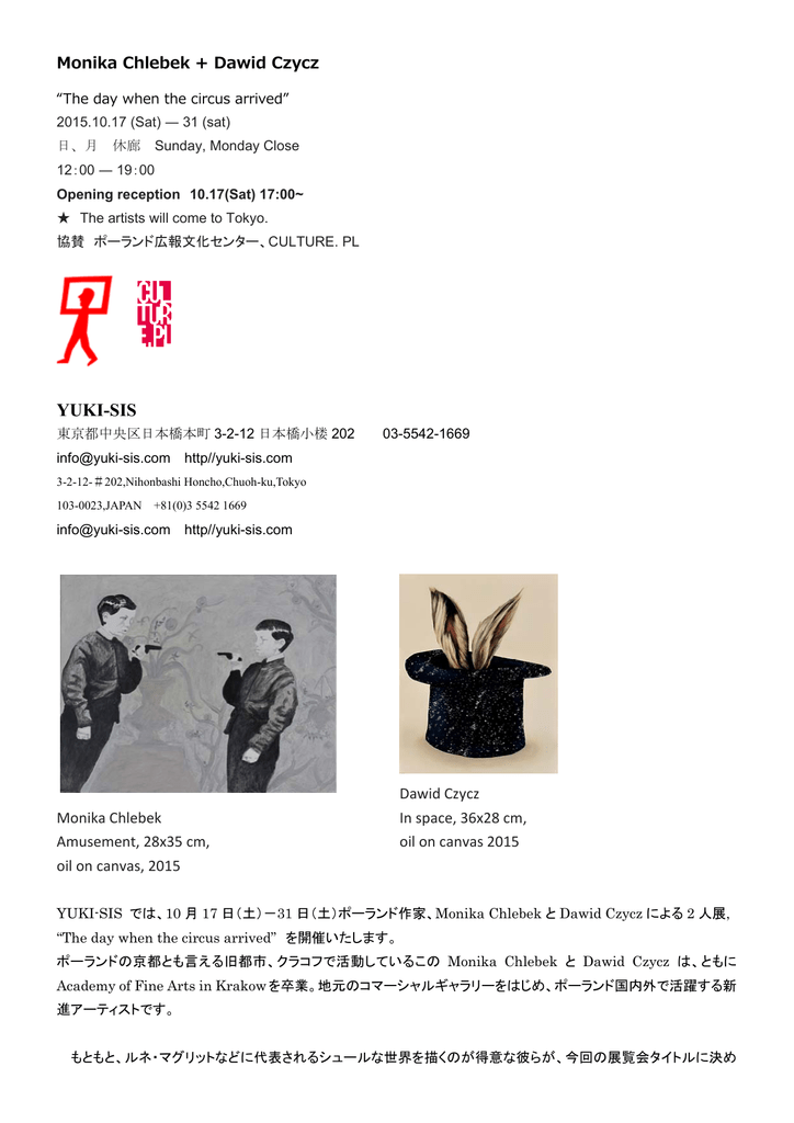 Monika Chlebek + Dawid Czycz “The day when the circus arrived” 2015.10.17 (Sat) ― 31 (sat) 日、月 休廊 Sunday, Monday Close 12:00 ― 19:00 Opening reception 10.17(Sat) 17:00~ ★ The artists will come to Tokyo. 協賛 ポーランド広報文化センター、CULTURE. PL YUKI-SIS 東京都中央区日本橋本町 3-2-12 日本橋小楼 202 [email protected] 03-5542-1669 http//yuki-sis.com 3-2-12-#202,Nihonbashi Honcho,Chuoh-ku,Tokyo 103-0023,JAPAN +81(0)3 5542 1669 [email protected] http//yuki-sis.com Monika Chlebek Amusement, 28x35 cm, oil on canvas, 2015 Dawid Czycz In space, 36x28 cm, oil on canvas 2015 YUKI-SIS では、10 月 17 日(土)-31 日(土)ポーランド作家、Monika Chlebek と Dawid Czycz による 2 人展, “The day when the circus arrived” を開催いたします。 ポーランドの京都とも言える旧都市、クラコフで活動しているこの Monika Chlebek と Dawid Czycz は、ともに Academy of Fine Arts in Krakow を卒業。地元のコマーシャルギャラリーをはじめ、ポーランド国内外で活躍する新 進アーティストです。 もともと、ルネ・マグリットなどに代表されるシュールな世界を描くのが得意な彼らが、今回の展覧会タイトルに決め たのは-The day when the circus arrived -「サーカスがやってきた日」です。 両作家とも油彩、キャンバスを技法に選んでいますが、比較的うす塗りの Monika Chlebek の作風に対して、 Dawid Czycz は技巧的に丁寧な仕上げを好みます。 また、サーカスという同じテーマを用いながらも、2 人がフォーカスする視点は異なります。どこか大真面目で、ユニ ークな彼らの作風は、ポーランドという日本ではまだあまり知られていない東欧の異国のイメージと重なり、私たちに 新しいサーカスの世界を見せてくれることと思います。 彼らの描く、異国のサーカスをぜひ楽しんでいただけたらと思います。 Monika Chlebek Twins, 22x27cm, oil on canvas, 2015 Monika Chlebek Taming, 30x32, oil on canvas, 2015 Monika Chlebek Boon Docks, 29x27cm, oil on canvas, 2015 Monika Chlebek Here, 20x15cm, oil on canvas, 2015 Dawid Czycz Dawid Czycz Black hole, 30x28cm, oil on canvas, 2015 Searching, 28x30cm, oil on canvas, 2015 Dawid Czycz Untitled, 13x10cm, oil on canvas, 2015 Dawid Czycz Untitled, 40x30cm, oil on canvas, 2015 Monika Chlebek Born in 1986, in Krakow, Poland. Was Graduated from the Academy of Fine Arts in Krakow (2011). One of the new Surrealists. She deals with painting, drawing, collage and animation films. Chlebek had been awarded by the Austrian Ministry of Science, Culture and Sport with an artistic residence in Vienna. She also participated in the Tokyo and Osaka Art Fairs as well as in Taipei. In 2012 she won a prize in the Polish Young Art Competition (Legnica). She has participated in more than 20 exhibitions, collective as well as individual, in the country and abroad. The artist lives and works in Kraków. Solo exhibitions: 2014 -“Ball Lightning and Other Tales”, Zderzak Gallery, Krakow, PL 2013 - “No – memorization”, Centre for Contemporary Art Ujazdowski Castle, Warsaw, PL 2011 - “ The Plank Lighter than the Air”, Foundation for Promoting Conemporary Art, Warsaw, PL 2011 - “An Ant Deep in Your Clothes”, Zderzak Gallery, Krakow, PL 2011 - “An Aliance of A White Walls”, Lacznik Gallery, PL 2010 -“Bad Dreams”, Zderzak Gallery, Krakow, PL Group exhibitions: 2013 - “Memory. Registers and Territories”, International Cultural Centre, Krakow, PL 2013 - “Paramalarstwo”, Wizytująca Gallery, Warsaw, PL 2013 - ”41 Painting Biennale Bielska Jesien”, BWA Bielsko Biala, PL 2013 - “Restart”, Yuki – Sis Gallery, Tokyo, JP 2013 - “Perfectionist”, Trzcina Gallery, Warsaw, PL 2013 - “C as Cosmos”, Lacznik Gallery, Krakow, PL 2013 - “New Painting Competition”, BWA, Gorzow Wielkopolski, PL 2013 - “New Painting Competition”, UAP, Poznan, PL 2013 - “Saint Anthony’s Fire”, Lacznik Gallery, Krakow, PL 2012 - „Somnambulant Eve” Wrong Door Gallery, London, UK 2012 - “Id”, Cellar Gallery, Krakow, PL 2012 - “Promotion – painting competioton”, Gallery of Art, Legnica, PL 2012 -“Knowledge of Nature is not a Nature”, Jordan Park, Krakow, PL 2012 - “No Logo”, Zderzak Gallery, Krakow, PL 2012 - “ Amazing stories”, Polanki forest, Gdansk, PL 2012 “Wait! New paintigs in Zderzak gallery collection”, Zderzak Gallery, Krakow, PL 2012 - “Exhibition”, Yuki – Sis Gallery, Tokyo, JP 2012 - “Artist in residence”, Bm:uk, Vienna, AT 2011 - “Blue Velvet – The new Decadents”, Palace in Ryczow, PL 2011 - “About Strange Feelings”, Zderzak Gallery, Krakow, PL 2010 - “Moon Hostel and The Moovies” ODA, Piotrkow Trybunalski, PL 2010 - “Moon Hostel and The Moovies”, Manhatan Gallery, Lodz, PL 2010 - “Mambo Spinoza”, Zderzak Gallery, Krakow, PL 2010 - “Moon Hostel”, Zderzak Gallery, Krakow, PL Other: 2014 - Art Fair in Brussels, Affordable Art Fair, BL 2013 - “41th Biennale Bielska Jesien“, PL 2013 - 11th Art Fair in Warsaw, PL 2013 - Art Fair “Berliner Liste“, Berlin, DEU 2013 - 1th International Painting Competition “Modessque“, Warsaw, PL 2013 - “ New painting”, painting competition, UAP, PL 2012–Charity Auction, Museum of JapaneseArt and Technique PL 2012 - prize in the Polish Young Art Competition (Legnica), PL 2012 - workshops Bmw Art Transformy, National Opera, Warsaw, PL 2012 - Charity Auction, National Museum, Warsaw, PL 2012 - Art Fair “Ultra”, Tokyo, JP 2012 - Art Fair in Taipei, TWN 2012 - Art Fair in Osaka, JP 2012 - Artistic residence in Vienna (Bm:ukk Austrian Ministry of Science, Culture and Sport), AT 2012 - Art Fair in Arezzo, IT Dawid Czycz Education: 2002 – 2006: Jozefa Czapskiego High School of Arts, Cracow, Poland 2006: Ma
