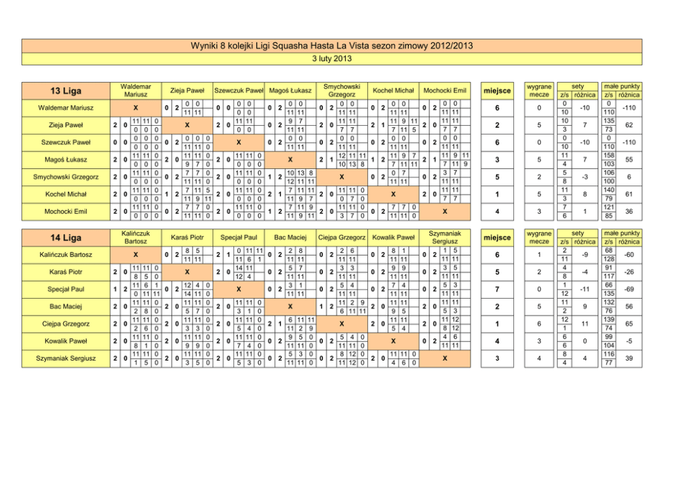 Wyniki 8 kolejki Ligi Squasha Hasta La Vista sezon zimowy 2012/2013 3 luty 2013 13 Liga Waldemar Mariusz Waldemar Mariusz X Zieja Paweł 2 0 Szewczuk Paweł 0 0 Magoś Łukasz 2 0 Smychowski Grzegorz 2 0 Kochel Michał 2 0 Mochocki Emil 2 0 11 0 0 0 11 0 11 0 11 0 11 0 0 11 0 0 0 11 0 11 0 11 0 11 0 14 Liga Kalińczuk Bartosz Kalińczuk Bartosz X Karaś Piotr 2 0 Specjał Paul 1 2 Bac Maciej 2 0 Ciejpa Grzegorz 2 0 Kowalik Paweł 2 0 Szymaniak Sergiusz 2 0 11 8 11 0 11 2 11 2 11 8 11 1 Zieja Paweł 0 0 0 0 0 0 0 0 0 0 0 0 0 2 2 0 0 2 1 2 0 2 0 0 11 11 0 X 2 0 11 11 9 7 11 7 11 7 11 0 11 11 7 7 11 11 9 7 11 0 0 0 0 0 0 5 11 0 0 0 0 1 11 0 0 0 0 0 0 0 0 2 0 2 11 0 11 2 0 0 11 2 0 0 11 2 0 0 2 2 0 2 0 2 0 2 0 2 X 2 4 11 11 7 11 3 11 9 11 5 0 0 11 0 0 0 0 0 11 0 11 0 11 0 11 0 0 11 14 0 12 1 0 11 7 11 0 11 Bac Maciej 11 11 0 6 1 11 0 4 0 X 0 0 11 11 2 0 0 3 1 0 11 11 2 0 0 5 4 0 11 11 2 0 0 7 4 0 11 11 2 0 0 5 3 0 11 9 2 11 0 2 11 2 Smychowski Grzegorz 0 0 0 2 11 11 11 11 2 0 7 7 0 0 0 2 11 11 12 11 11 2 1 10 13 8 0 X 0 0 10 13 8 1 2 X 0 12 11 11 0 7 11 11 11 11 2 1 2 0 0 11 9 7 0 7 0 7 11 9 11 11 1 2 2 0 0 11 9 11 3 7 Specjał Paul 8 5 11 11 12 14 11 5 11 3 11 9 11 3 0 0 11 0 0 0 X Karaś Piotr 0 11 5 6 11 11 8 11 6 11 1 11 5 2 Szewczuk Paweł Magoś Łukasz 0 2 11 5 2 11 3 2 11 2 8 11 7 11 1 11 0 X 0 0 6 11 2 1 0 11 2 0 9 5 0 2 0 11 11 0 5 3 0 2 0 11 11 0 0 0 0 Ciejpa Grzegorz 0 0 0 1 2 11 3 2 11 5 2 11 11 2 6 2 Kochel Michał 0 2 2 1 0 2 1 2 0 2 0 11 11 7 0 11 11 7 0 11 0 11 9 11 0 11 9 11 7 11 0 2 11 2 5 0 0 2 7 2 11 1 0 2 2 0 X 0 2 Mochocki Emil 7 7 0 11 11 0 2 2 2 0 8 11 9 11 7 11 11 9 11 5 1 11 9 11 4 11 11 5 11 4 11 X 2 0 9 0 5 4 0 0 2 X 0 11 11 0 0 8 12 0 11 11 0 0 2 2 0 0 11 12 0 4 6 0 0 11 11 7 0 11 9 11 11 9 7 11 11 7 X Kowalik Paweł 6 0 11 3 0 11 4 0 11 2 9 2 11 11 0 11 11 7 0 11 11 7 3 11 11 7 0 0 0 2 2 0 Szymaniak Sergiusz 1 5 2 11 11 3 5 2 11 11 5 3 2 11 11 11 11 0 5 3 11 12 0 8 12 4 6 2 11 11 X miejsce wygrane mecze 6 0 2 5 6 0 3 5 5 2 1 5 4 3 miejsce wygrane mecze 6 1 5 2 7 0 2 5 1 6 4 3 3 4 sety z/s różnica 0 -10 10 10 7 3 0 -10 10 11 7 4 5 -3 8 11 8 3 7 1 6 małe punkty z/s różnica 0 -110 110 135 62 73 0 -110 110 158 55 103 106 6 100 140 61 79 121 36 85 sety z/s różnica 2 -9 11 4 -4 8 1 -11 12 11 9 2 12 11 1 6 0 6 8 4 4 małe punkty z/s różnica 68 -60 128 91 -26 117 66 -69 135 132 56 76 139 65 74 99 -5 104 116 39 77