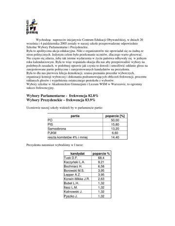 Wychodząc naprzeciw inicjatywie Centrum Edukacji Obywatelskiej, w dniach 20 września i 4 października 2005 zostały w naszej szkole przeprowadzone odpowiednio Szkolne Wybory Parlamentarne i Prezydenckie. Była to apolityczna akcja edukacyjna. Nikt z organizatorów nie opowiadał się za żadną ze stron politycznych. Jedynym celem było przekonanie uczniów, dlaczego warto głosować. Nie często się zdarza, żeby tak istotne wydarzenia w życiu państwa odbywały się w jednym roku kalendarzowym. Była to więc wspaniała okazja dla nas aby przeprowadzić wybory na podobnych zasadach, w podobnej oprawie jak czynia to dorosli i umożliwić oddanie głosu na zarejestrowane partie polityczne i zarejestrowanych kandydatów na prezydenta. Była to dla nas pierwsza lekcja demokracji, szansa poznania procedur wyborczych, organizacji komisji wyborczej i dokonania podsumowujących obliczeń frekwencji, procentu oddanych głosów i wypełnienia ostatecznego protokołu z wyborów. Wybory szkolne w Akademickim Gimnazjum i Liceum WSM w Warszawie, to ogromny sukces frekwencyjny. Wybory Parlamentarne - frekwencja 82.8% Wybory Prezydenckie – frekwencja 83.9% Uczniowie naszej szkoły widzieli by w parlamencie partie: partia PO PIS Samoobrona PJKM reszta komitetów 4% i mniej poparcie [%] 50,00 15,80 13,20 6,60 14,40 Prezydenta natomiast wybraliśmy w I turze: kandydat poparcie % Tusk D.F. 68,4 Kaczyński L.A. 9,21 Bochniarz H. 6,58 Borowski M.S. 3,95 Lepper A.Z. 3,95 Korwin-Mikke J.R. 2,63 Bubel L.H. 1,32 Ilasz L.M. 1,32 Kalinowski J. 1,32 Pyszko J. 1,32